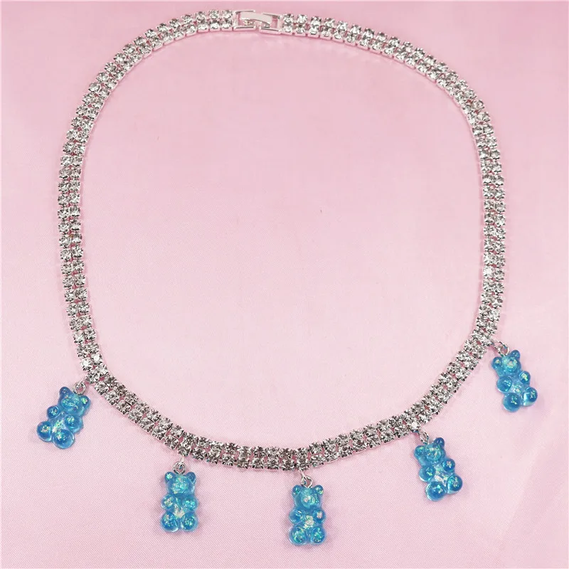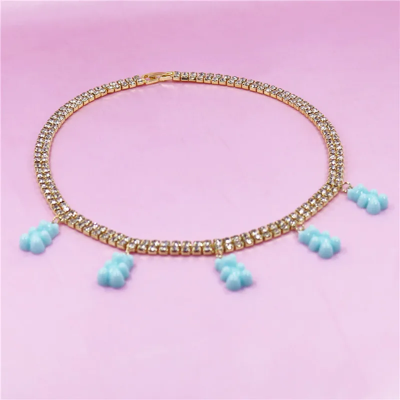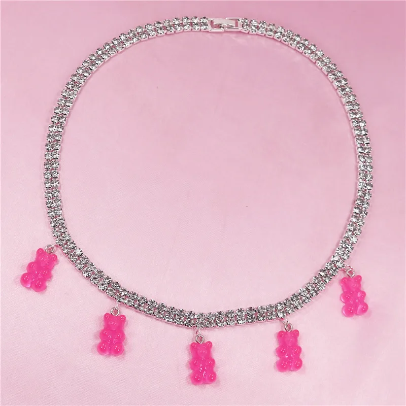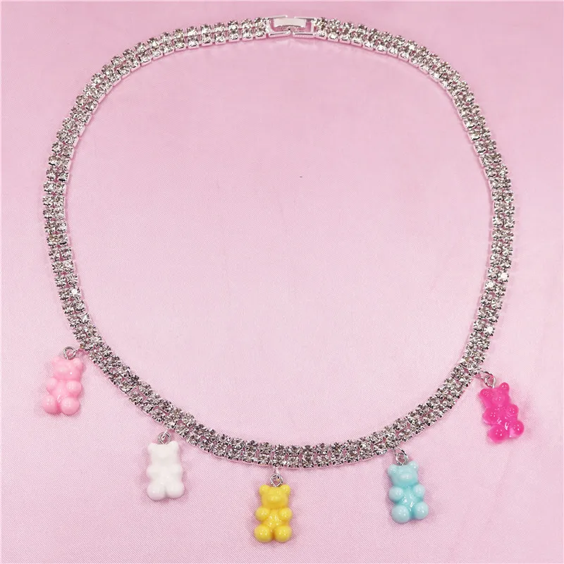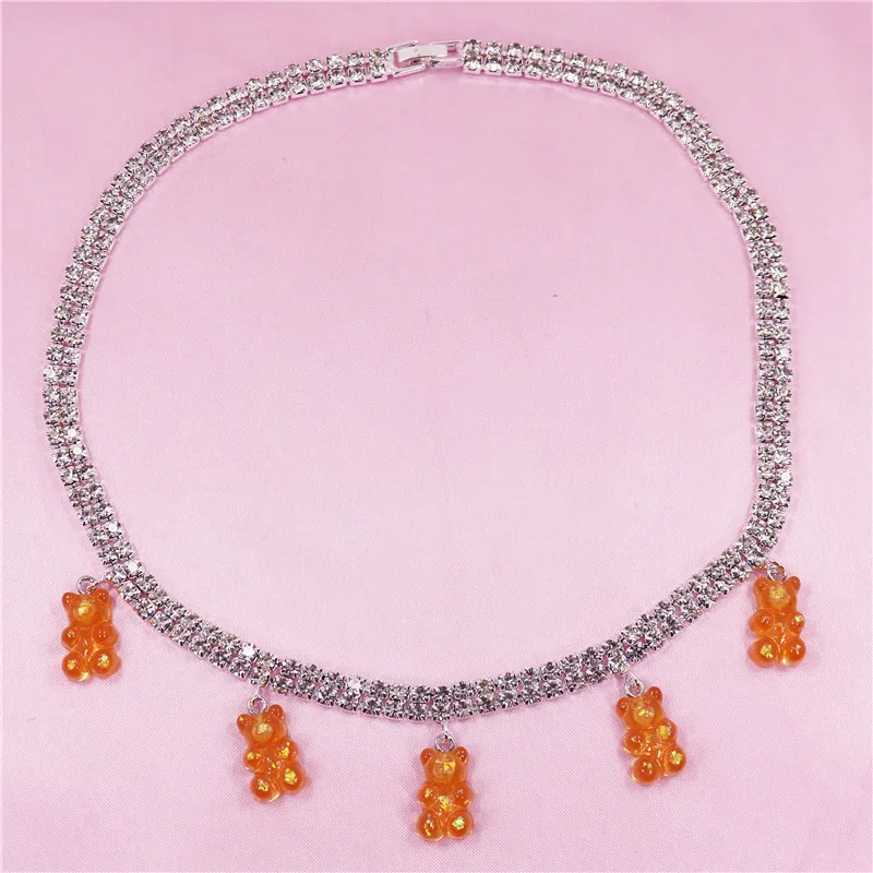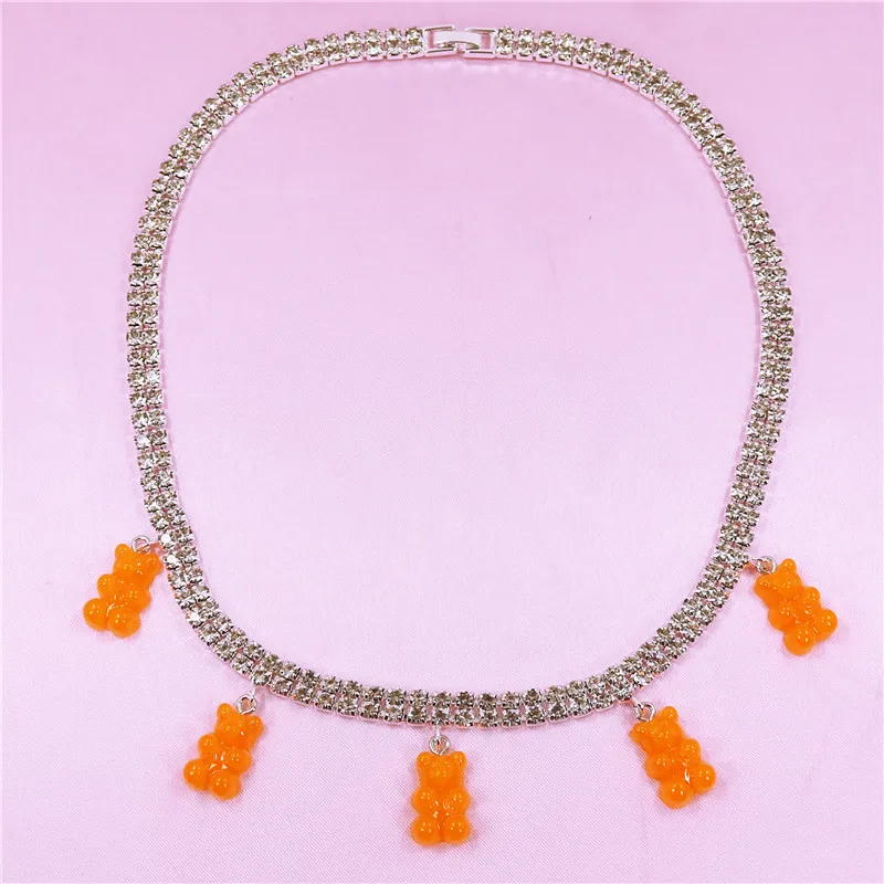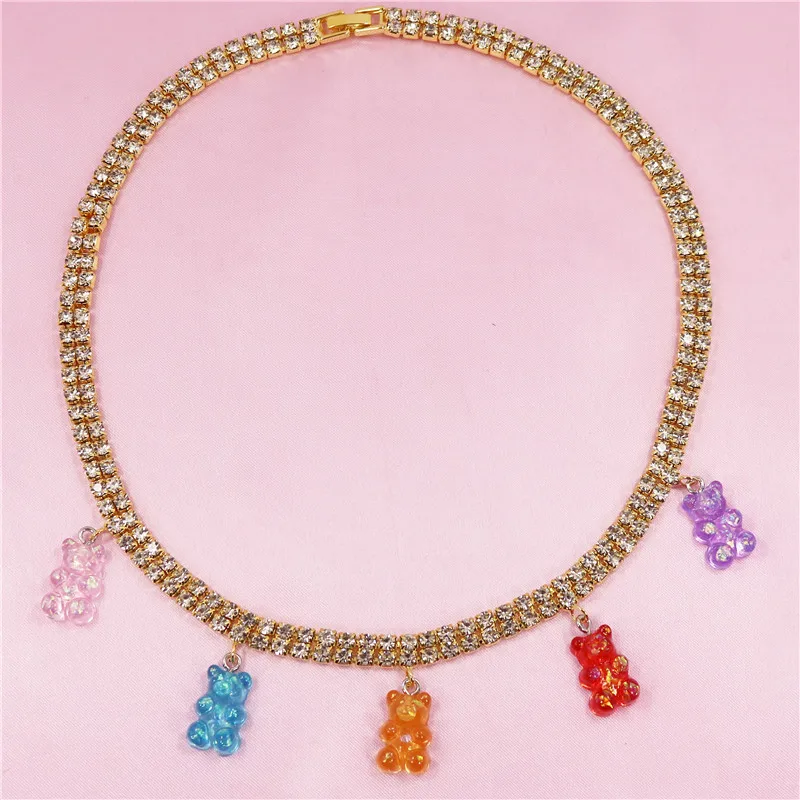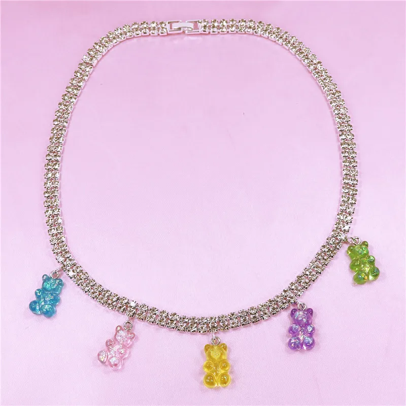 Colorful Rainbow Cute Jelly Bear Gummy Bling Necklaces Pendant for Women Girls Cool Punk Hip Hop Resin Necklaces Accessories