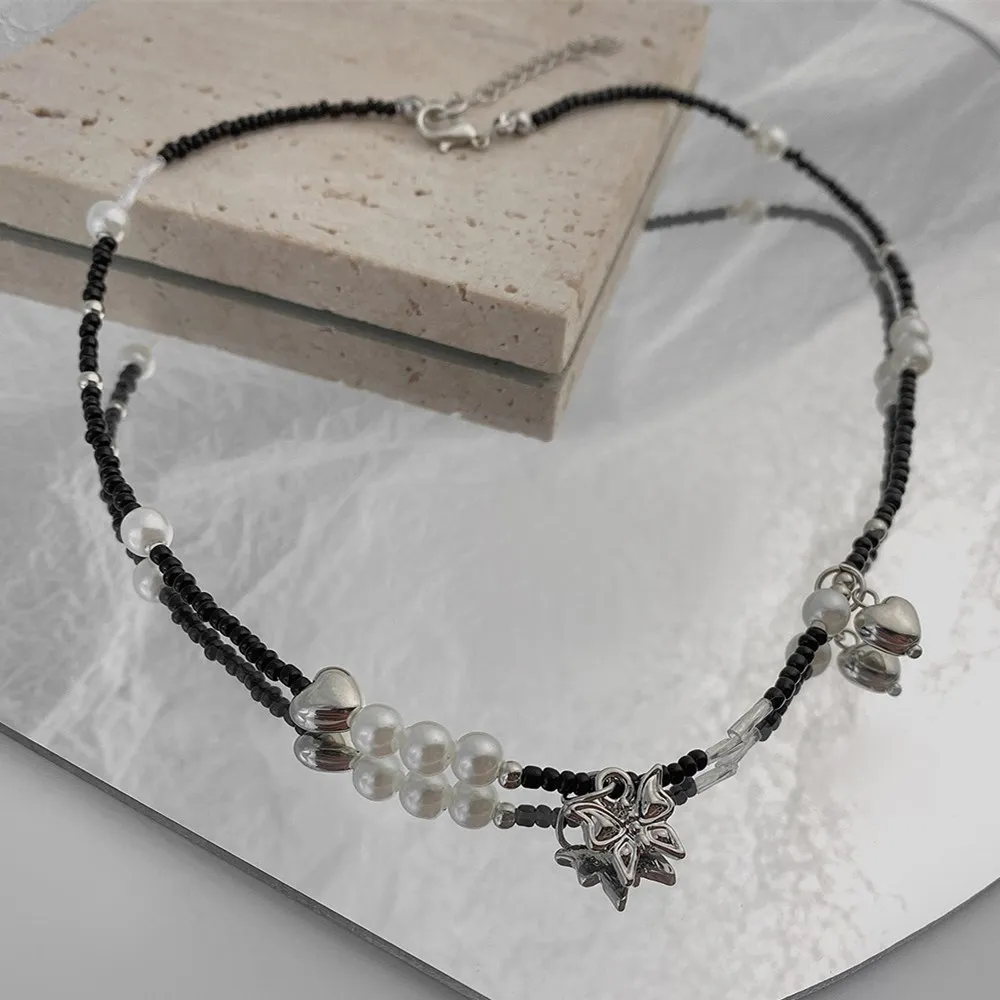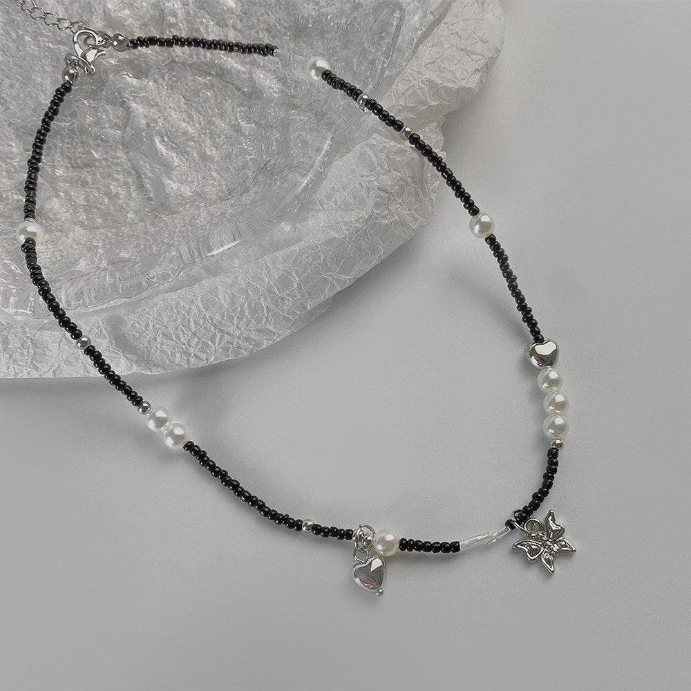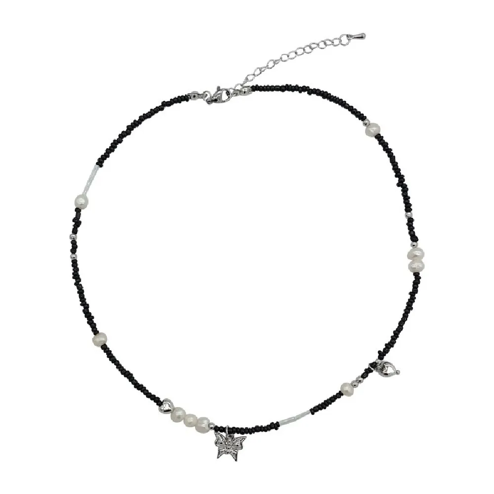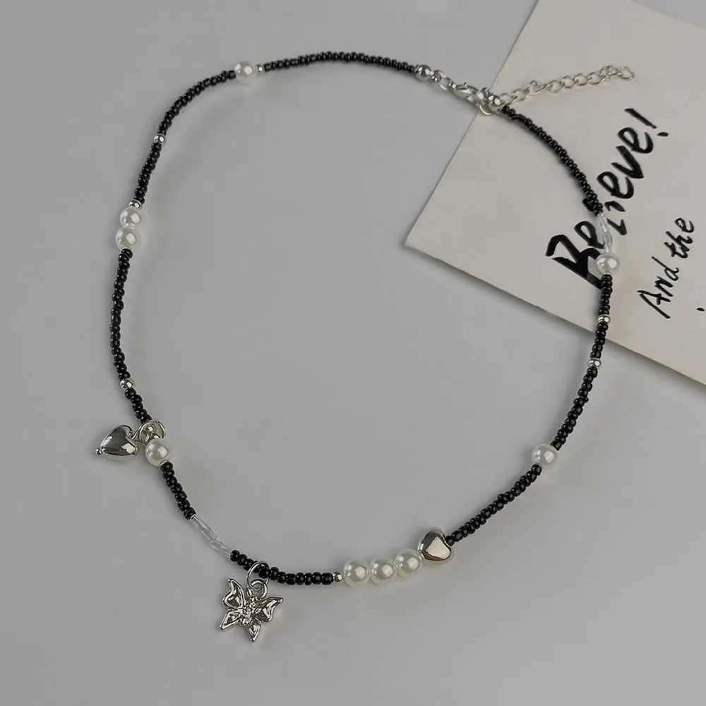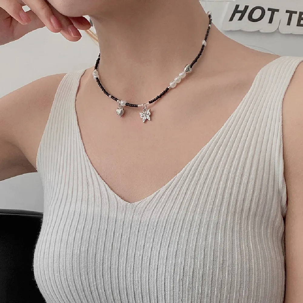Cosysail Simple Pearl Butterfly Pendant Necklace Female Boho Y2K Black Beaded Choker Necklace Clavicle Chain Necklace Jewelry