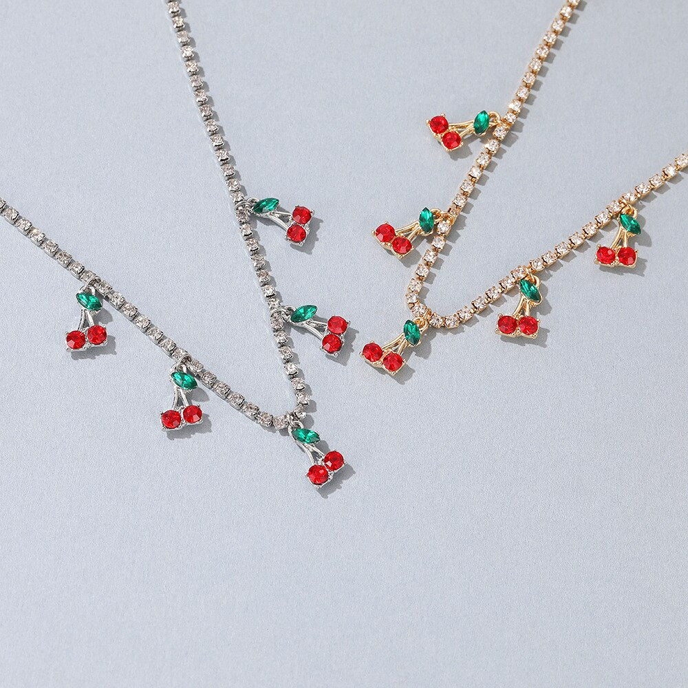 Cross Border Cherry Necklace Hip Hop Tennis Chain Cherry Pendant Collar Small Fresh Row Micro Inlaid with Rhinestone Necklace