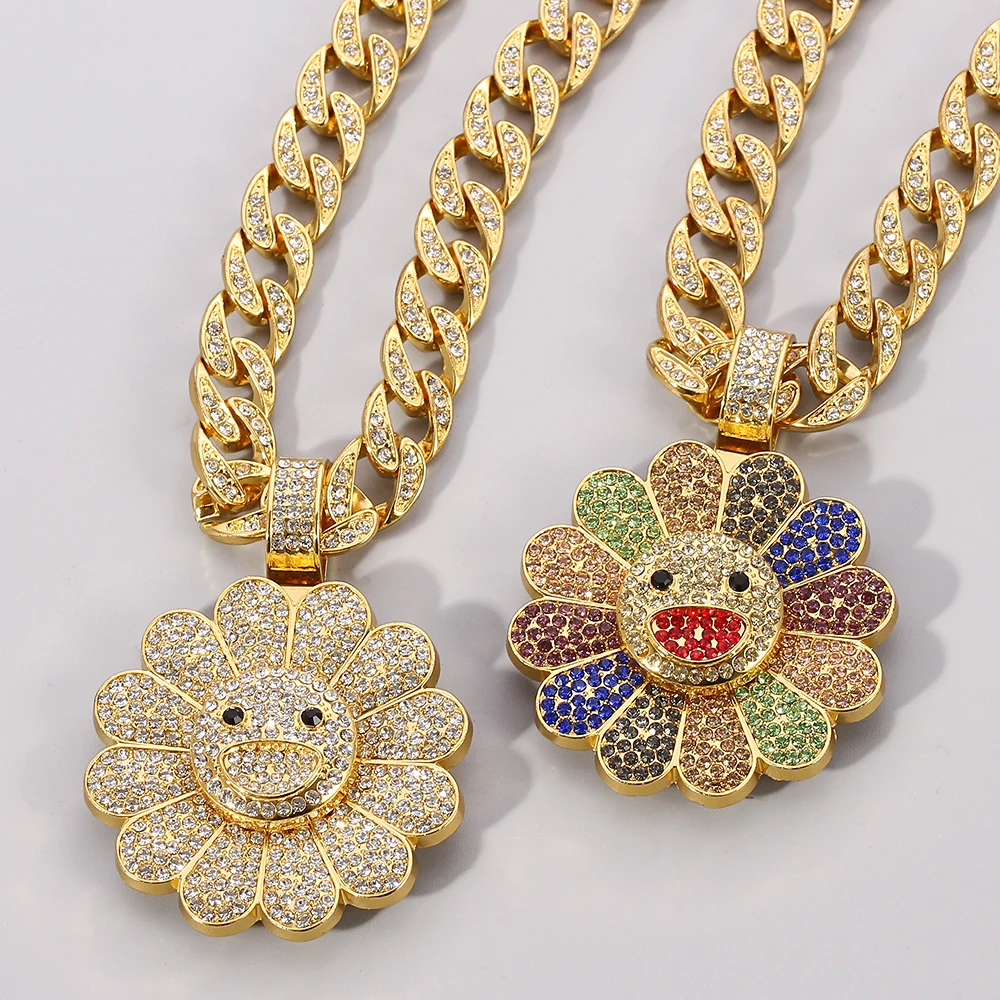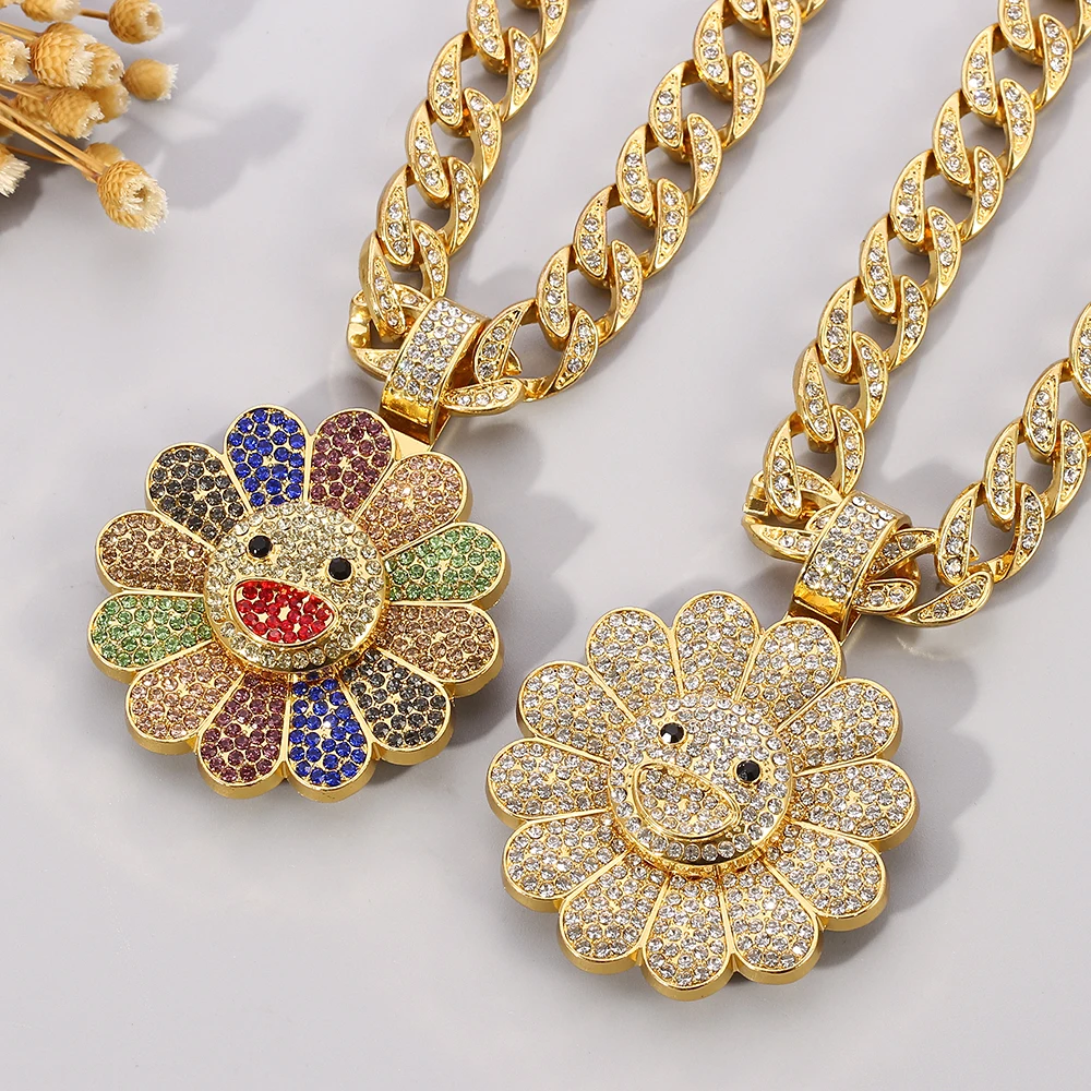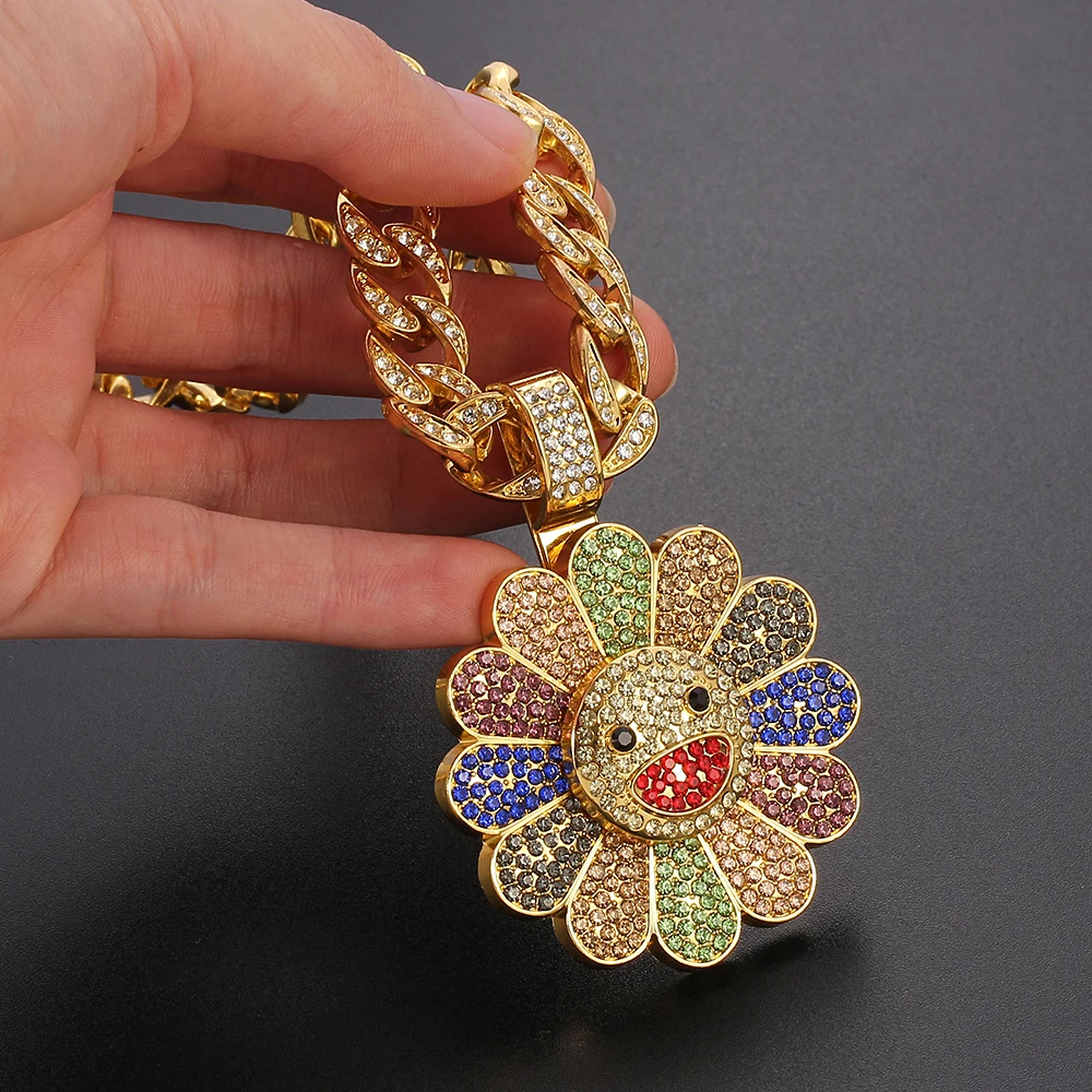 Crystal Hip-hop Sunflower Crystal Can be Rotated Pendant Necklace Rainbow Jewelry Rock Rapper Collar Accessories Gifts