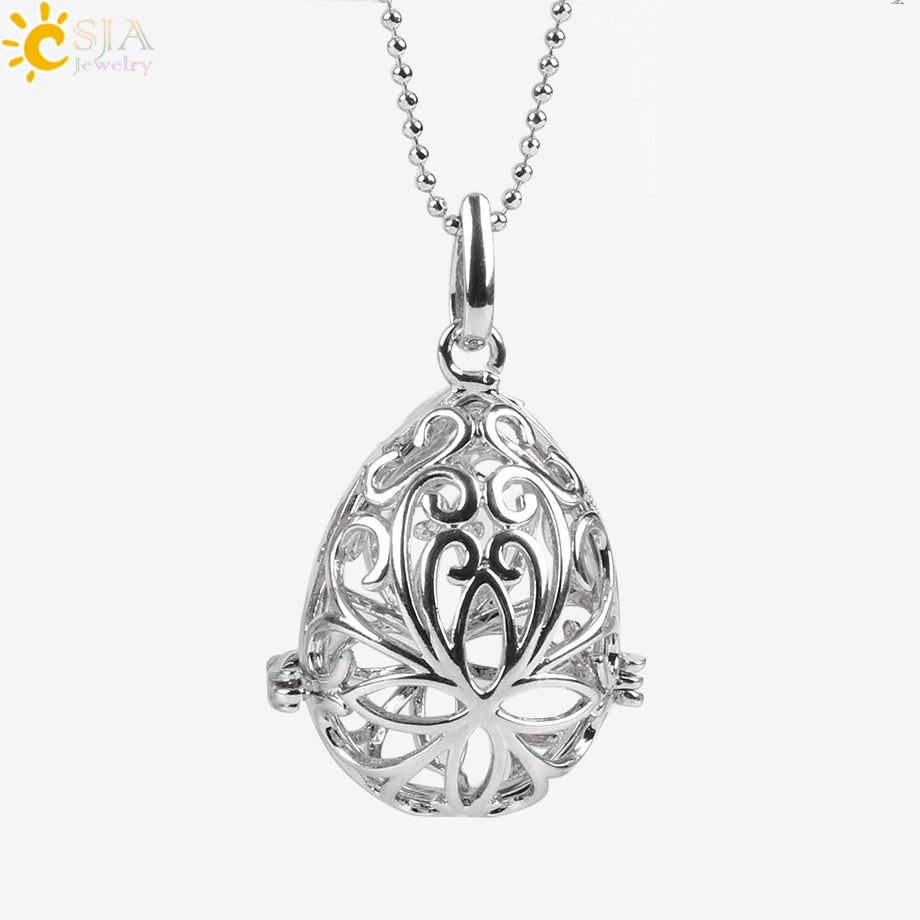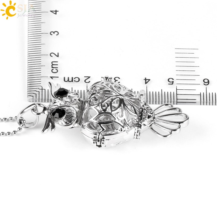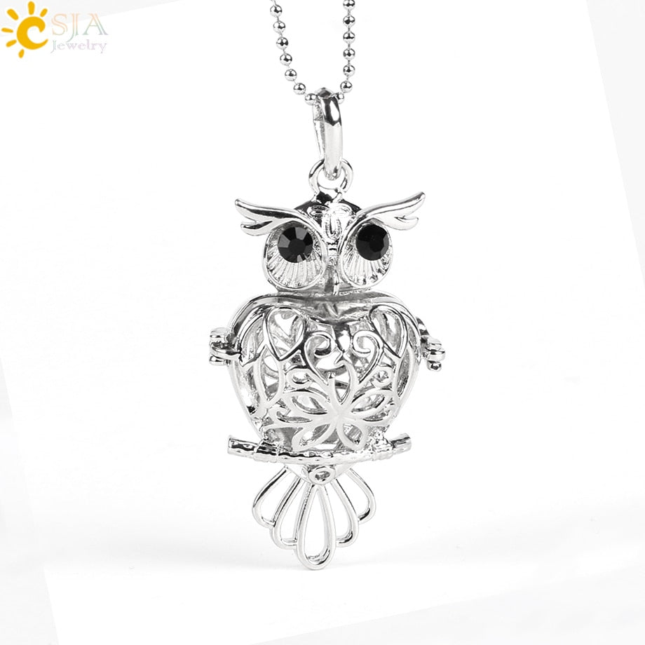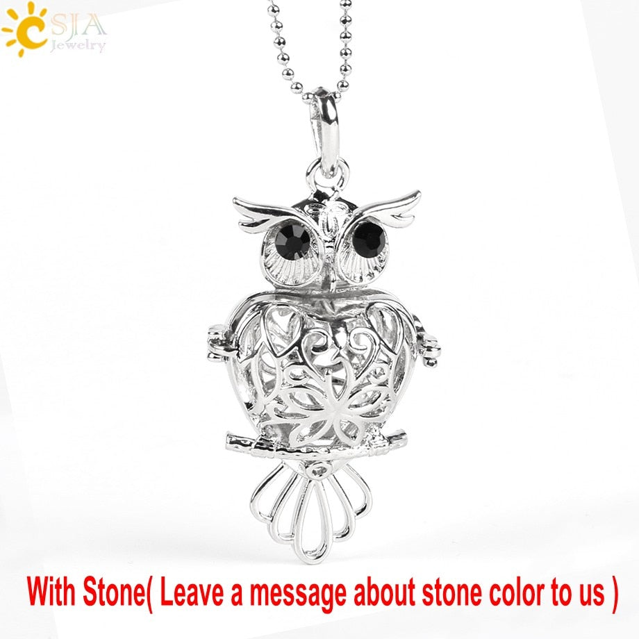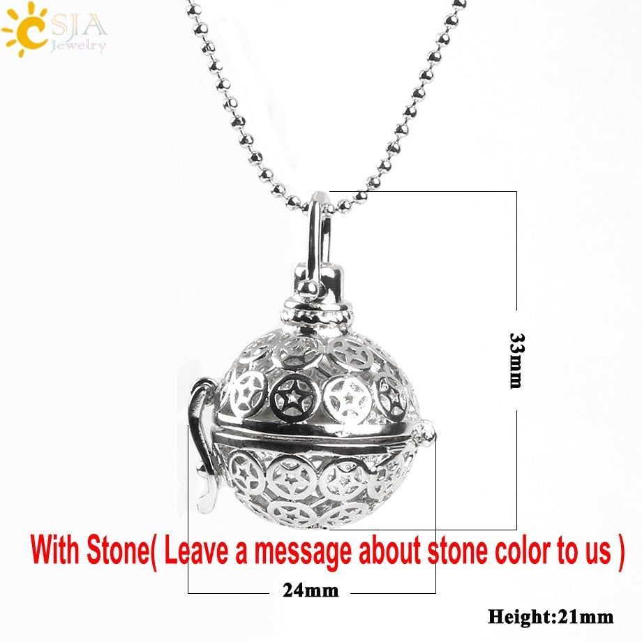 CSJA 26 Natural Stone Beads Hollow Carved Round Ball Egg Owl Bird Wish Bottle Locket Pendant Necklace Women Bijoux Jewelry E503