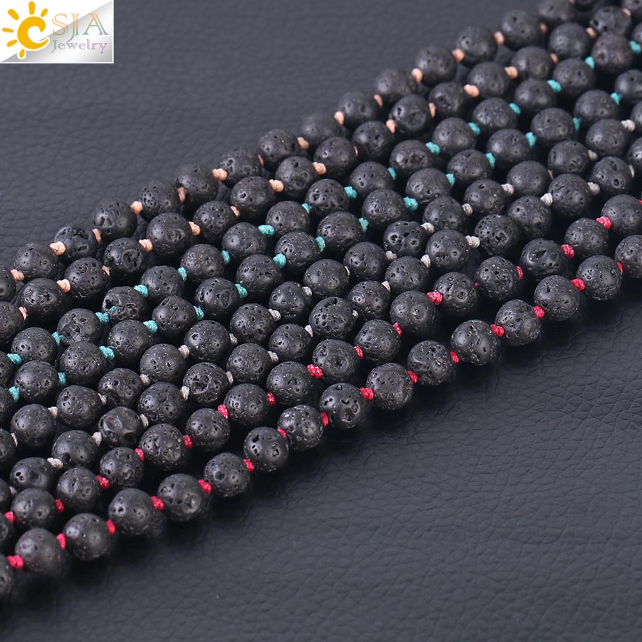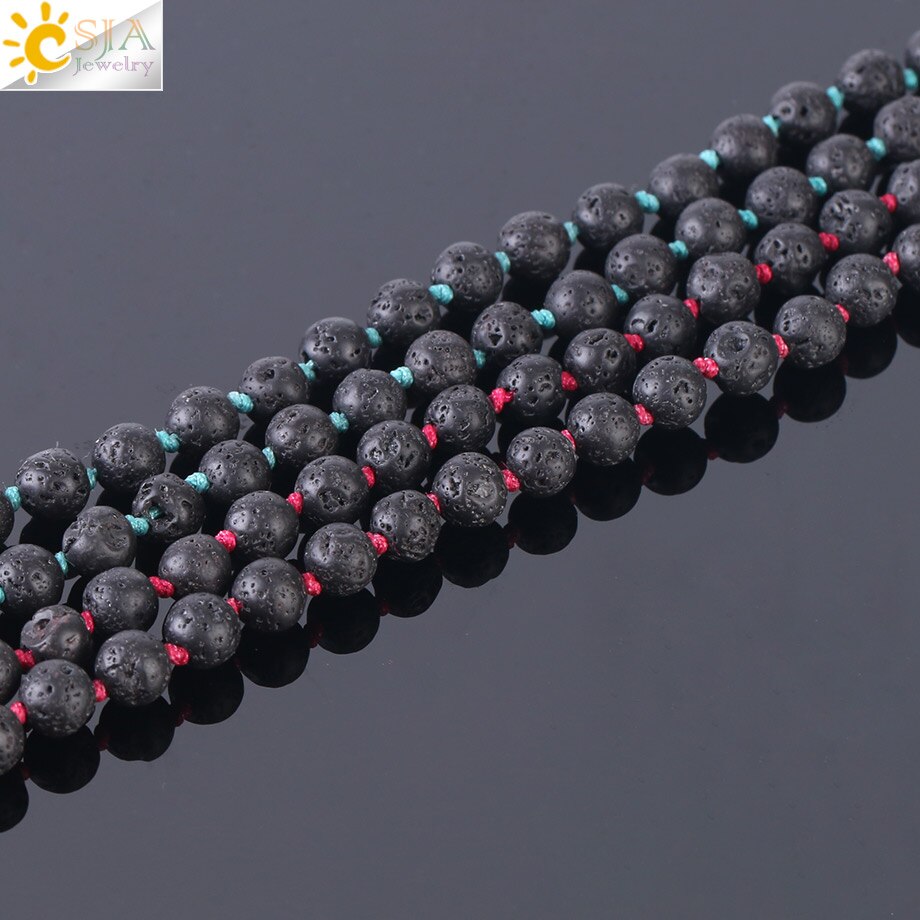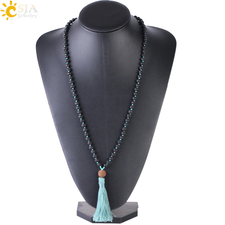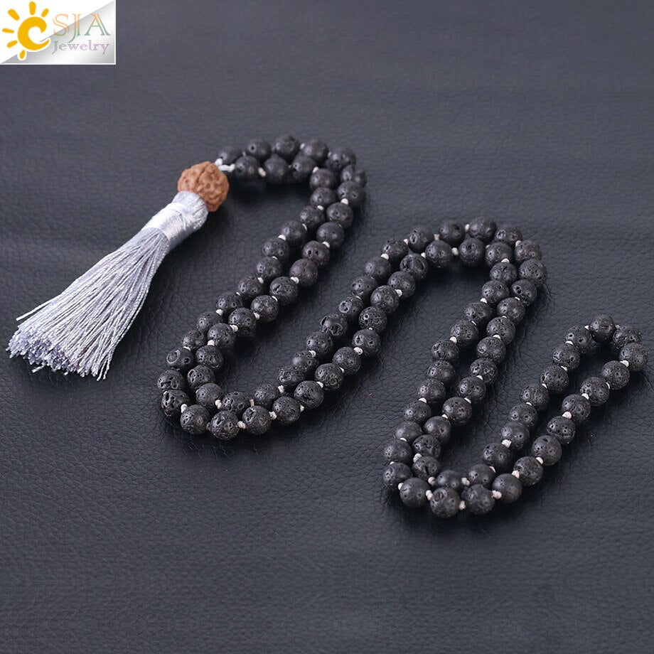 CSJA Natural Lava Rock Necklace 108 Mala Bead 6mm Knotted Long Tassel Necklaces Buddhist Vajra Bodhi Bohemian Style Jewelry F373