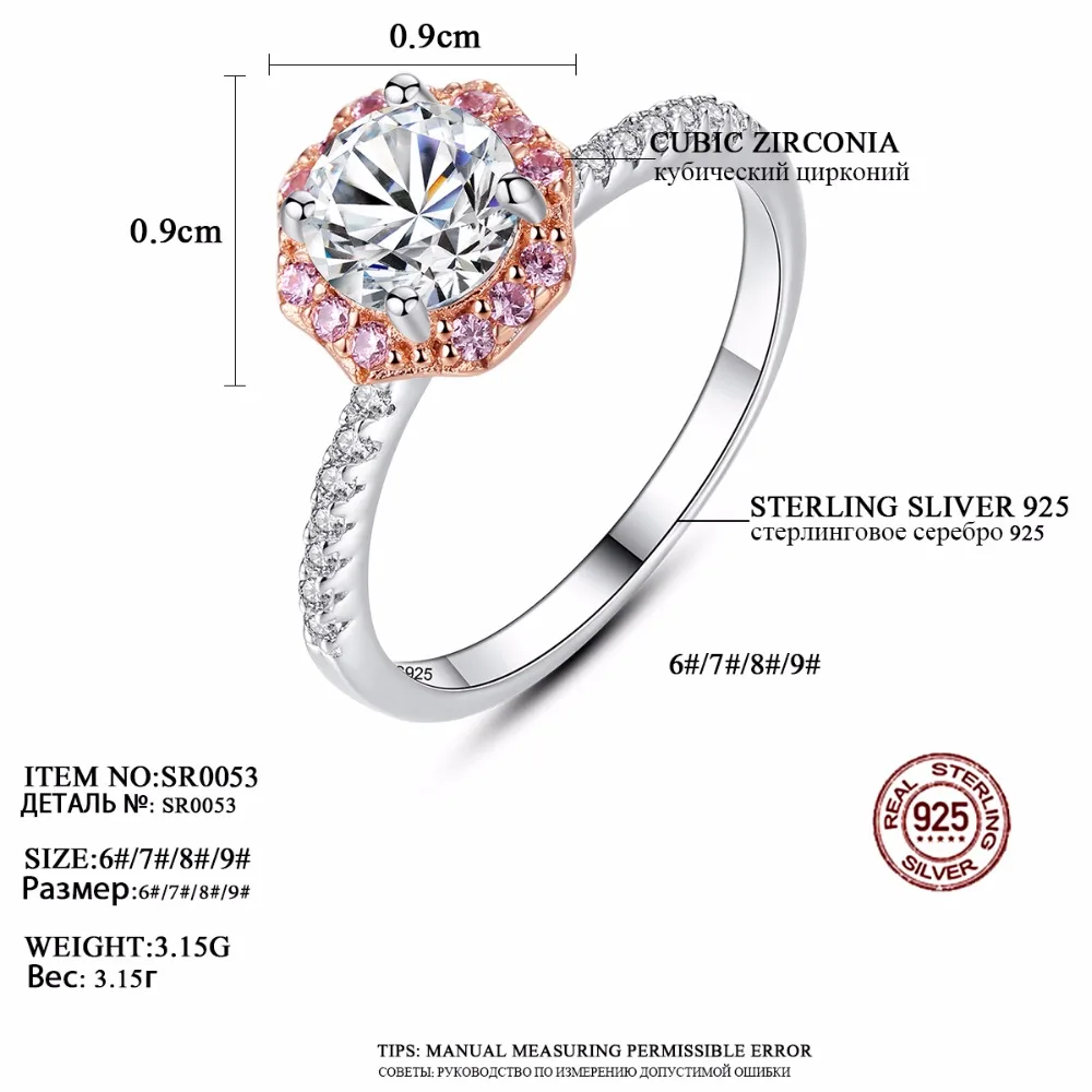 Genuine 925 Sterling Silver White Zircon Finger Ring for Girls Two-Color Gold Pink Flower Rings for Women Party Jewelry