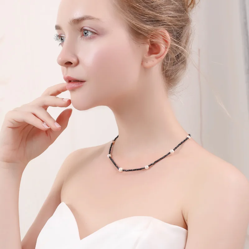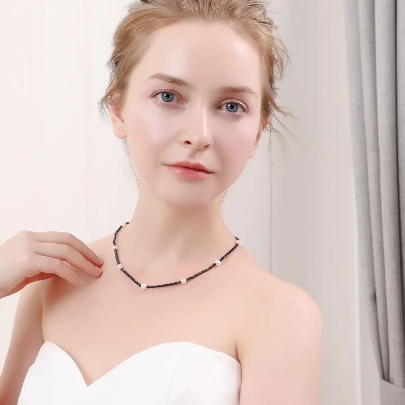 6-7mm White Pearl with 3mm Gun Blue Crystal Necklace Choker Necklace Christmas Gift Jewelry