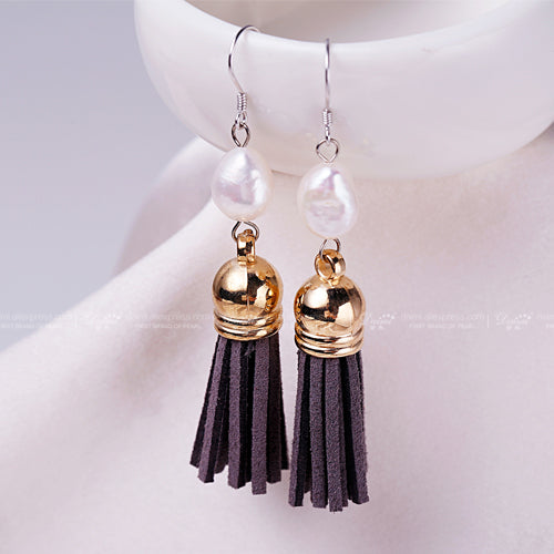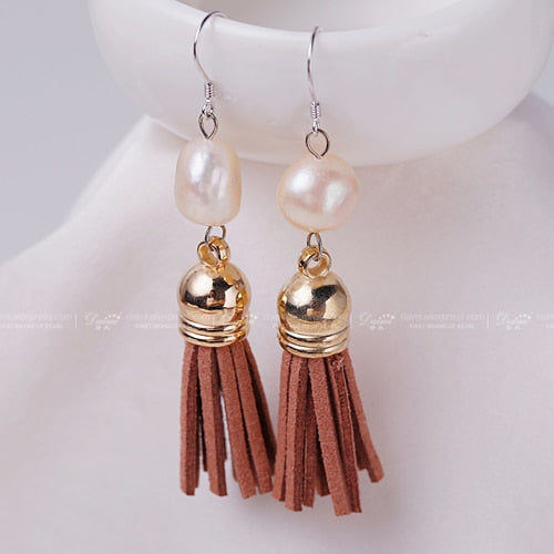 Leather Tassels Earrings Pearl Earrings 9-10mm White Baroque Pearl Bohemian Silver Earrings Wholesale Price