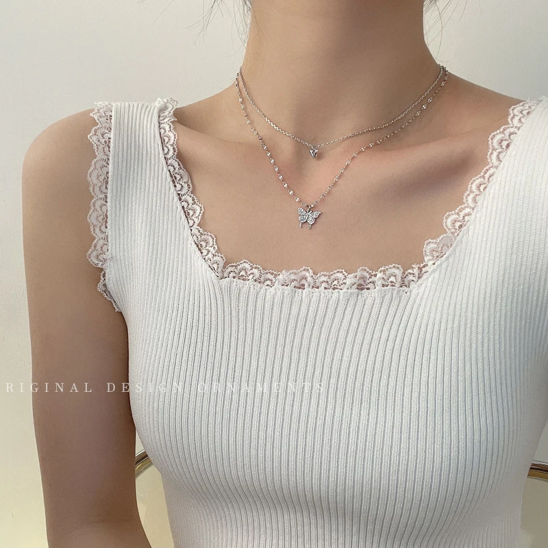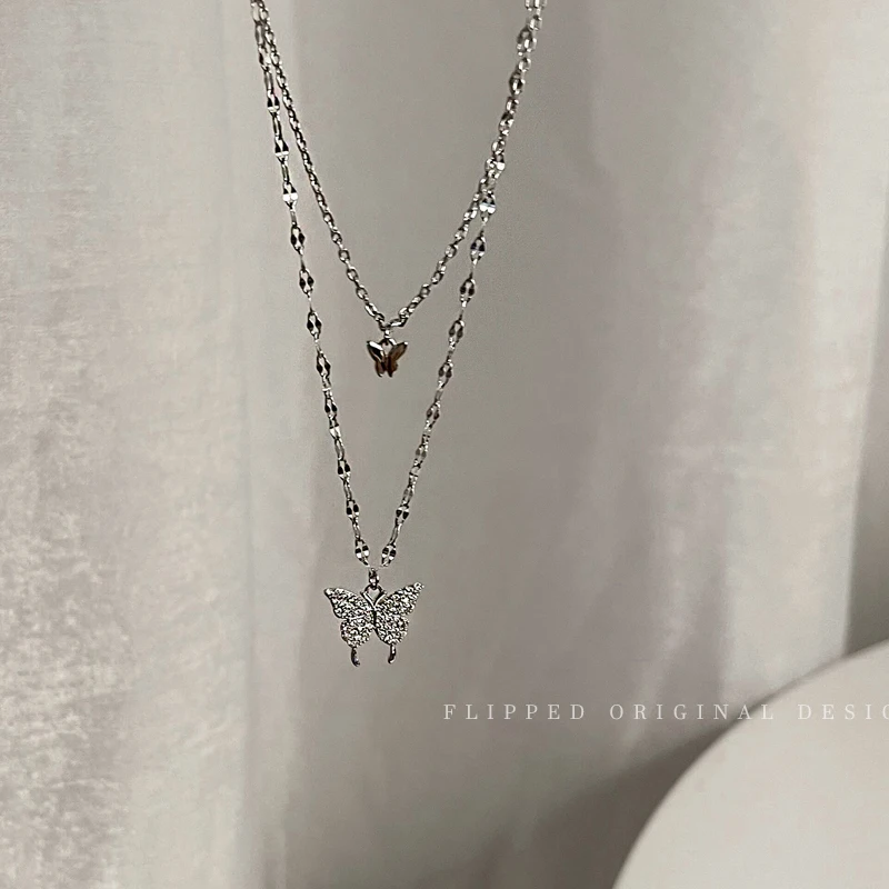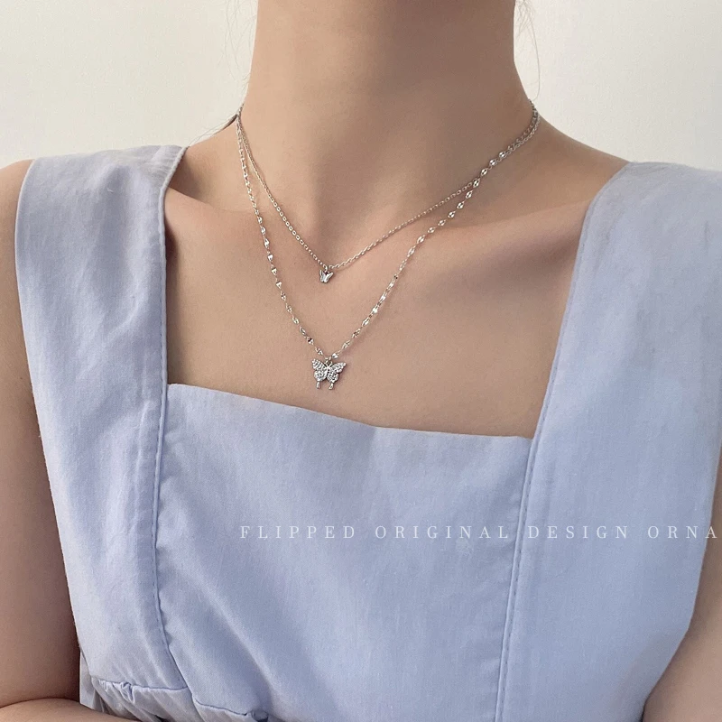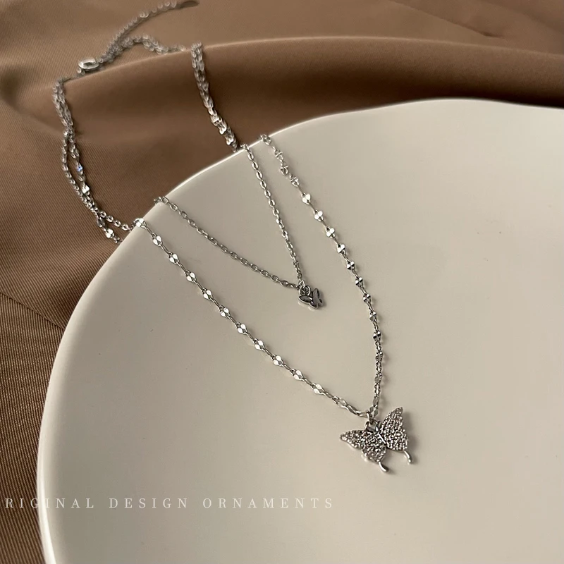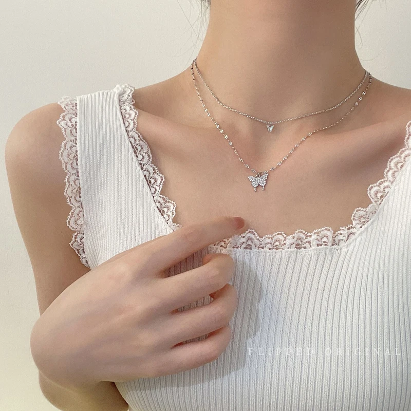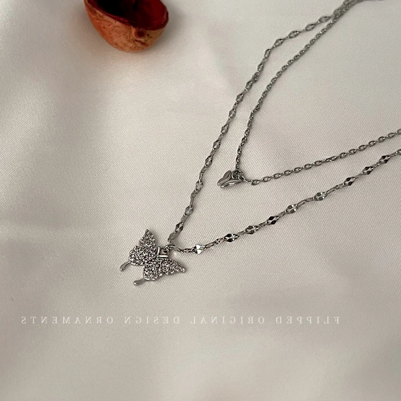 Dainty Zirconia Butterfly Pendant Necklace For Women Punk Silver Color Layered Chain Korean Cute Choker Jewelry 2021