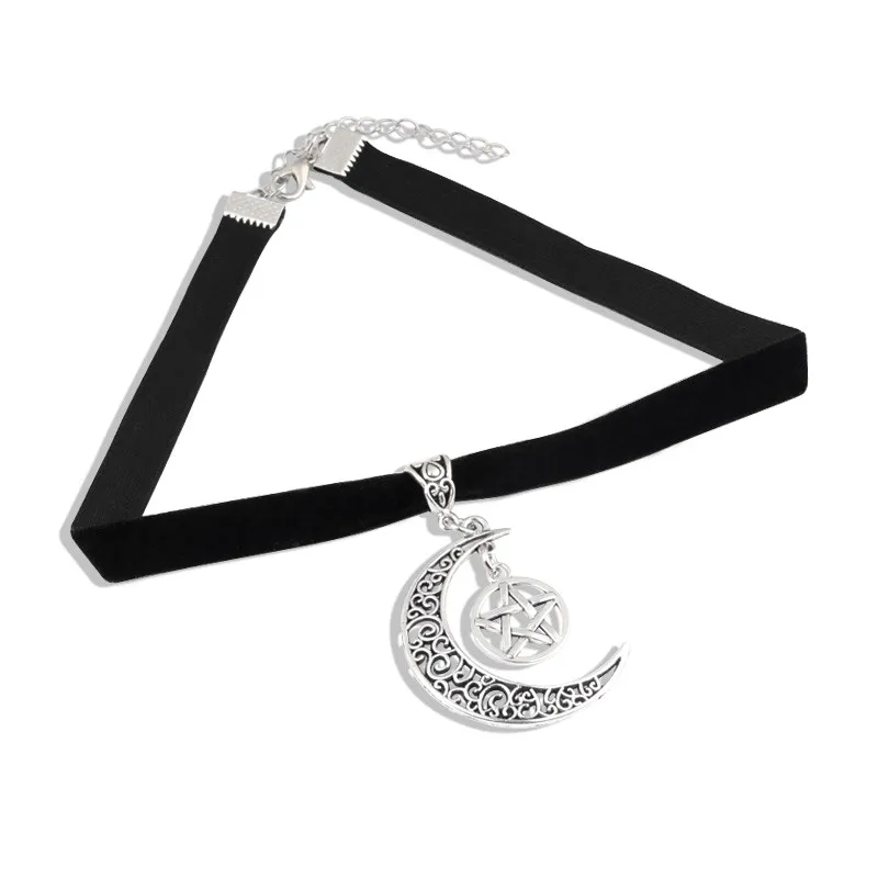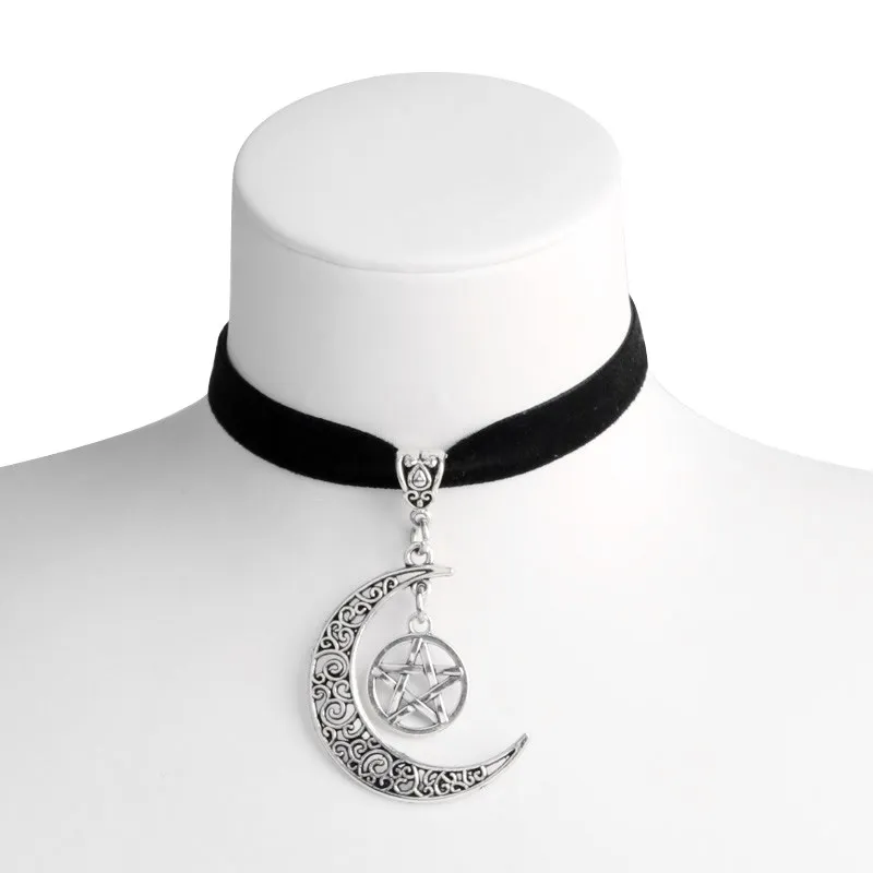 Dark Goth Moon Pentagram Pendant Chokers Necklace Witchy Velvet Necklaces Pagan Witchcraft For Women Mystical Jewelry