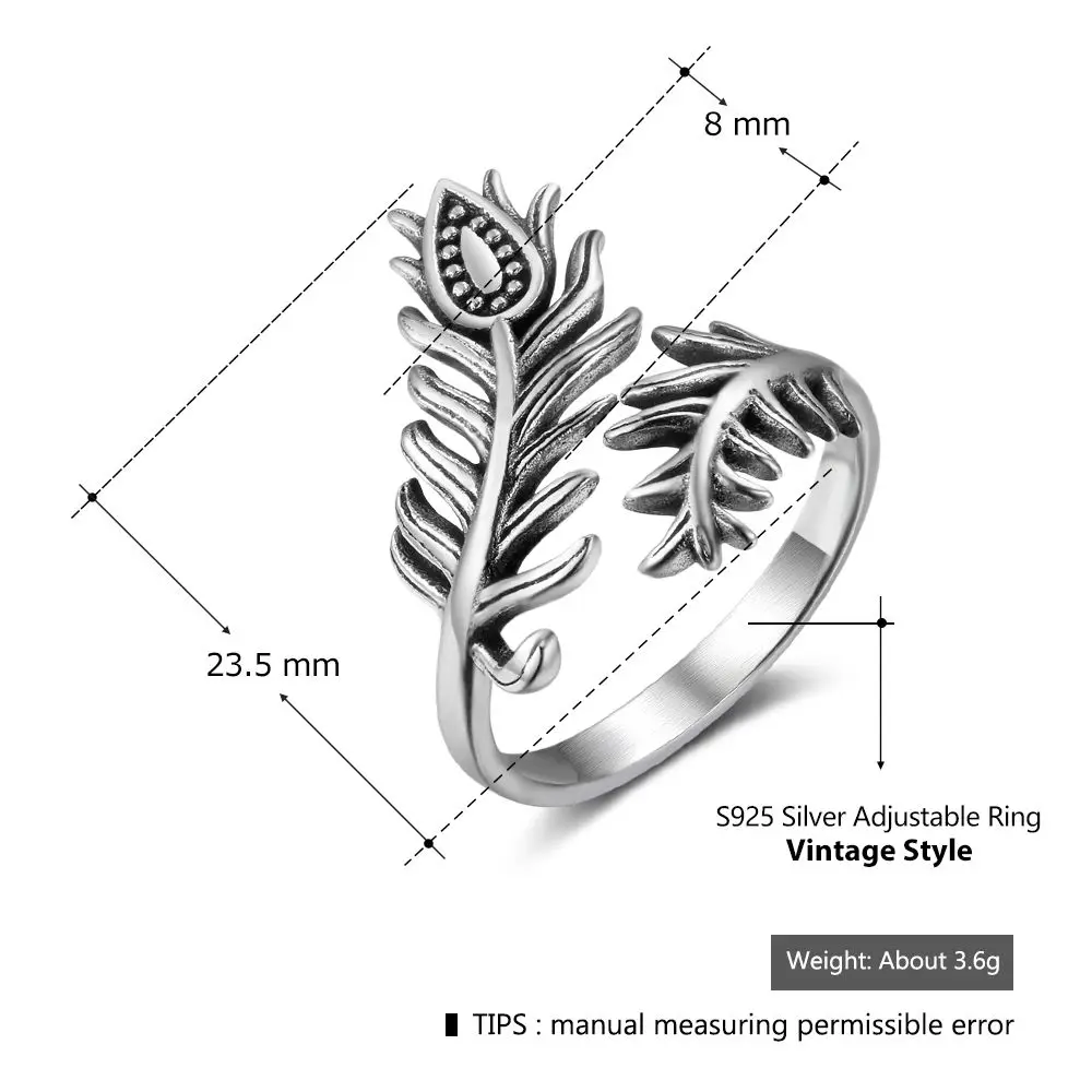 New Vintage Style Real 925 Sterling Silver Feather Rings for Women Girls Female Retro Adjustable Finger Ring Jewelry