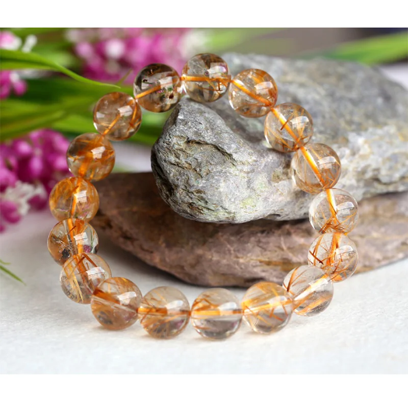 Discount Wholesale Natural Genuine Gold Copper Needle Rutile Quartz Finished Stretch Bracelet Round Jewelry beads 04095