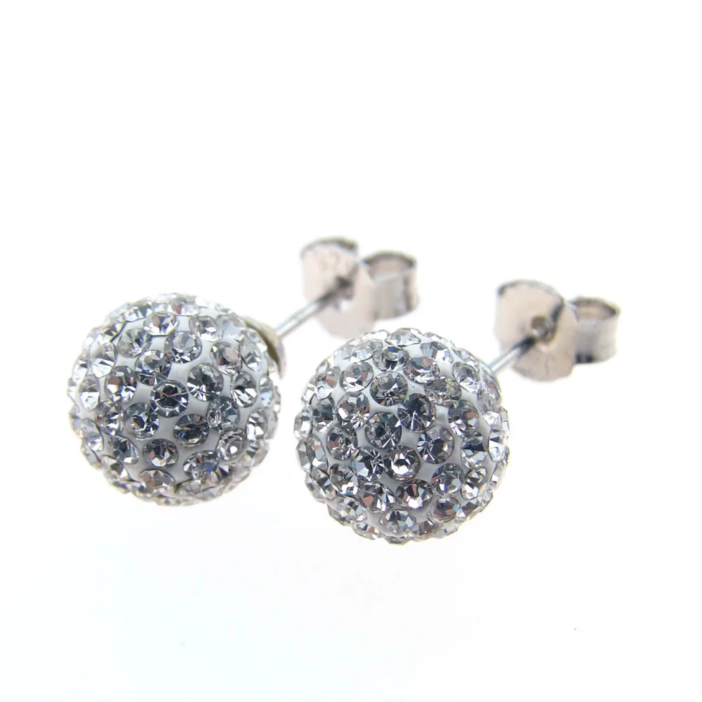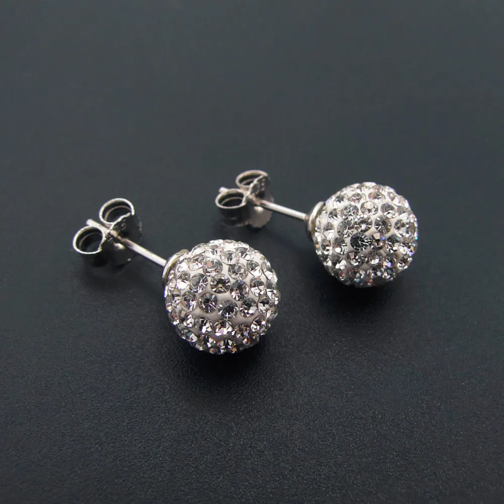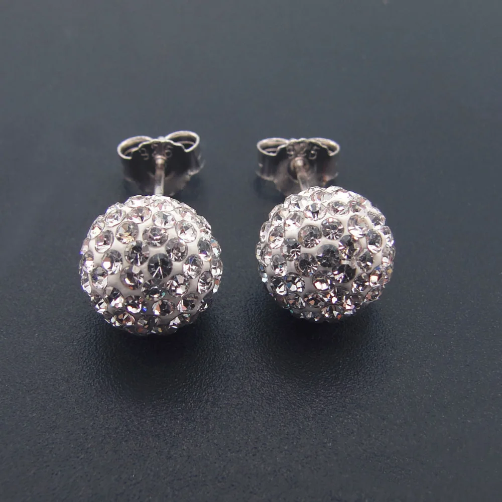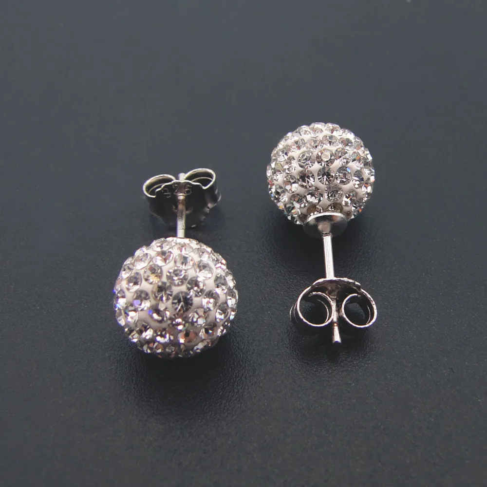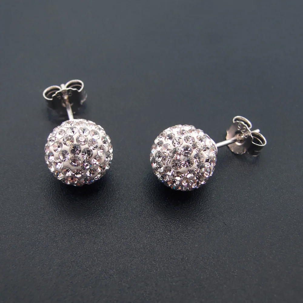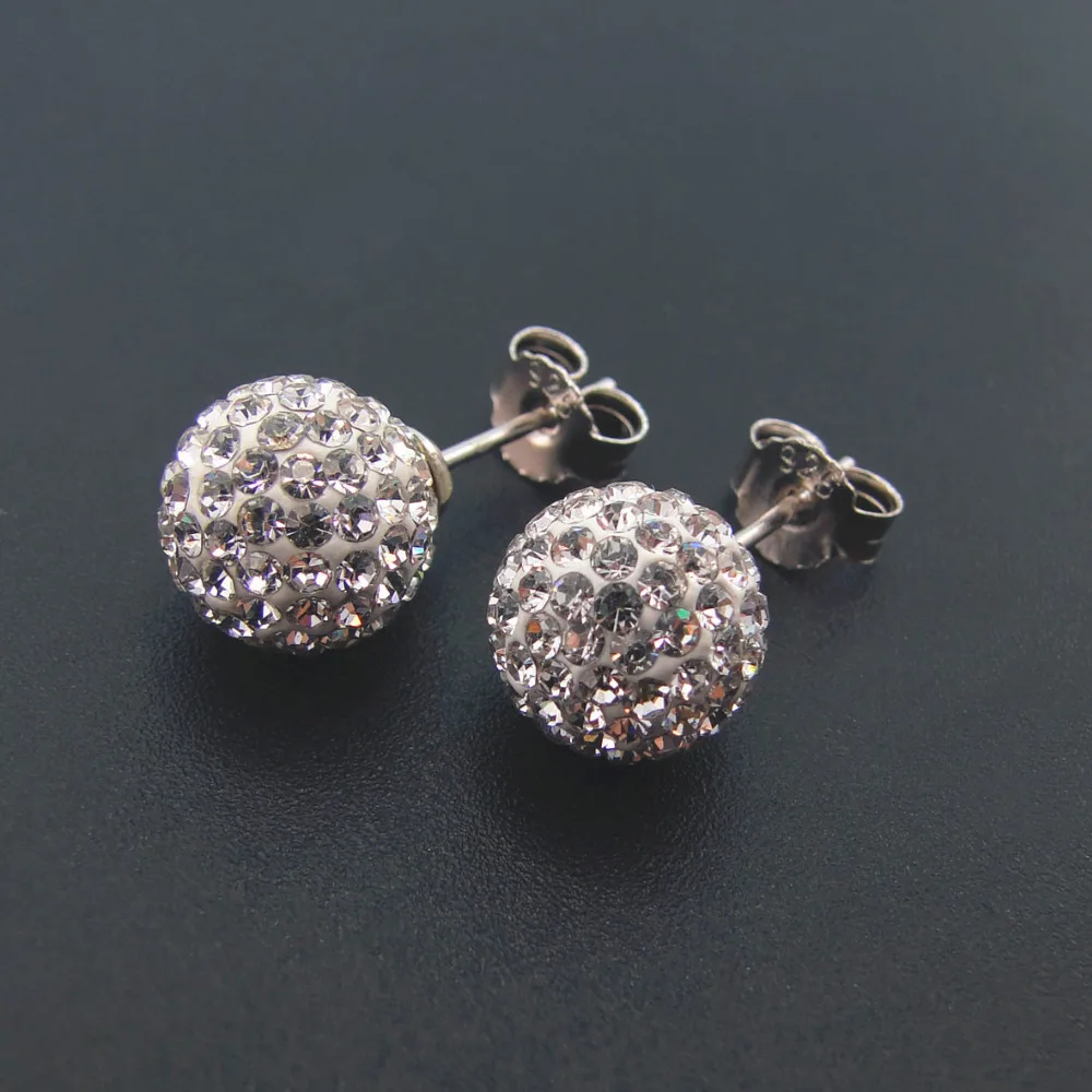 925 Sterling Silver Ear Post Stud Earrings Ball Pave 10mm Dia Silver Rhinestone Ear Studs Gift for Fashion Ladies