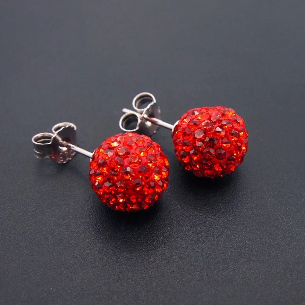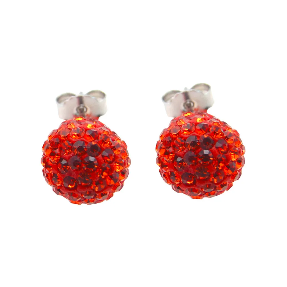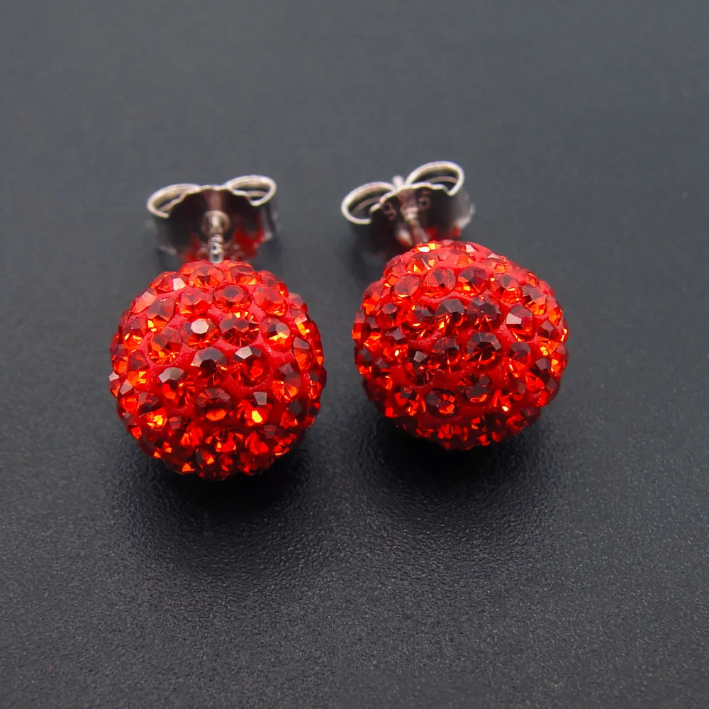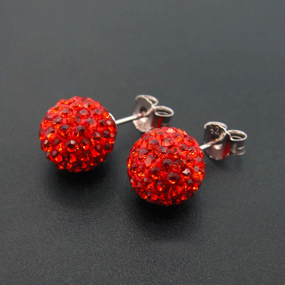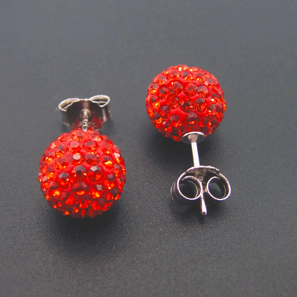 925 Sterling Silver Orange Red Colored 10MM Disco Ball Full of Rhinestone Women Stud Earrings Holid Gifts for Lovers