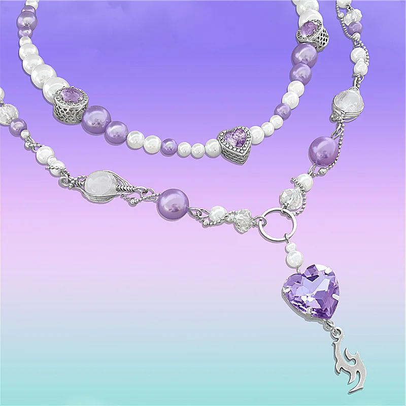 Egirl Vintage Purple Heart Pearl Crystal Totem Pendant Choker Necklaces for Women Harajuku 2021 Trend Chains Choker Y2K Jewelry
