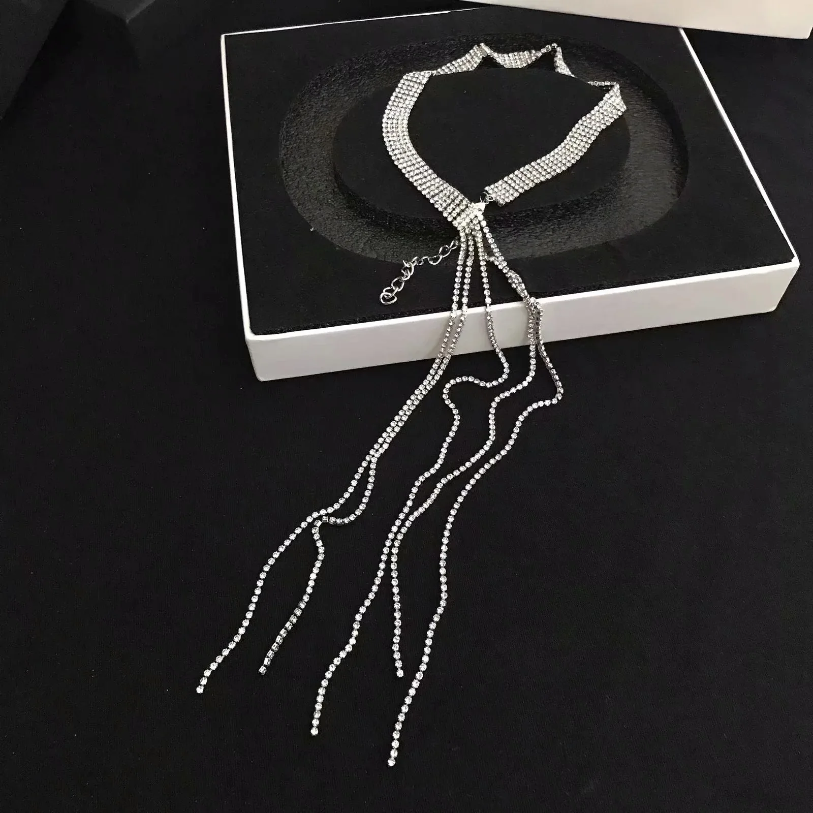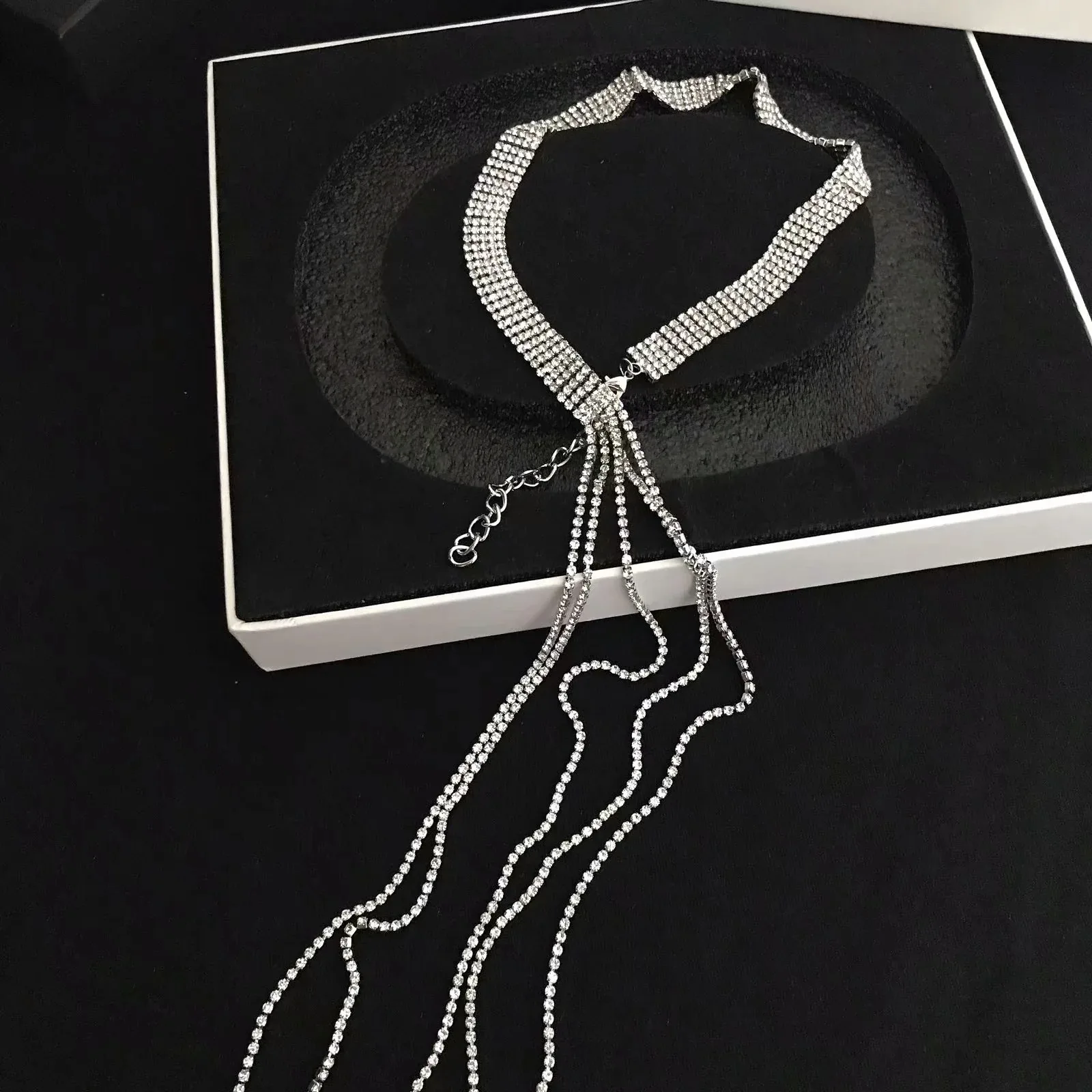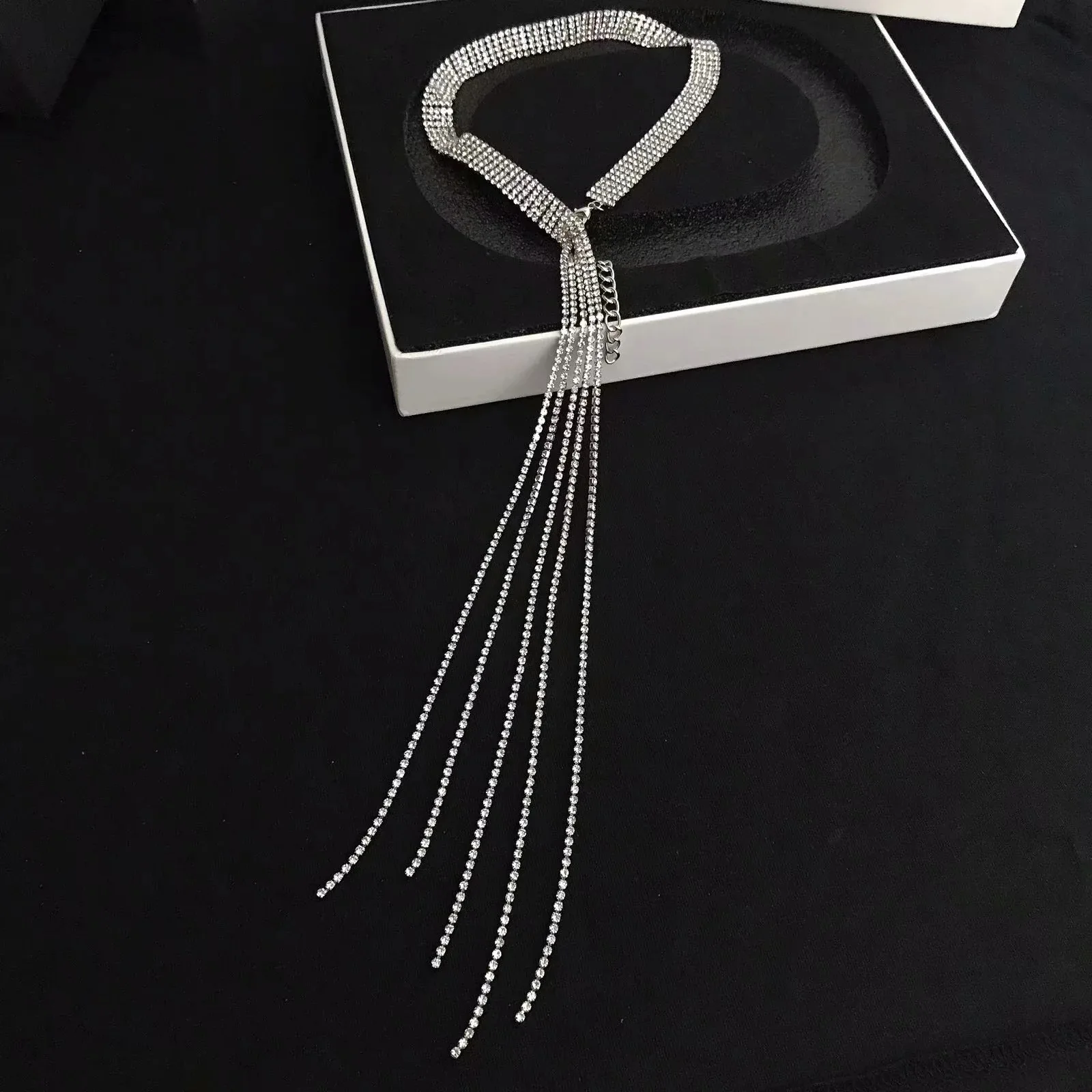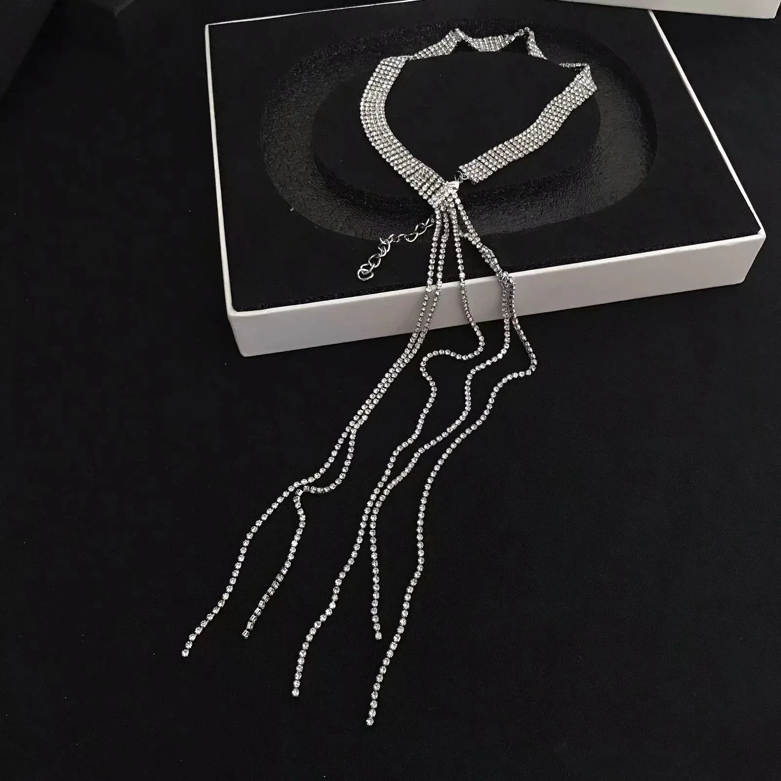Elegant indifference Tassels Long Full Rhinestone Necklace Neck chain Women Bow tie Geometry Clavicle chain Gift