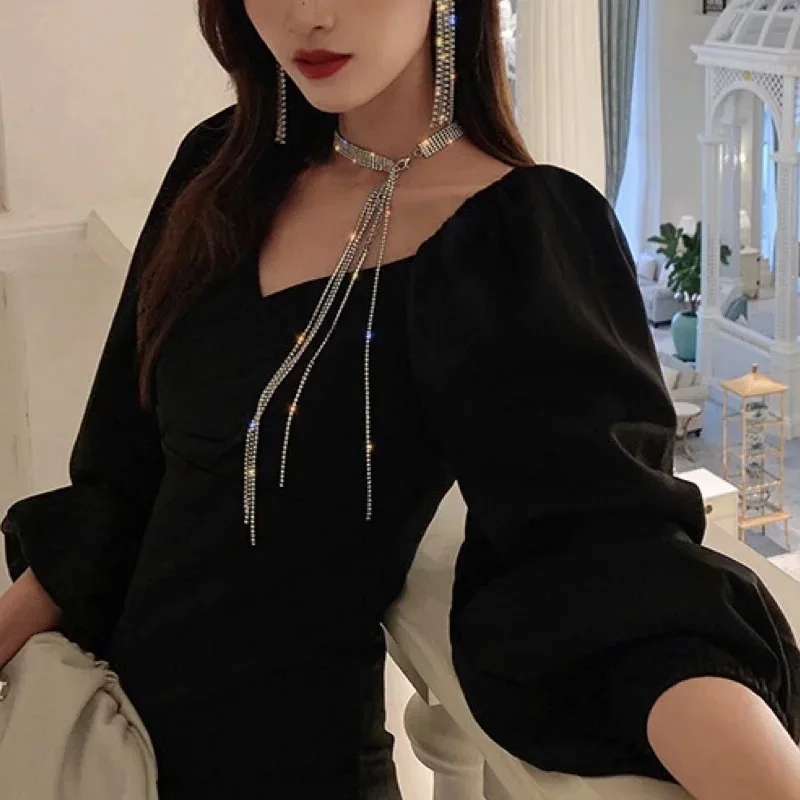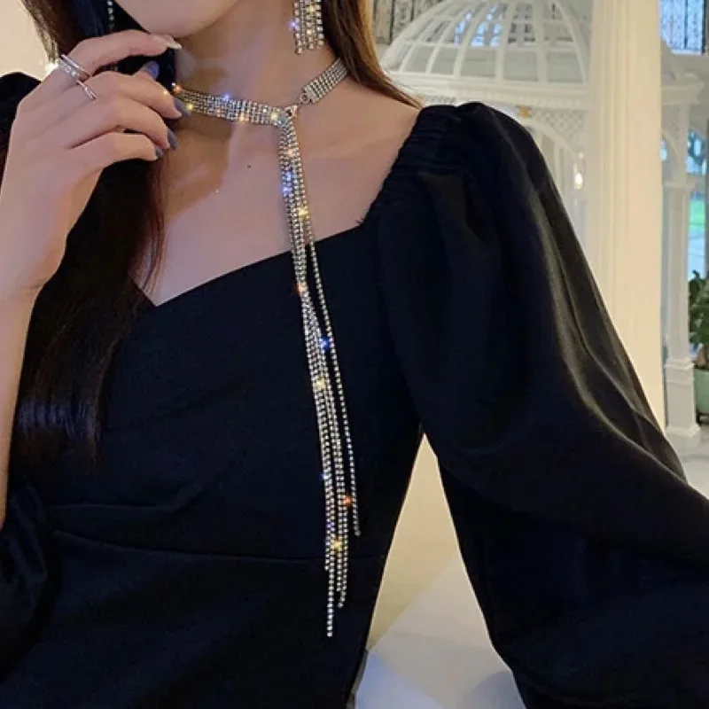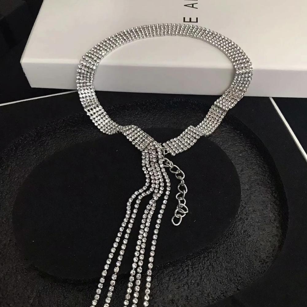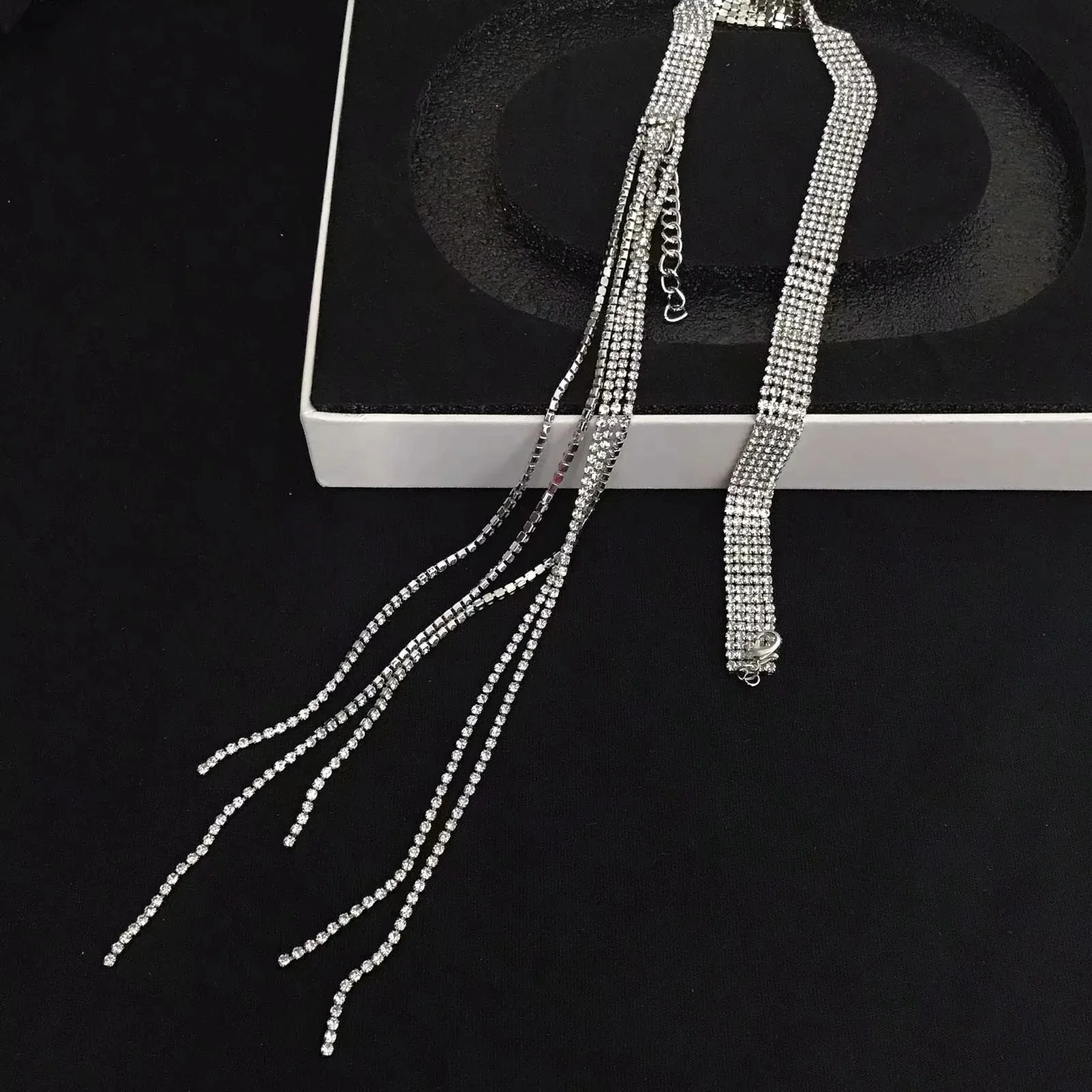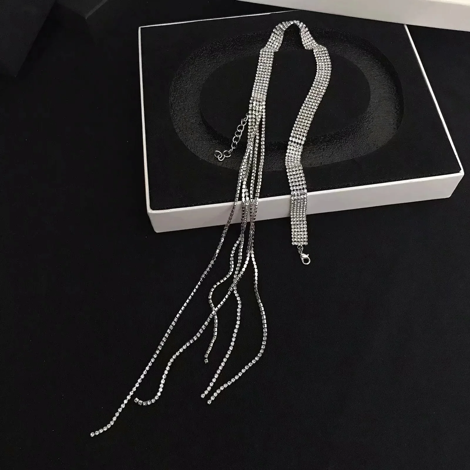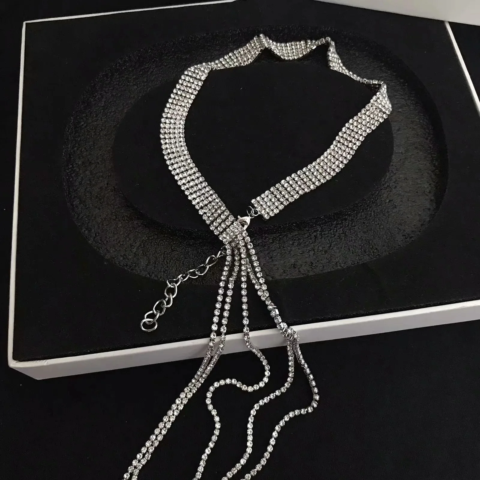 Elegant indifference Tassels Long Full Rhinestone Necklace Neck chain Women Bow tie Geometry Clavicle chain Gift