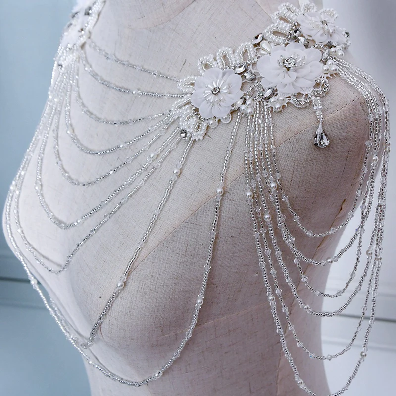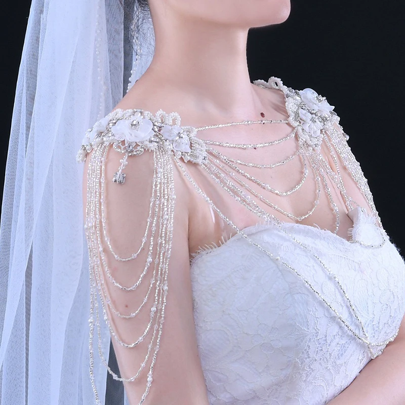 Elegant wedding dress pearl crystal shoulder chain jewelry flower lace beaded breast chain design woman tassel necklace accessor
