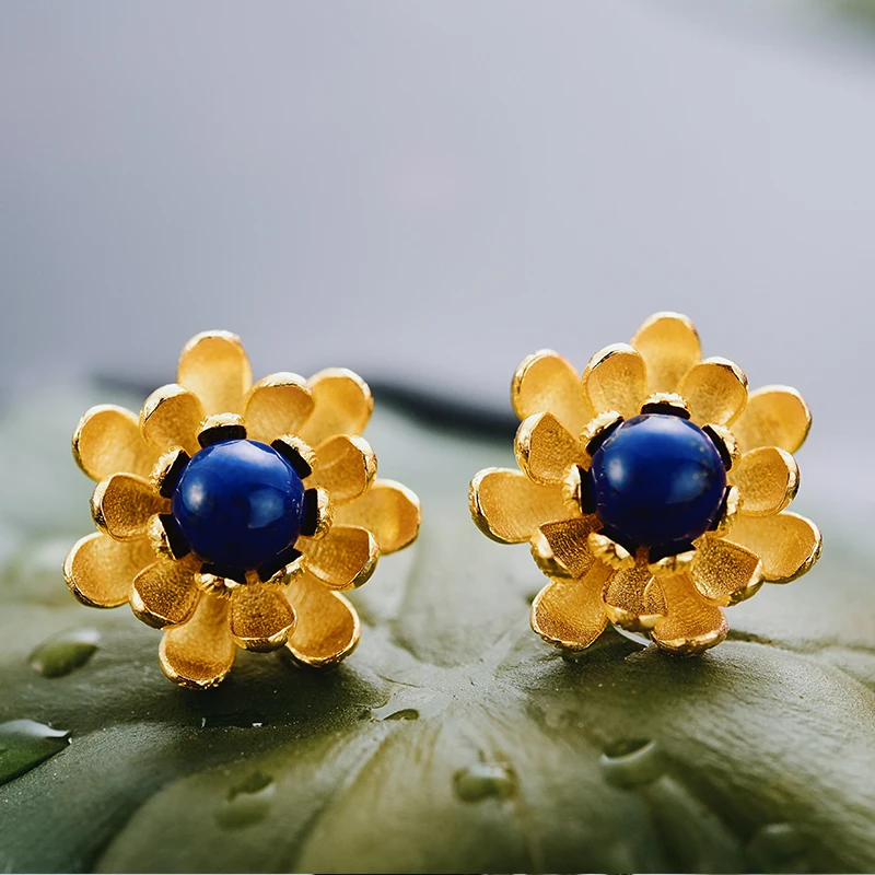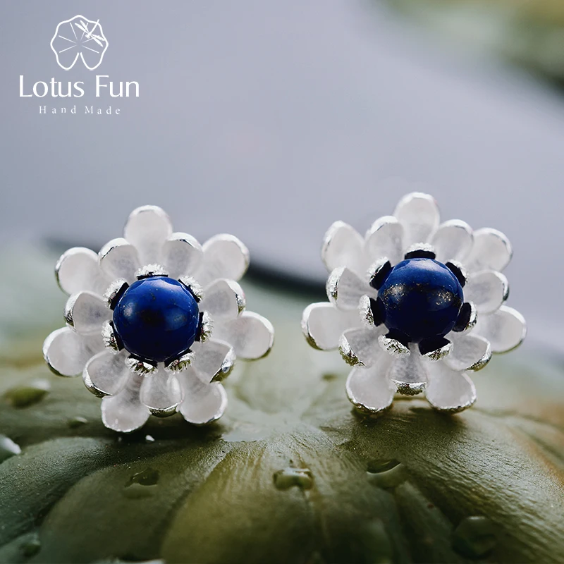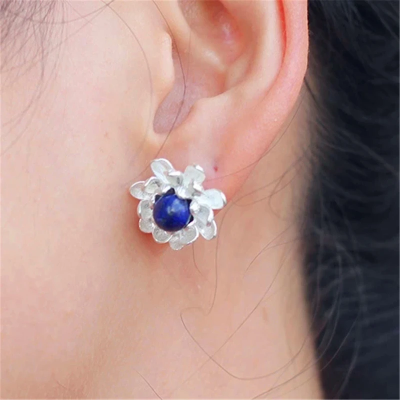 Real 925 Sterling Silver Natural Lapiz Creative Handmade Fine Jewelry Vintage Blooming Lotus Stud Earrings for Women
