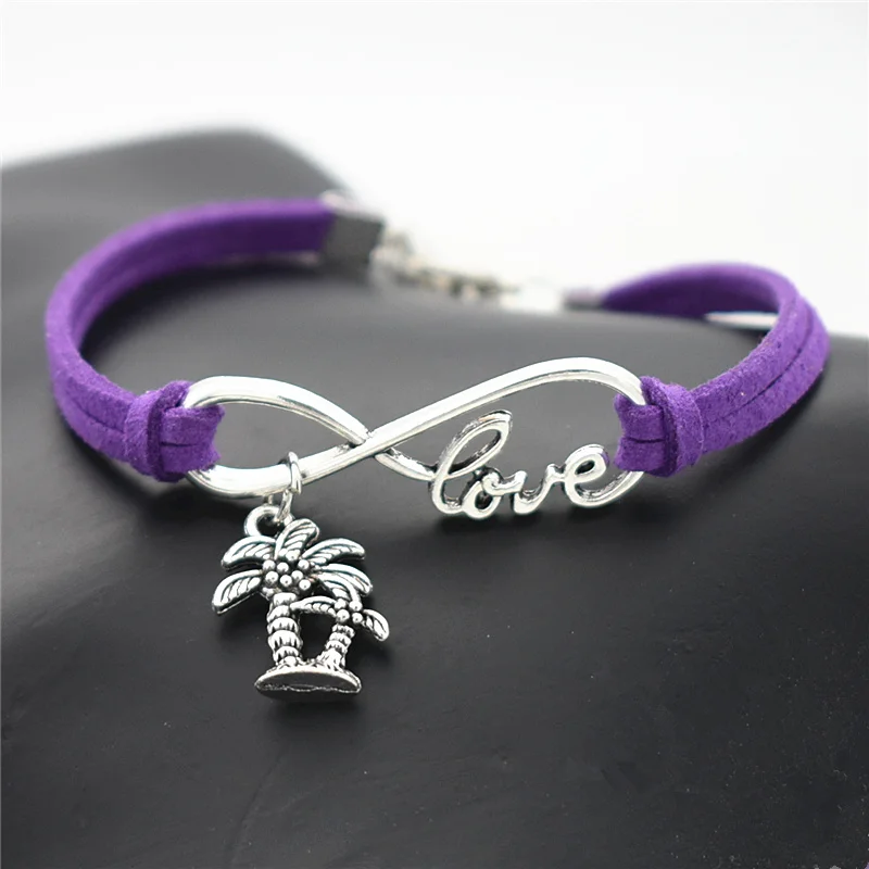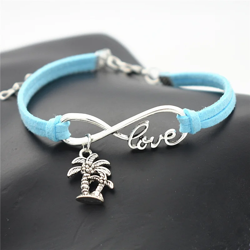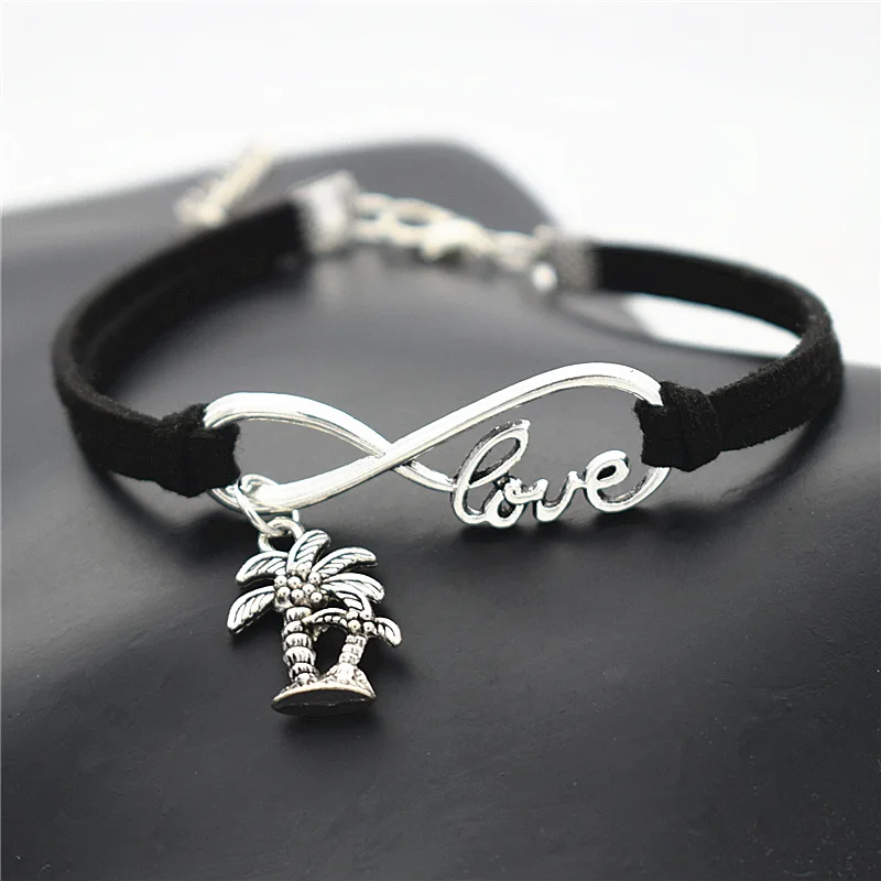 Fashion Summer Beach Vintage Plant Antique Silver Double Coconut Palm Tree Charm Leather Infinity Love Bracelets Gifts Jewelry