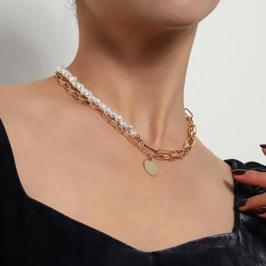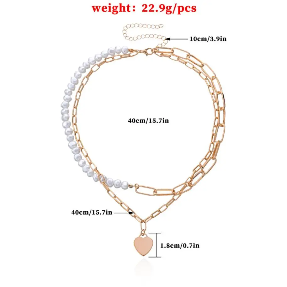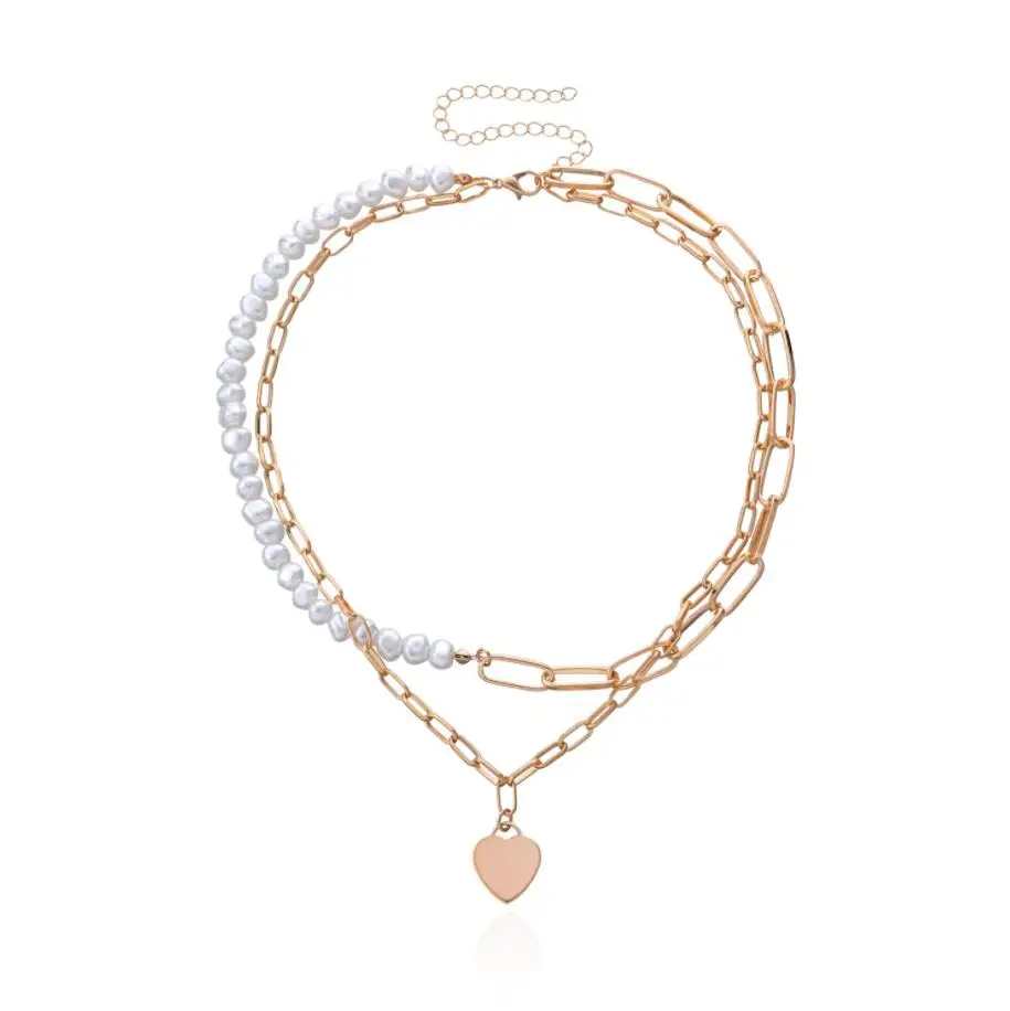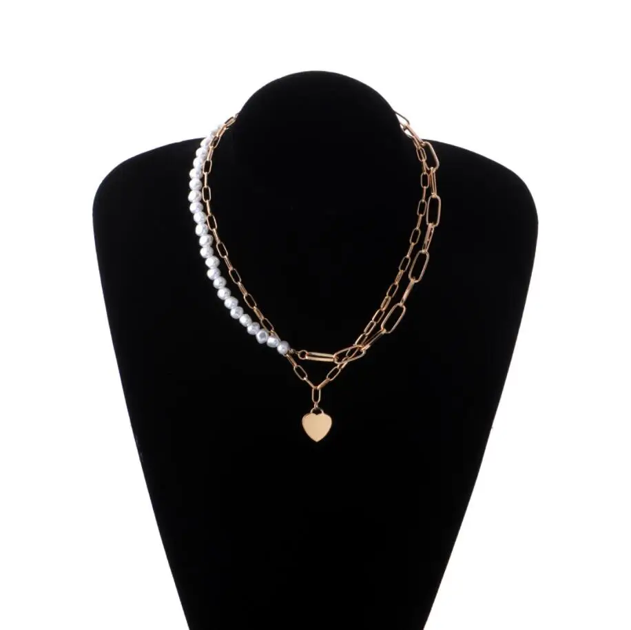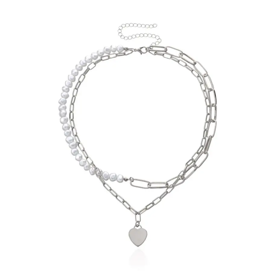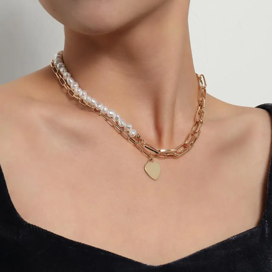 Fashionable Design Pearls and Link Chain Combined Women`s Heart Pendant Choker Necklace