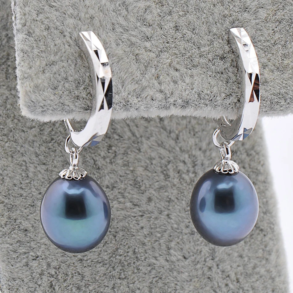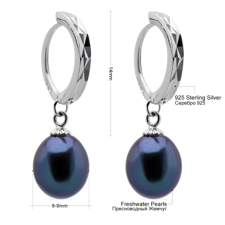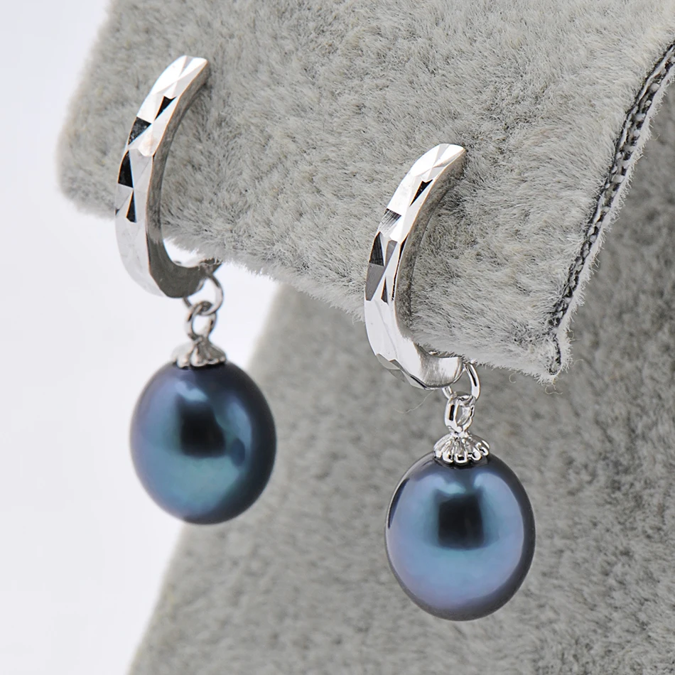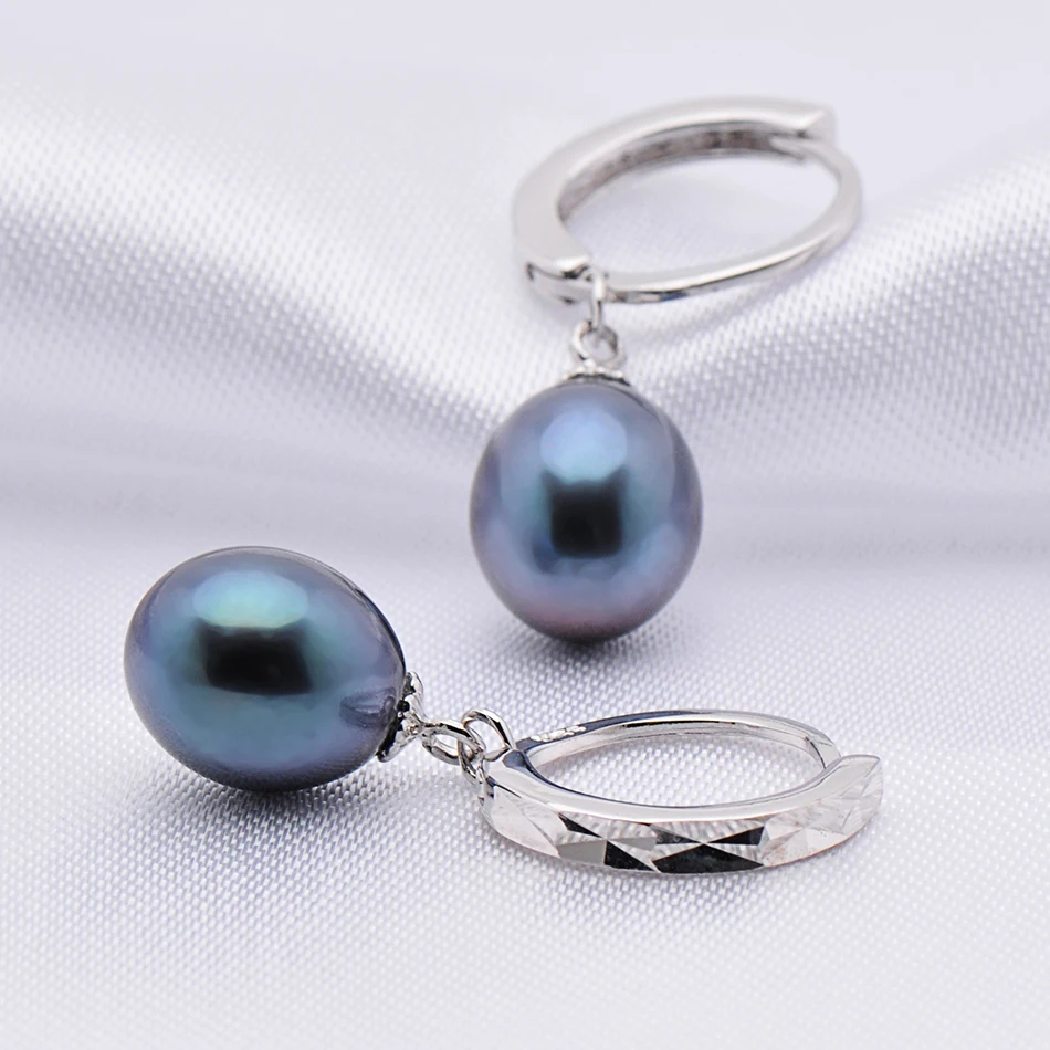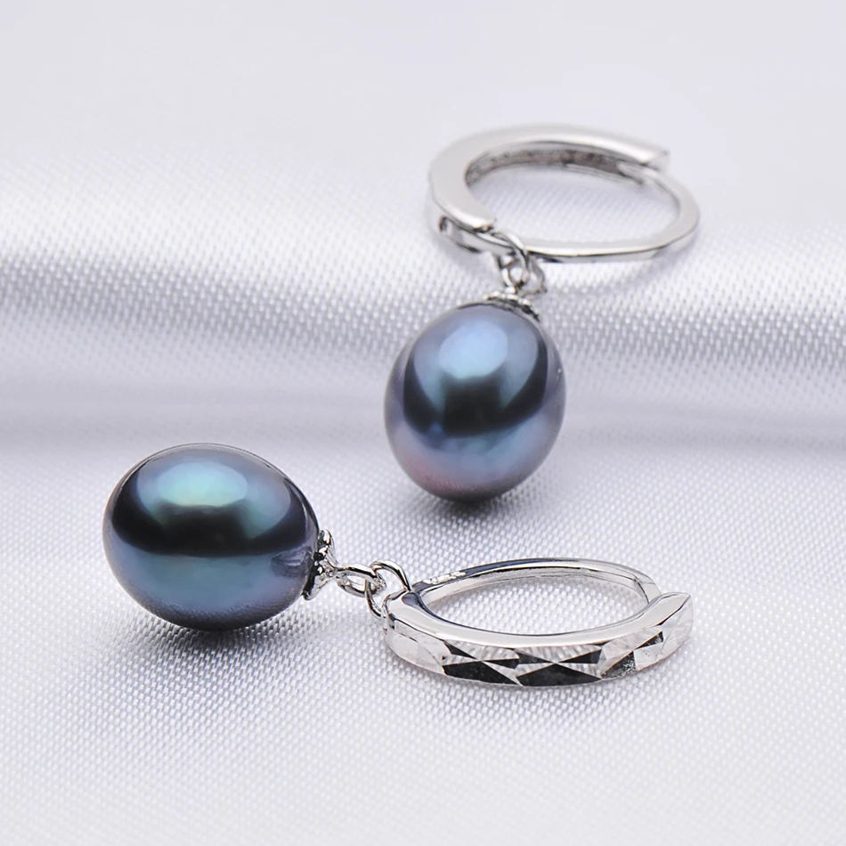 2020 New Black Pearl Hoop Earrings Fine Vintage Jewelry For Womens Gift 925 Sterling Silver Earring 8-9mm Pearl