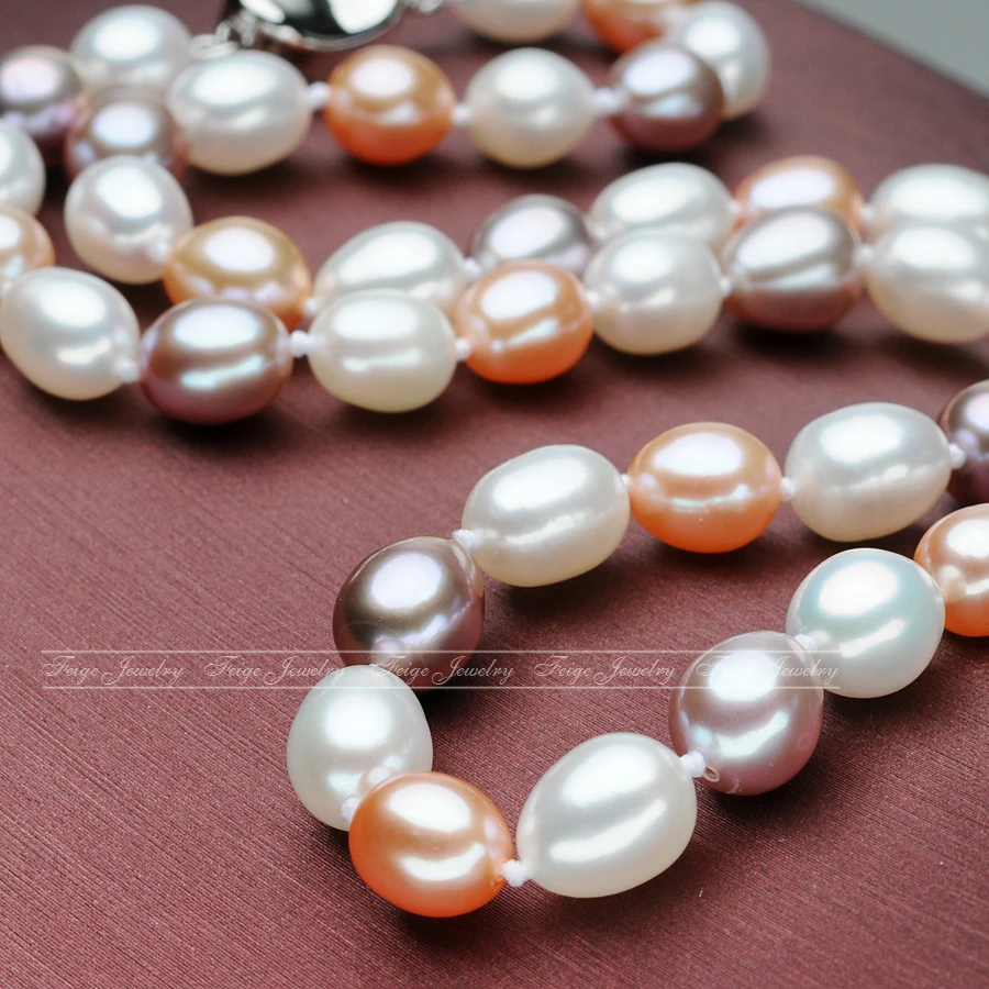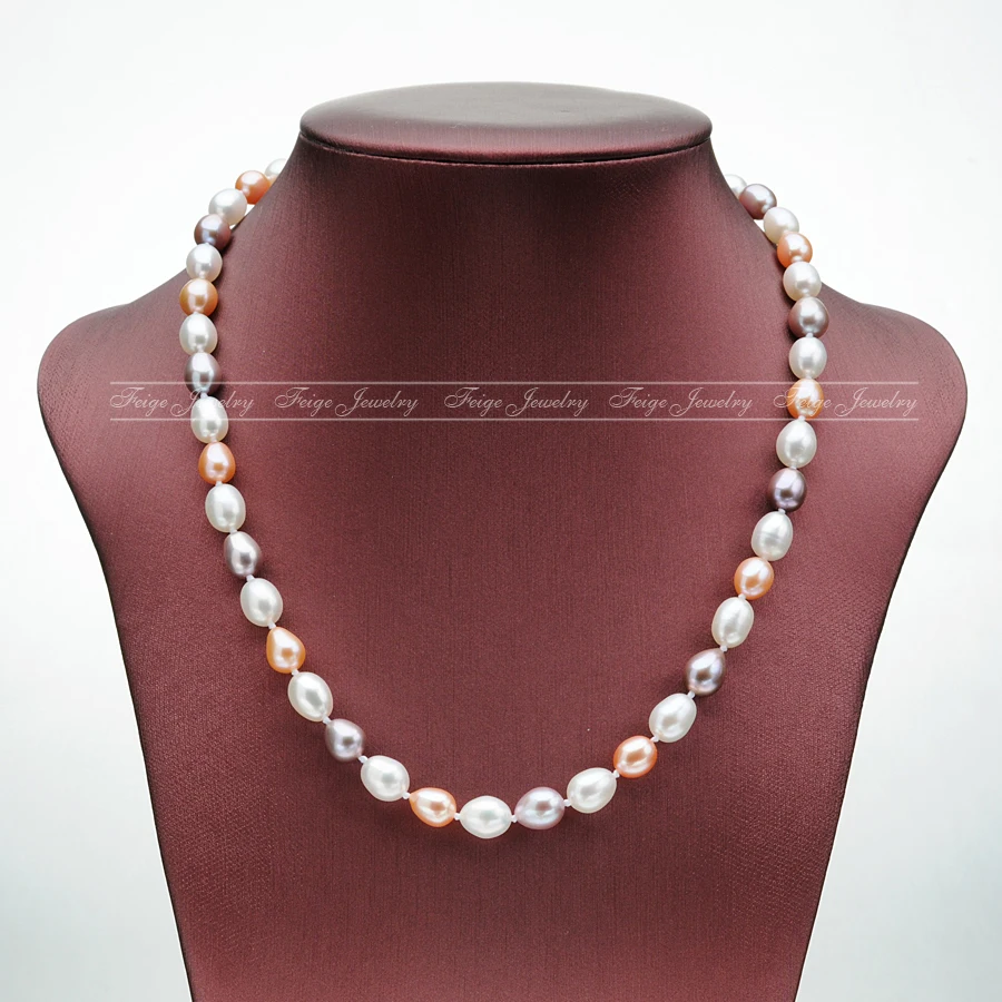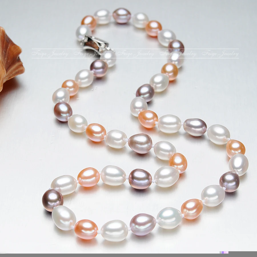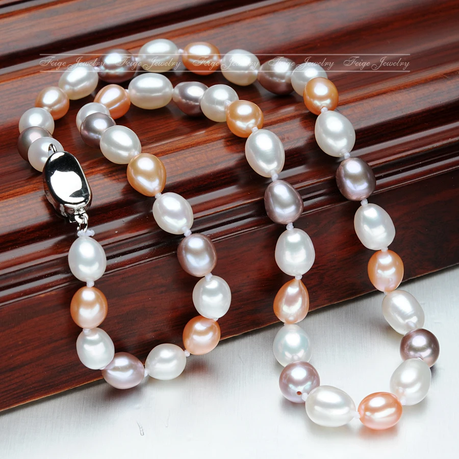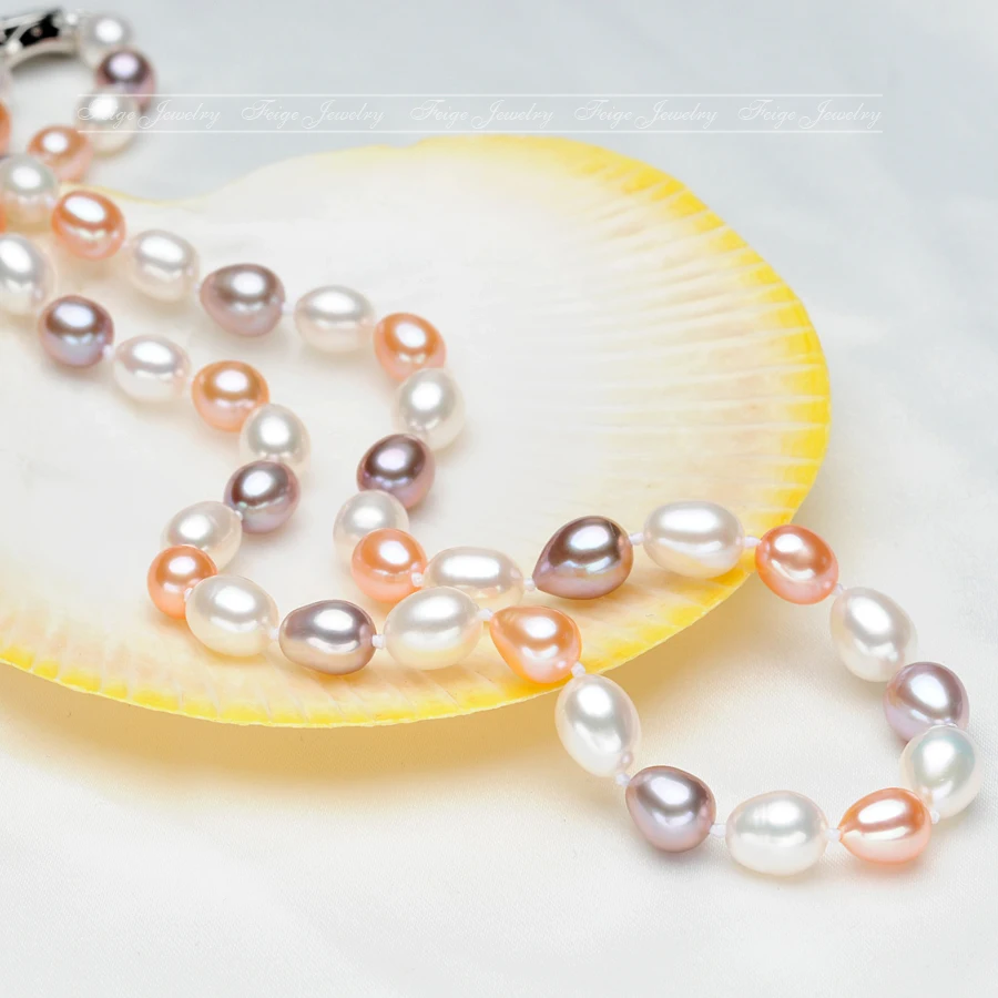 Genuine AAA 7-8mm Rice Shape Multicolor Pearl Necklace For Women's Choker Necklaces Fine Pearl Jewelry