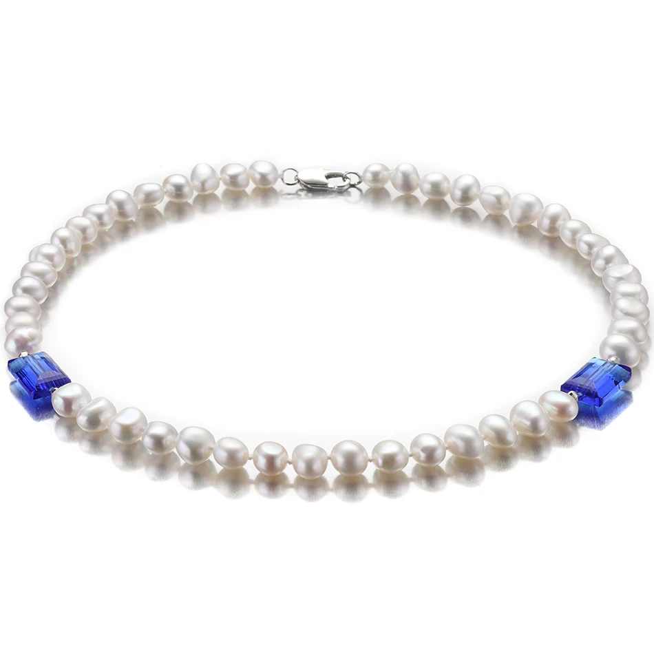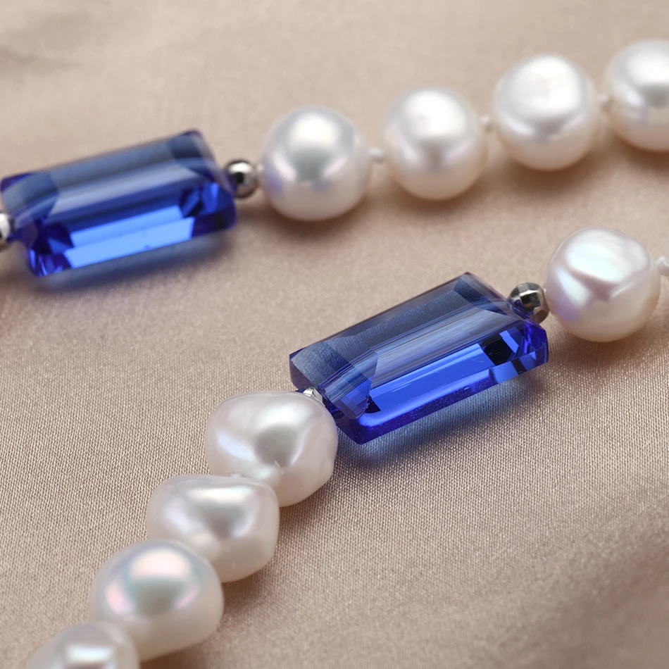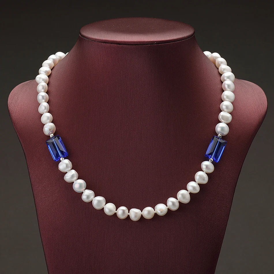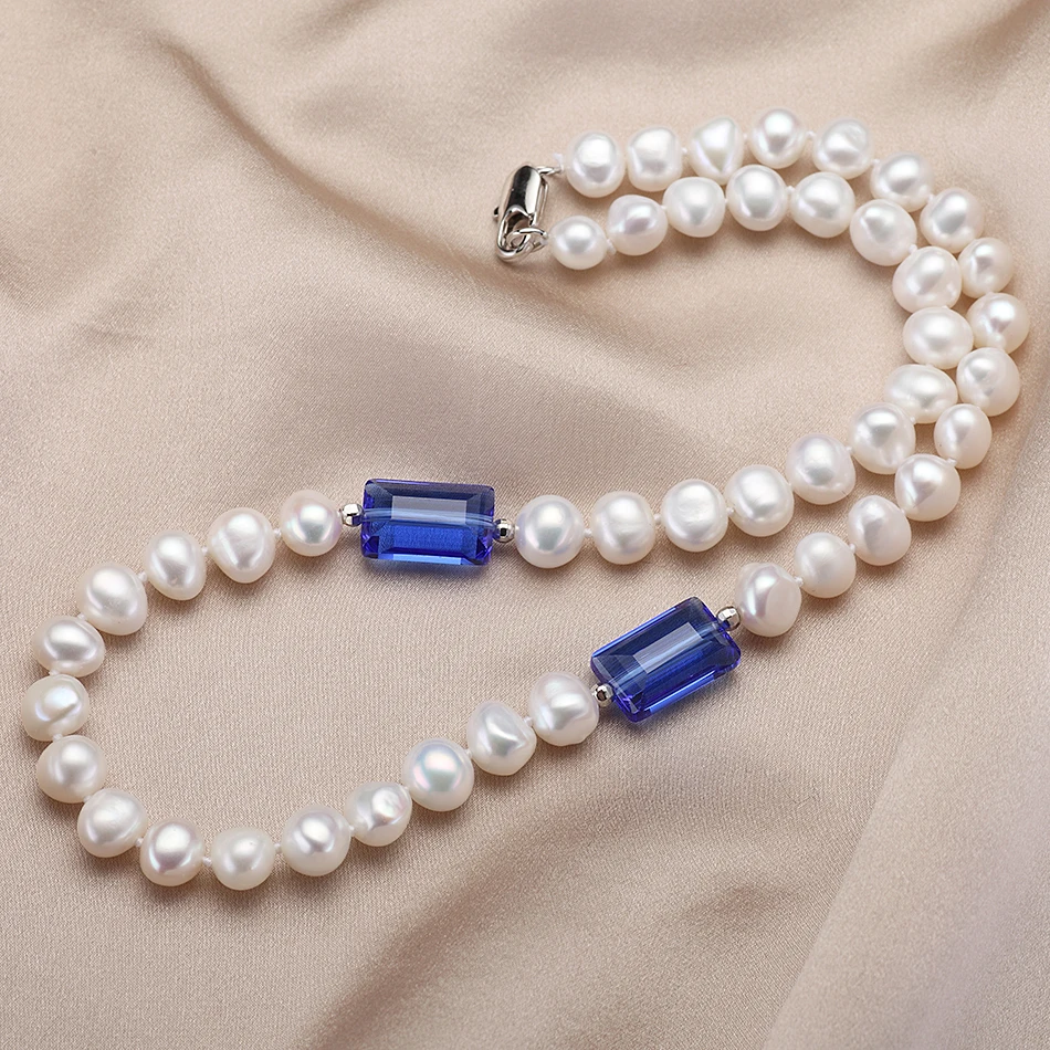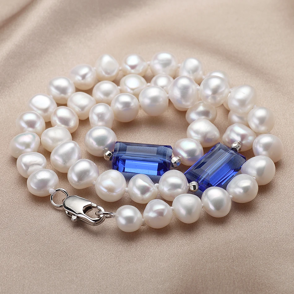 offer Baroque style 7-8MM White Pearl Necklace for Women Blue Crystal De moda Collar Pearl Fine Jewelry