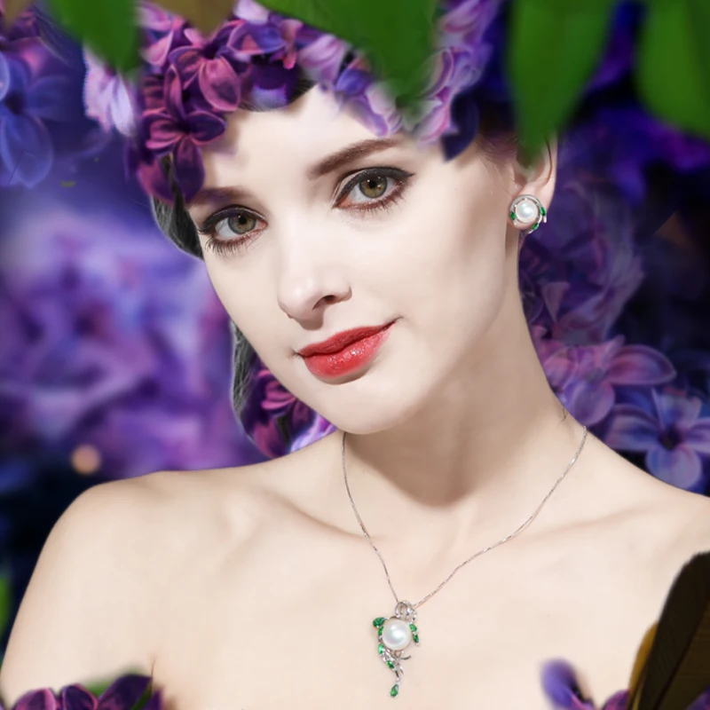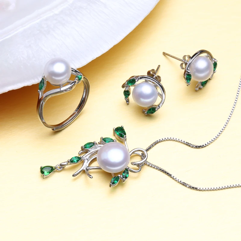 925 Sterling Silver natural pearl jewelry sets for women,Emerald stud earrings,pendant necklace engagement ring set