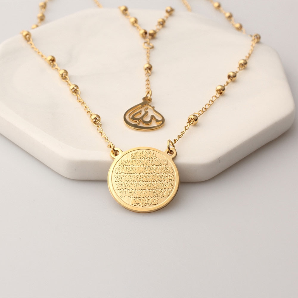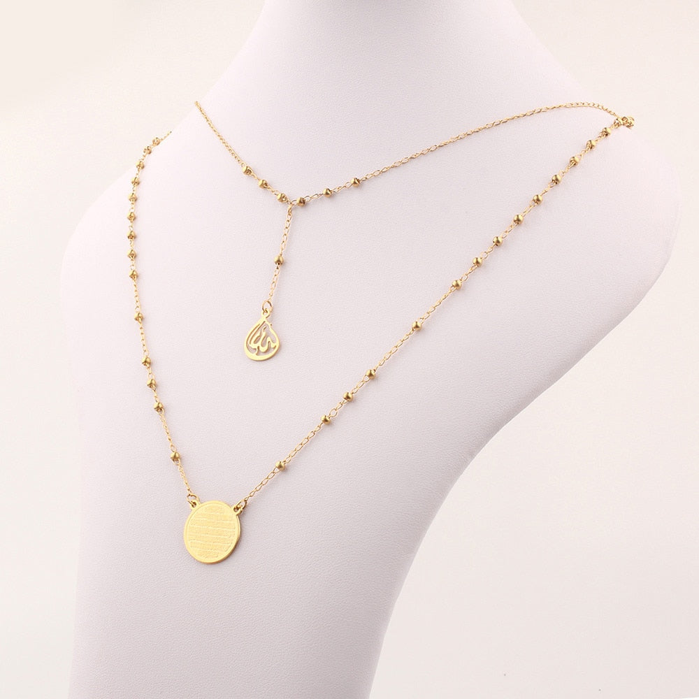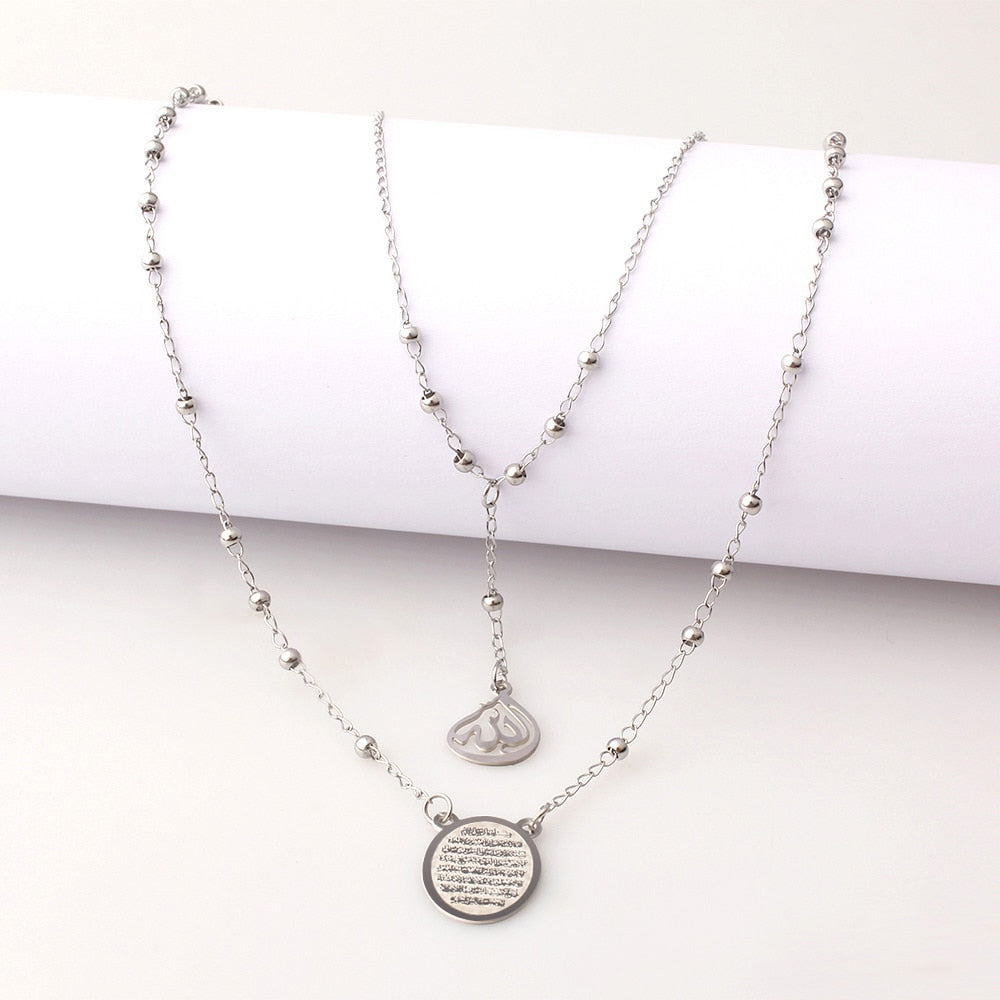 FINE4U N609 Islam Muslim Arabic Printed Medal Pendant Necklace Stainless Steel Layered 3mm Bead Rosary Necklace Islam Jewelry
