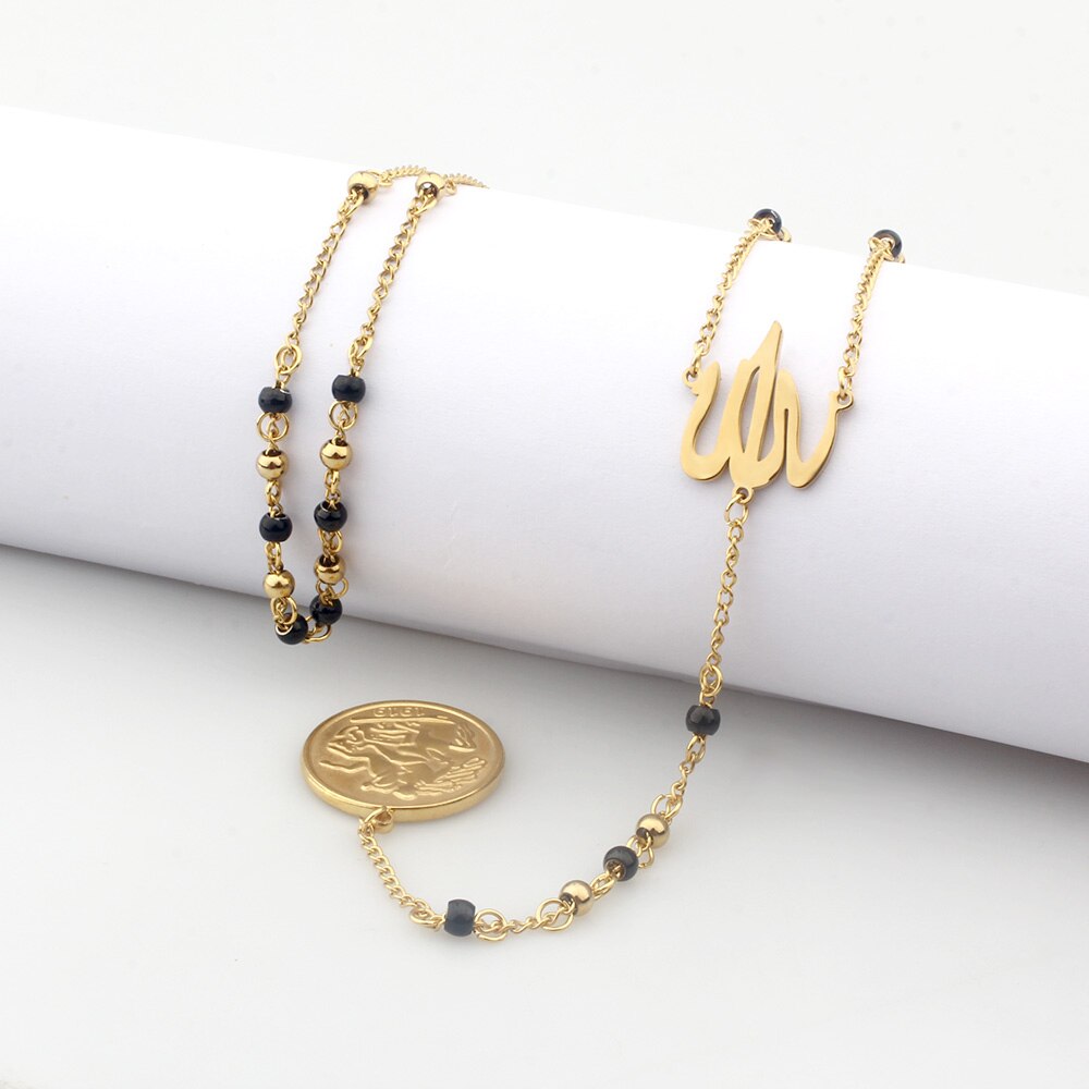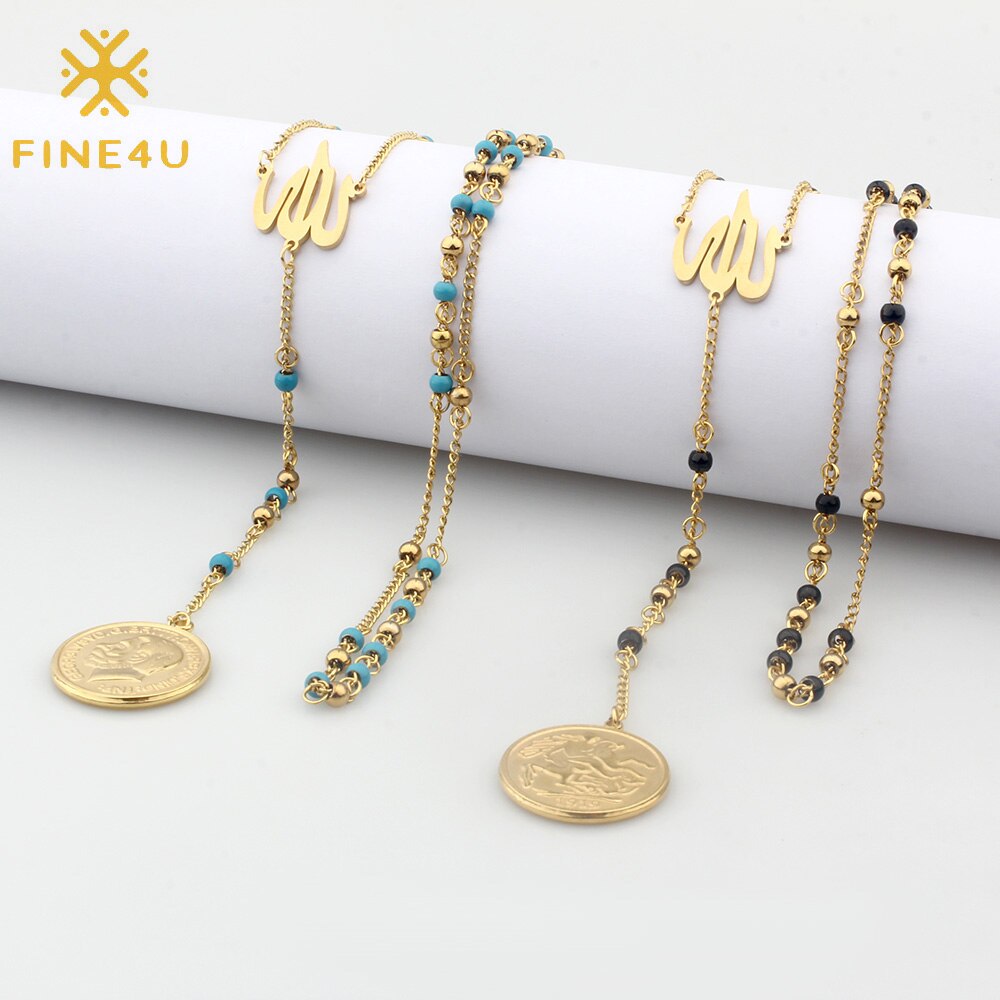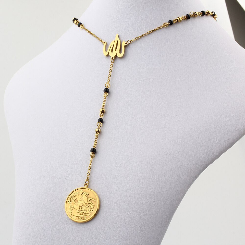 FINE4U N627 Great Britain George V Medal Pendant Necklace Stainless Steel 4mm Bead Rosary Necklace Islamic Muslims Allah Jewelry