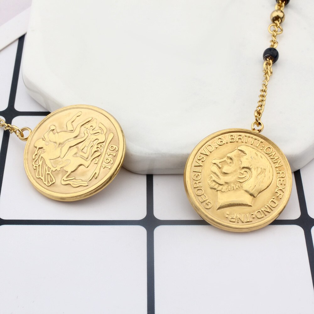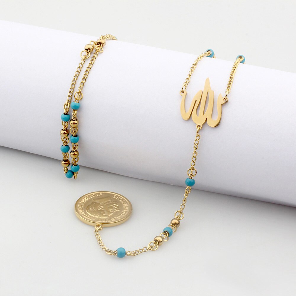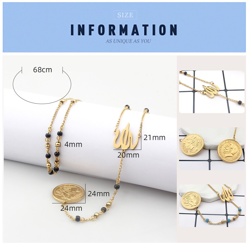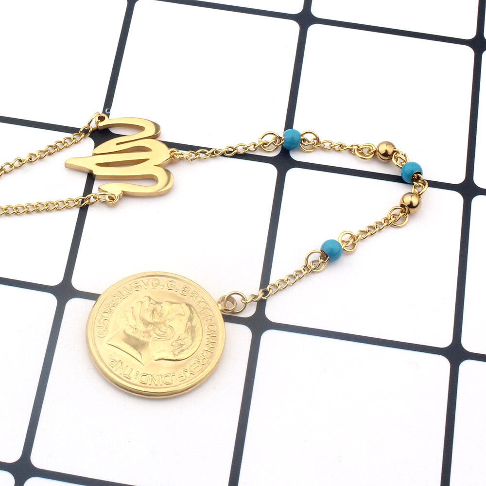 FINE4U N627 Great Britain George V Medal Pendant Necklace Stainless Steel 4mm Bead Rosary Necklace Islamic Muslims Allah Jewelry