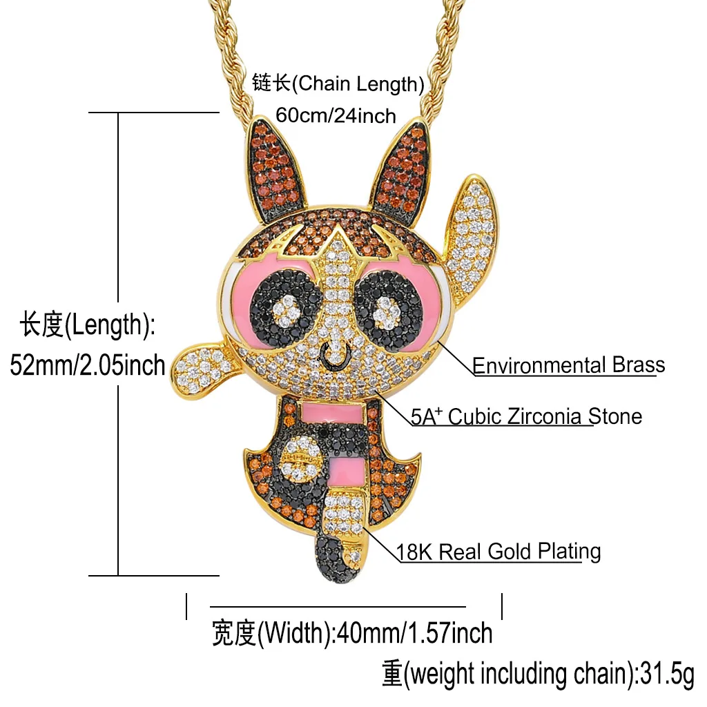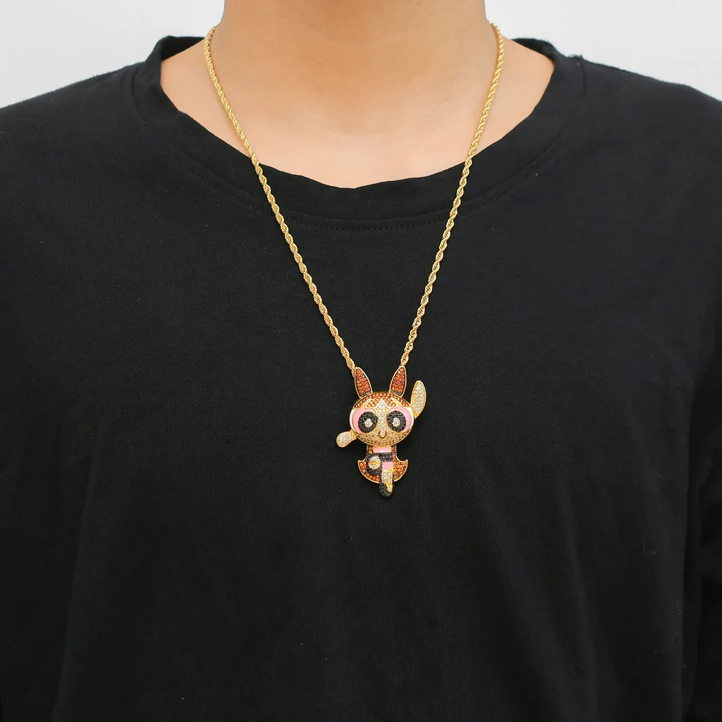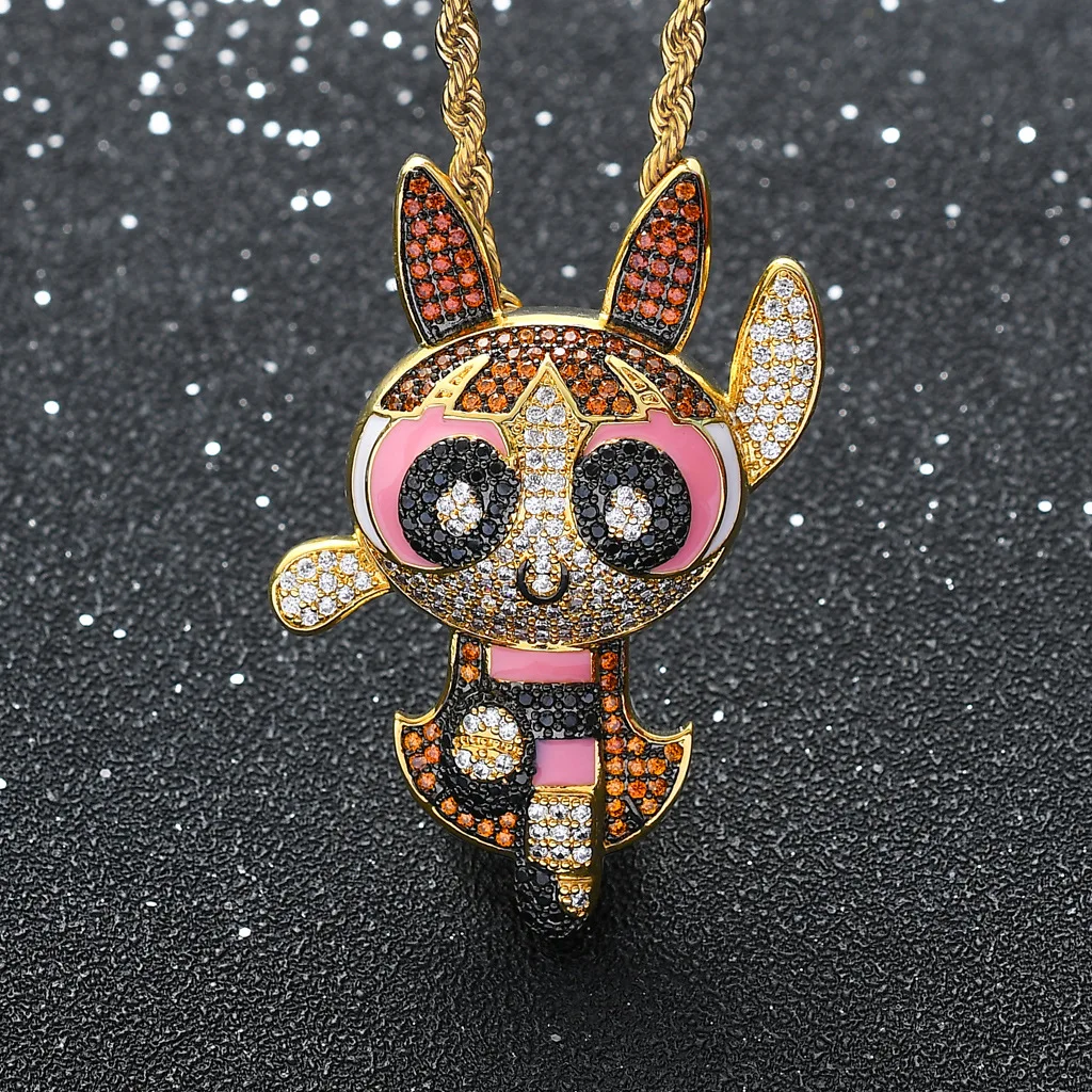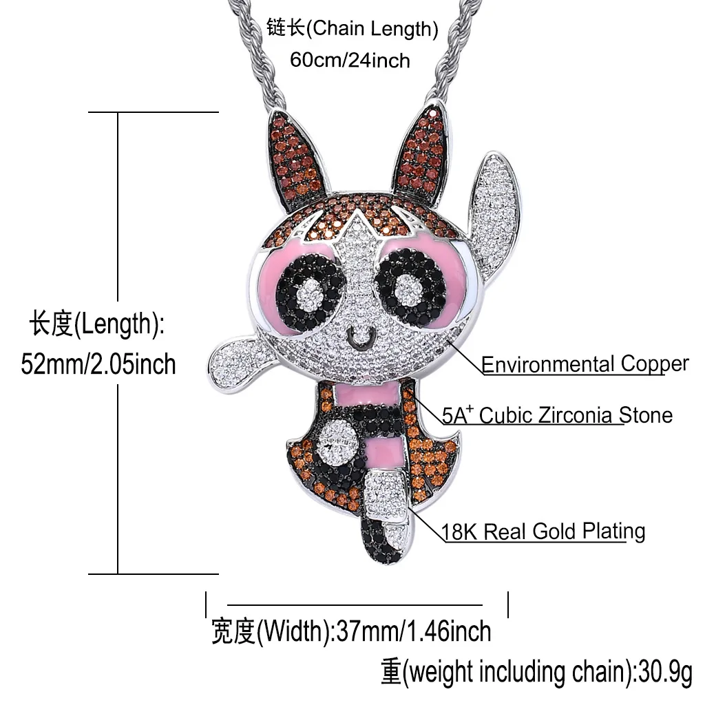 Freewear Powerpuff Girls Hiphop Jewelry Gold Micro Paved CZ Zircon Cartoon Character Blossom Pendant Necklace Iced Out Pendant