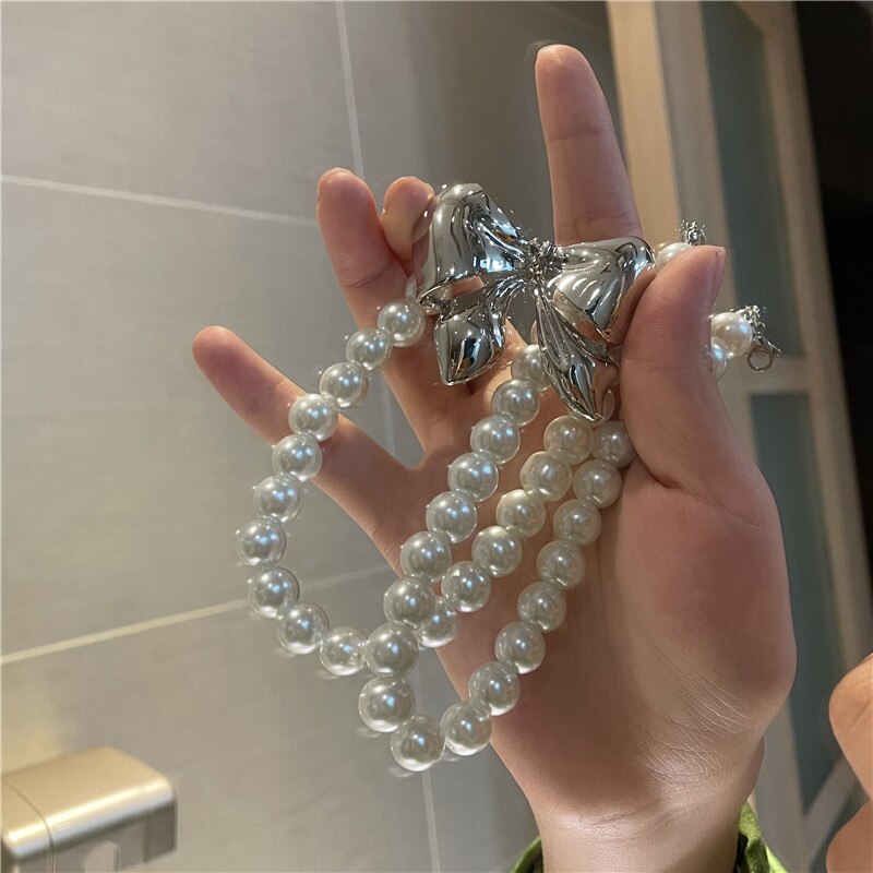 French Geometric Big Bow Pendant Pearl Necklace Female Niche Cold Wind Ins Personality Exaggerated Clavicle Chain Tide
