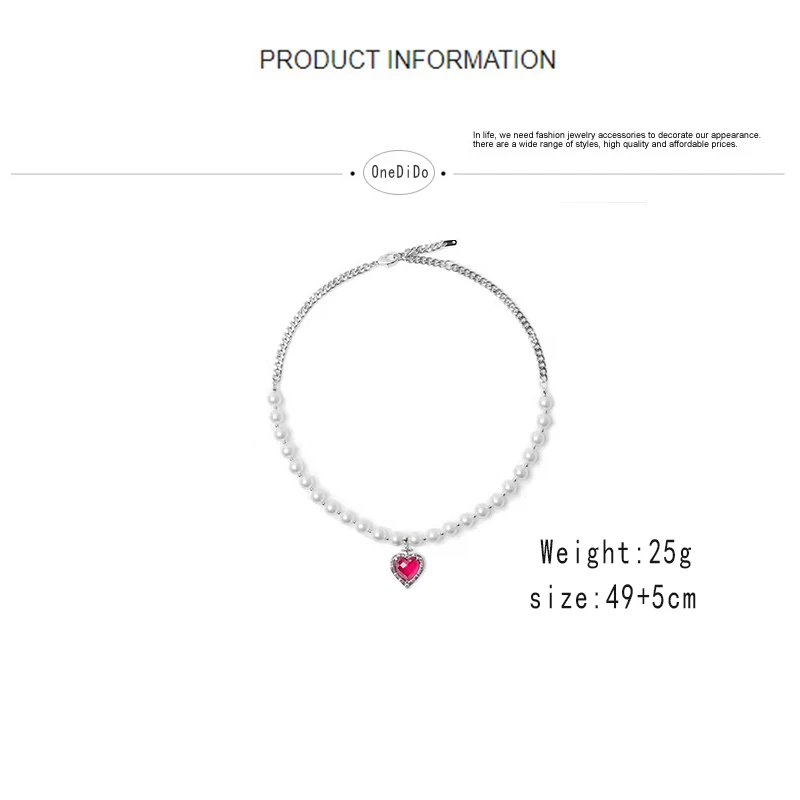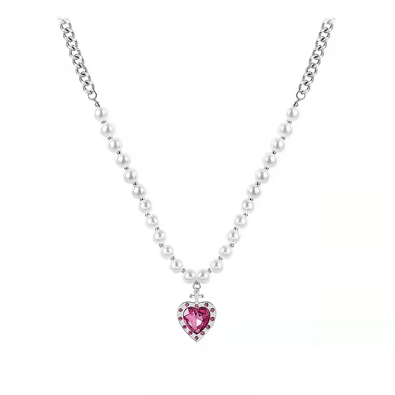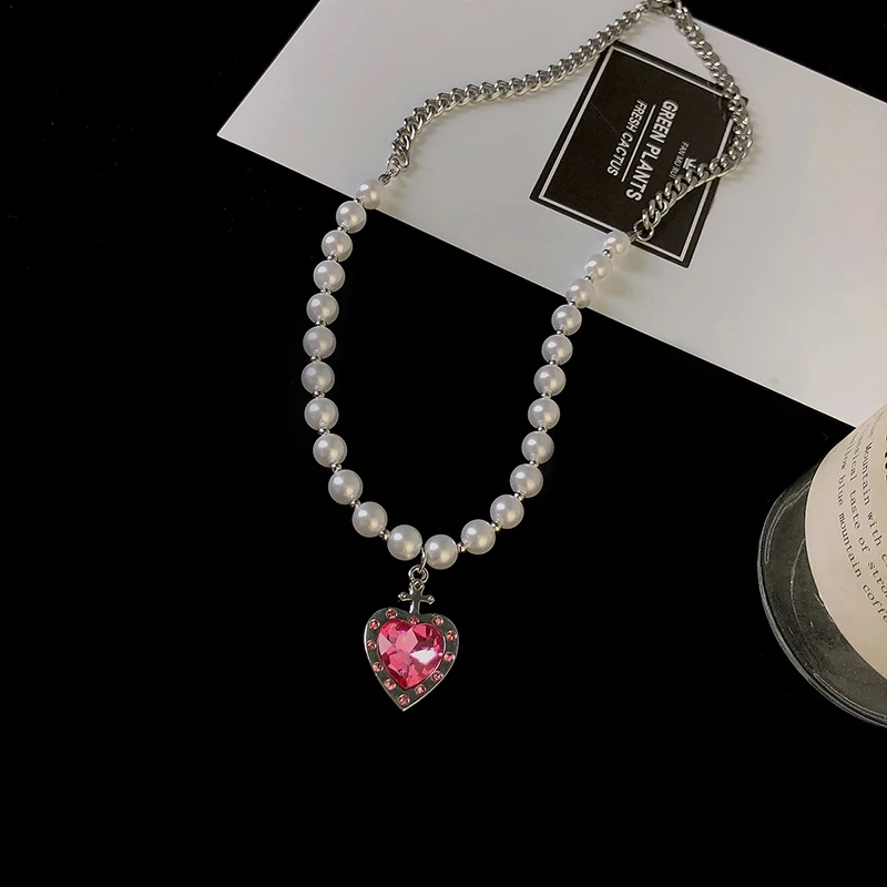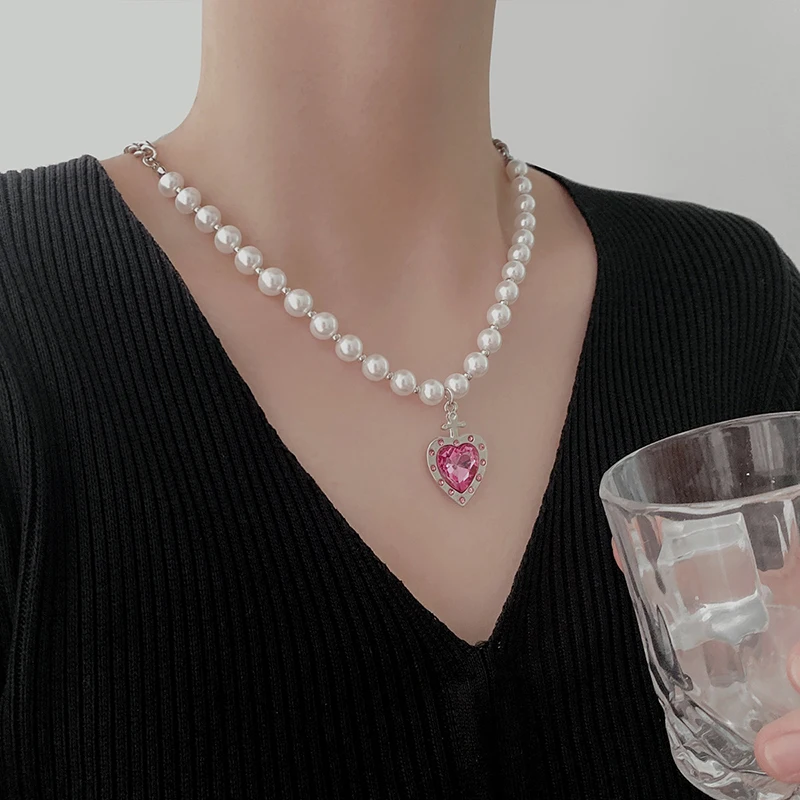 French Vintage Simple Light Pink Love Pendants Necklace For Women Pearl Stitching Heart Shaped Clavicle Chain Jewelry