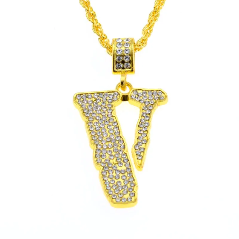 Full CZ Iced Out Bling Charm V Letter Men Necklace Hip Hop Chain Necklaces Pendants Punk Rock Jewelry Gift