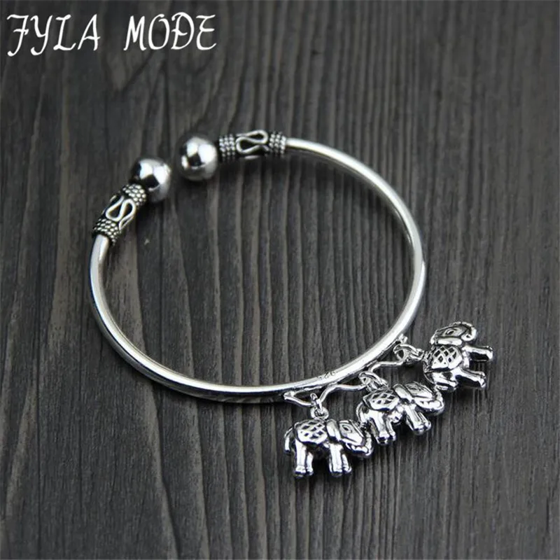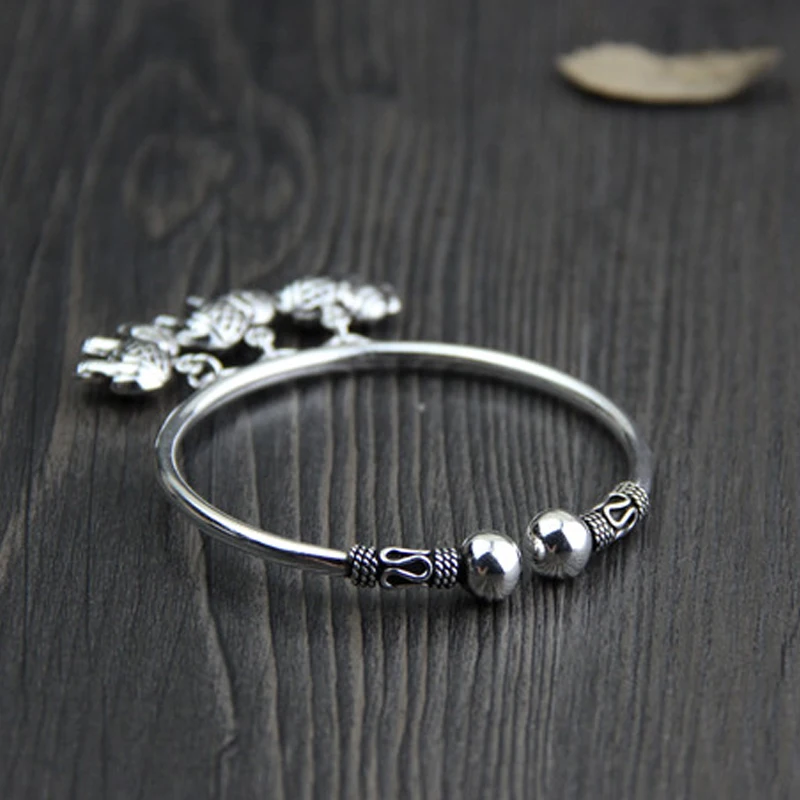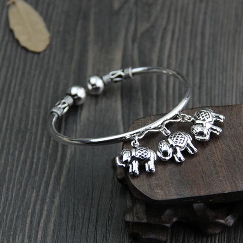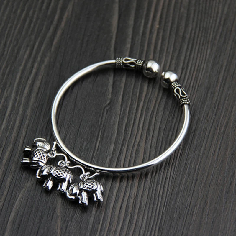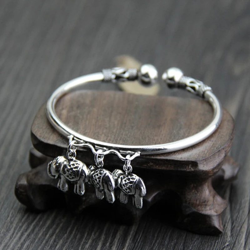 999 Sterling Silver Orinigal Design 3 Elephant Charms Handmade Thai Silver For Ladies Open Bangle Jewelry 3.15MM 14.50