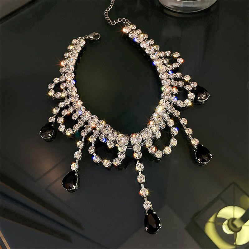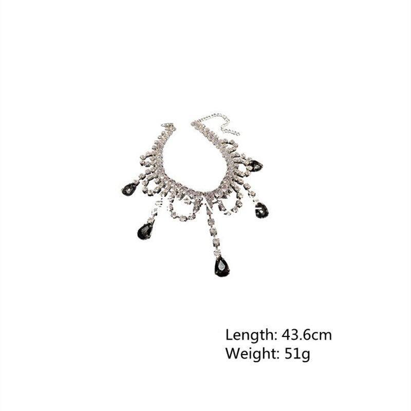 FYUAN Black Water Drop Crystal Choker Necklaces for Women Long Tassel Rhinestones Necklaces Statement Jewelry