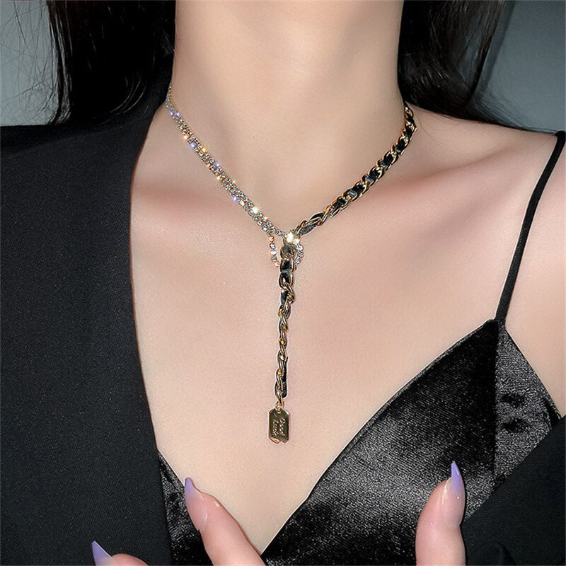 FYUAN Golden Chain Leather Choker Necklaces for Women Long Tassel Rhinestones Necklaces Statement Jewelry