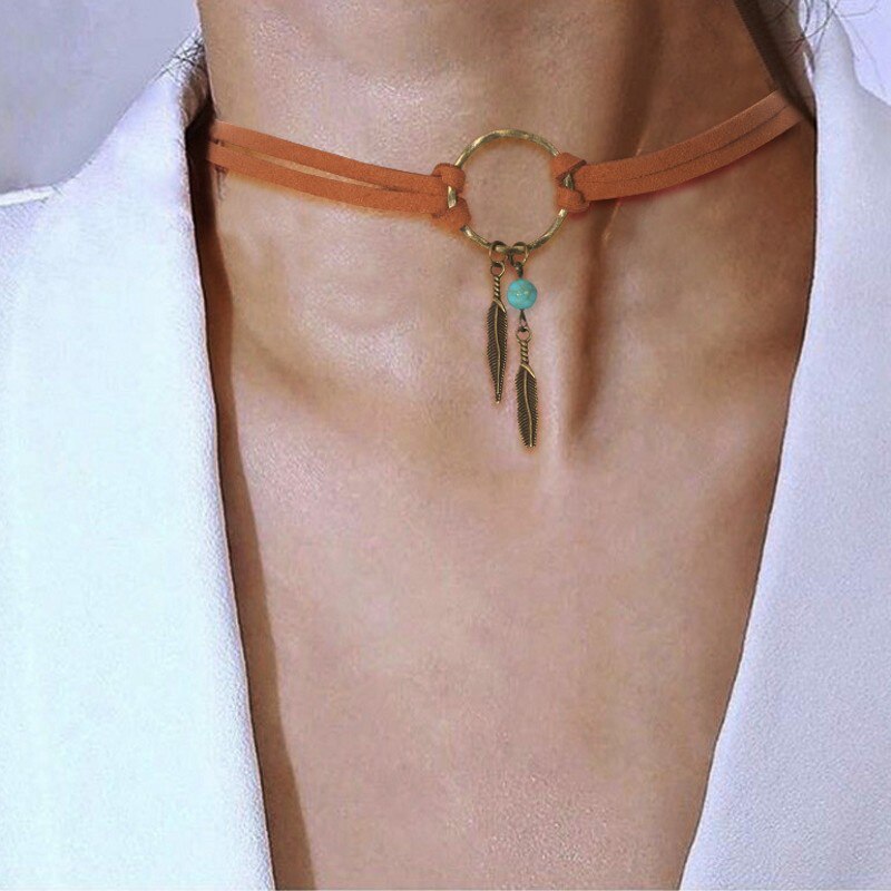 Gargantilla Bohemia para mujer, colgante de cuentas de plumas, collar de cadena de cuero marrón, regalo de fiesta, joyería