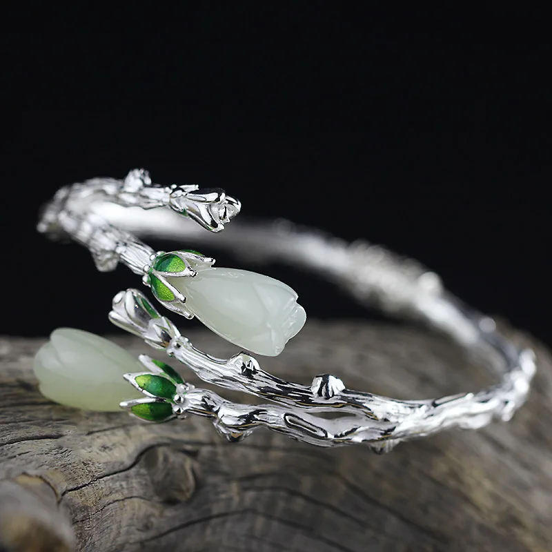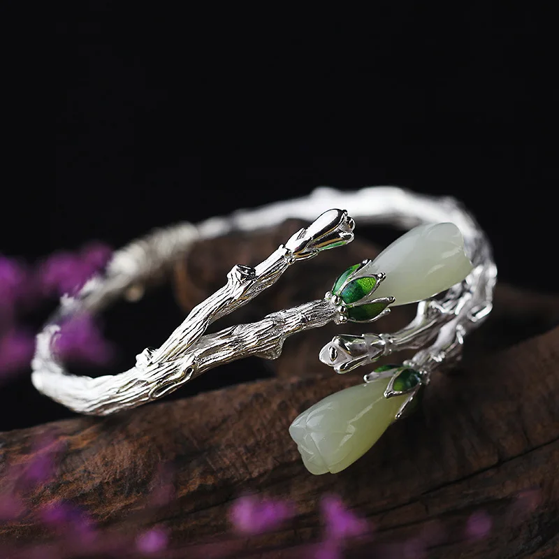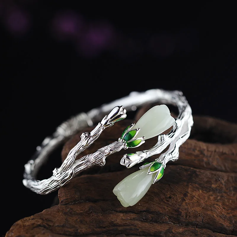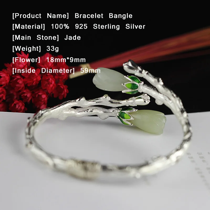 Gemstone Jewelry Natural Jade Flower Magnolia Fine Tree Branch Bangle For Women Mother's Gift 925 Sterling Silver Bracelet SB70