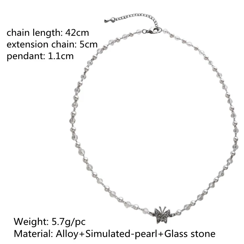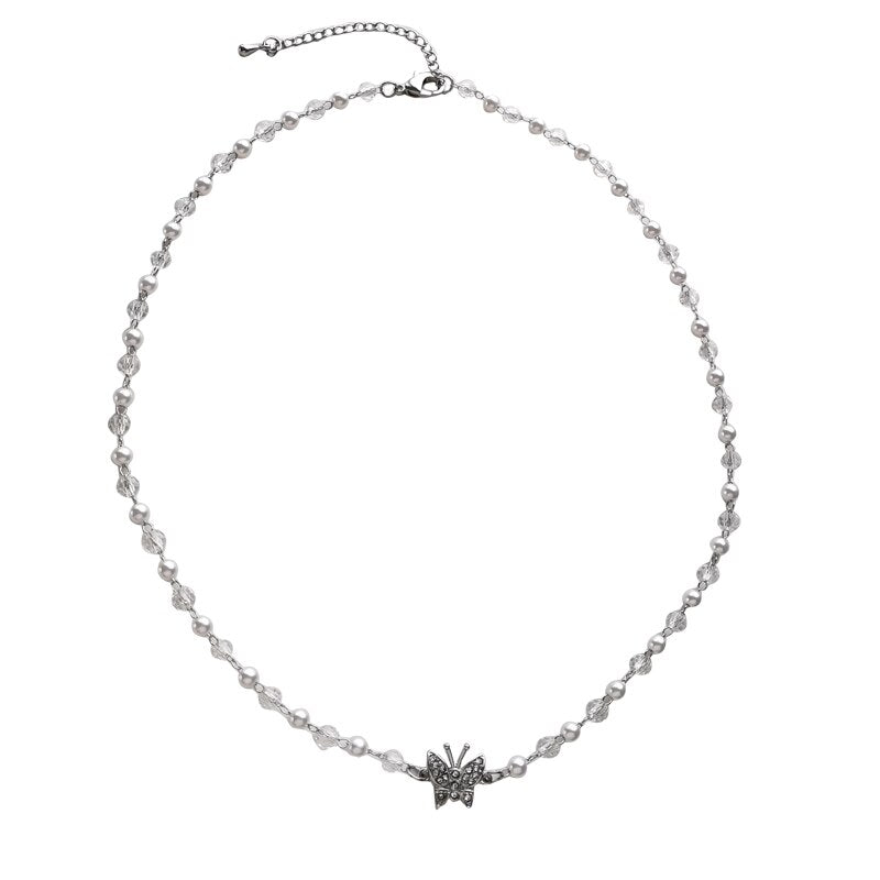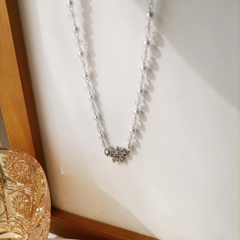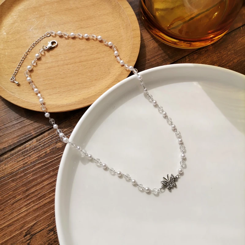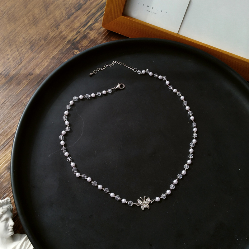 Girl's Pearl Bowknot Necklace with Sweet Retro Butterfly Chocker Jewelry 985
