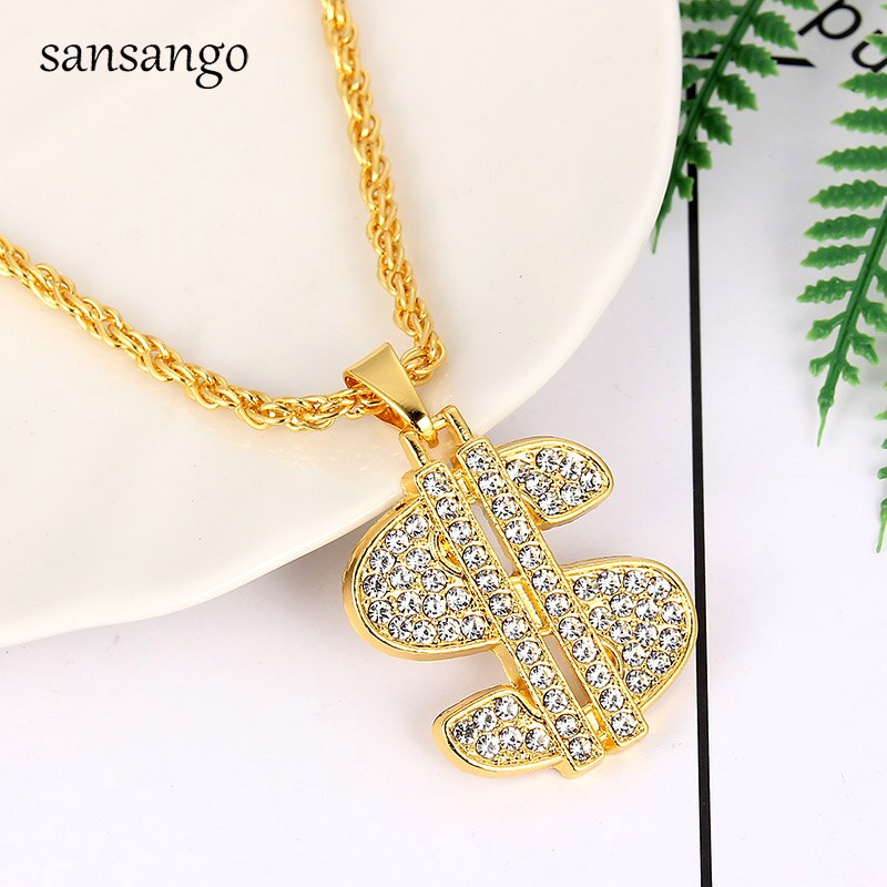 Gold Dollar Sign Shape Alloy Crystal Pendant Necklace Hip Hop Jewelry For Men Boy Birthday Party Gift Wedding Male Accessories