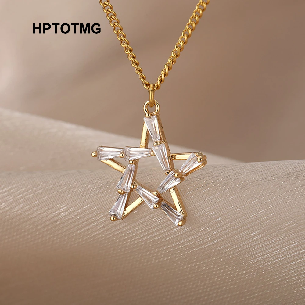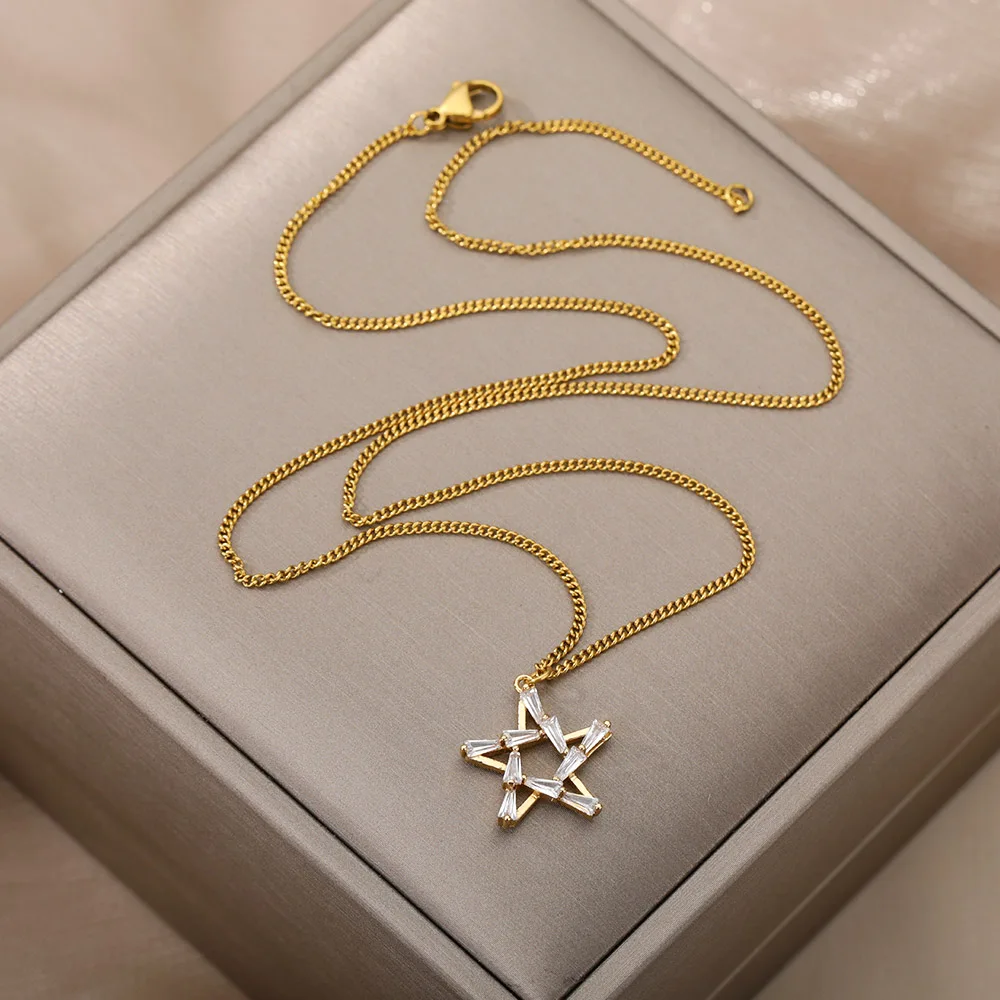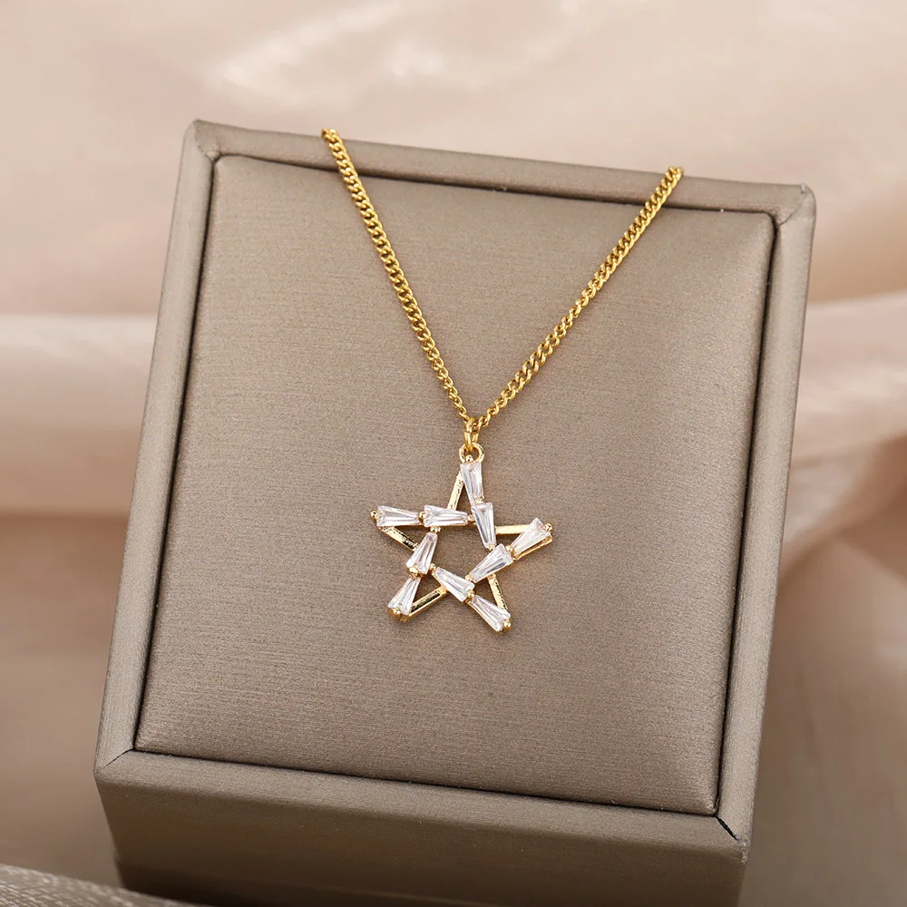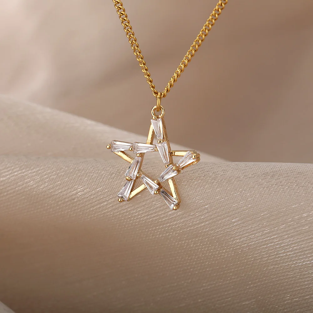 Goth Hollow Crystal Star Pendant Necklace for Women Gold Pentagram Choker Chain Necklace Stainless Steel Jewelry Christmas Gift