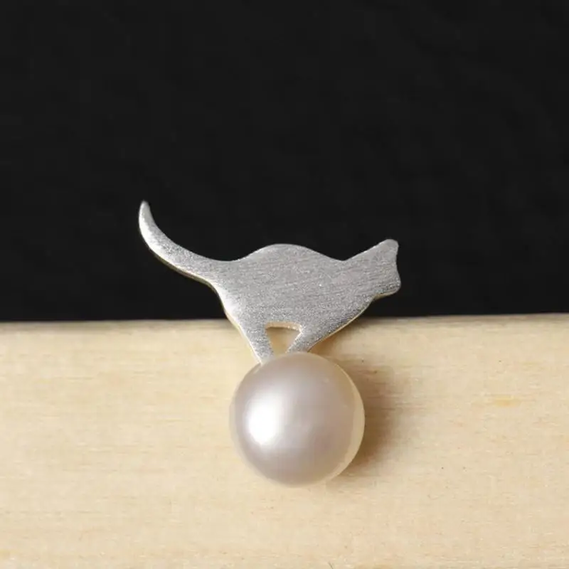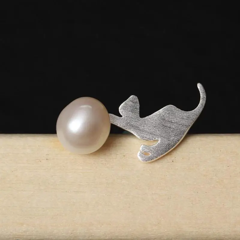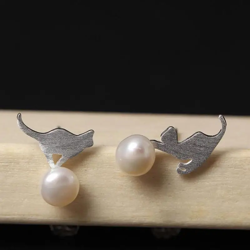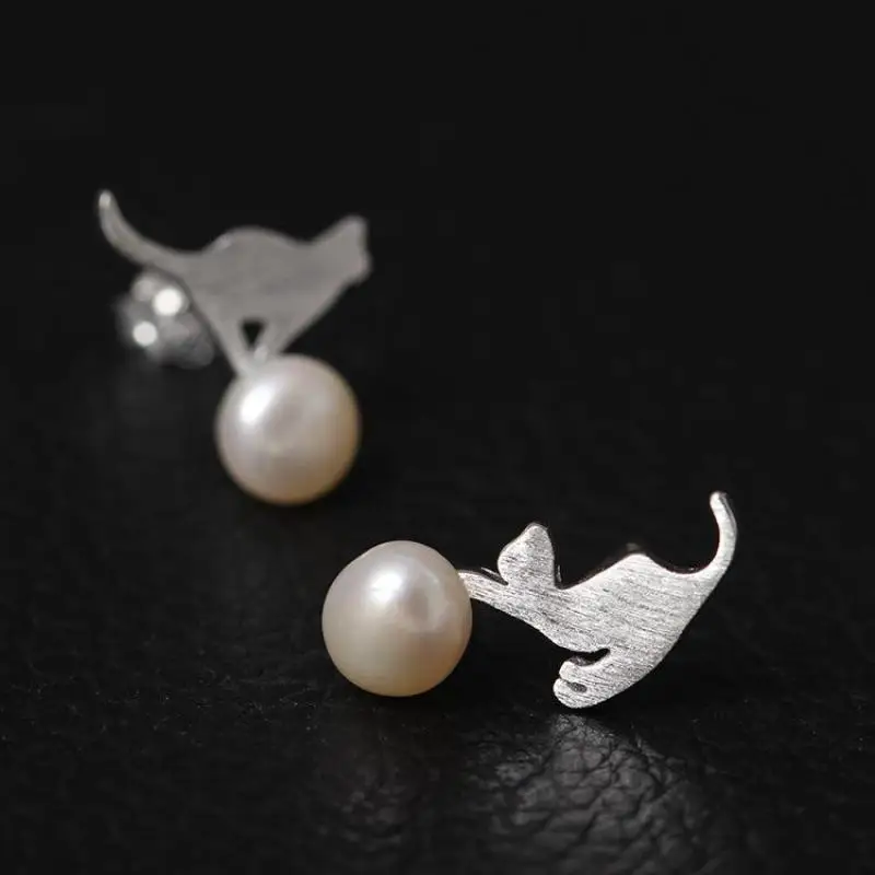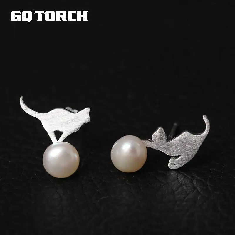 GQTORCH 925 Sterling Silver Personality Pearls Stud Earrings Cat Pl Ball Natural Pearls Jewelry For Women