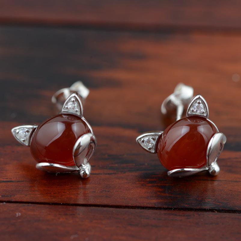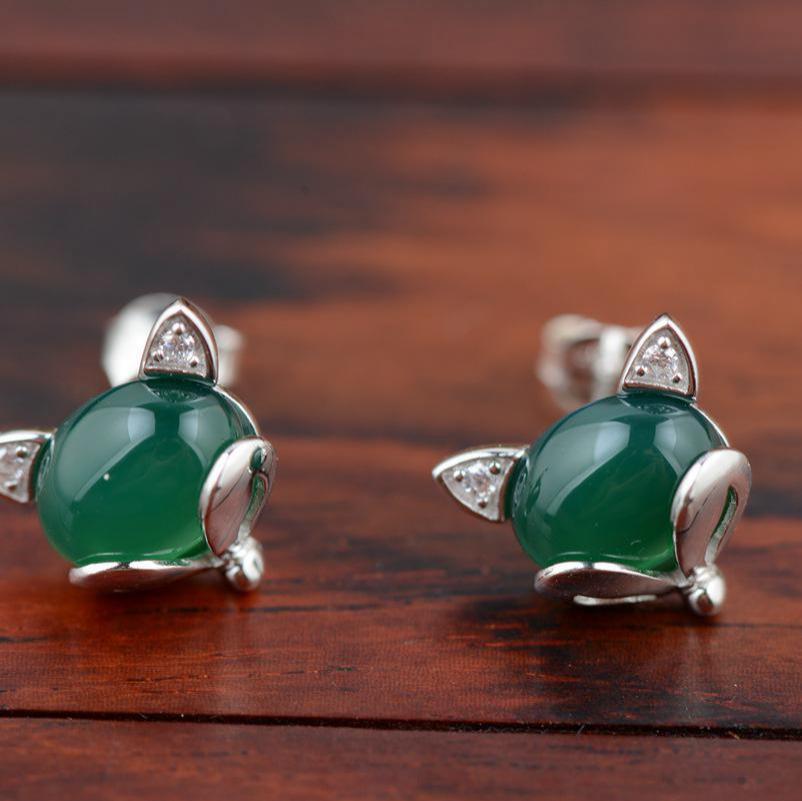 GQTORCH 925 Sterling Silver Stud Earrings For Women Fox Head With Black Red Green Agate Natural Stone Oorbellen Voor Vrouwen