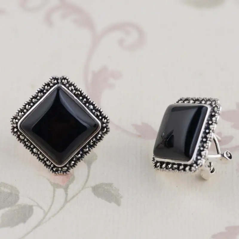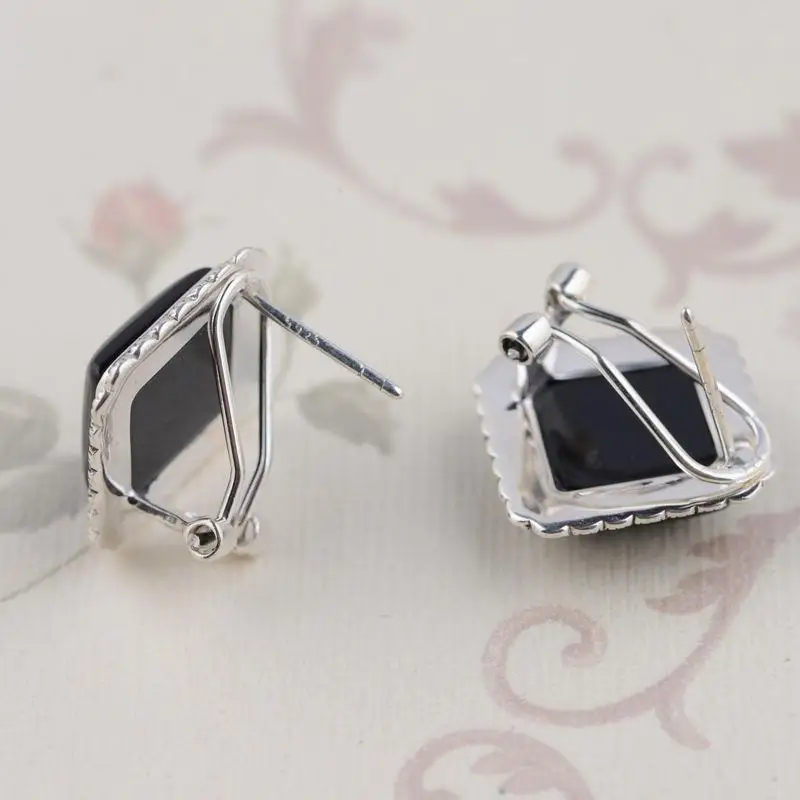 GQTORCH 925 Sterling Silver Vintage Earrings Square Shaped Inlaid Black Onyx Natural Stone Earrings 2020 High Quality Jewelry