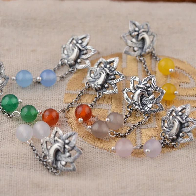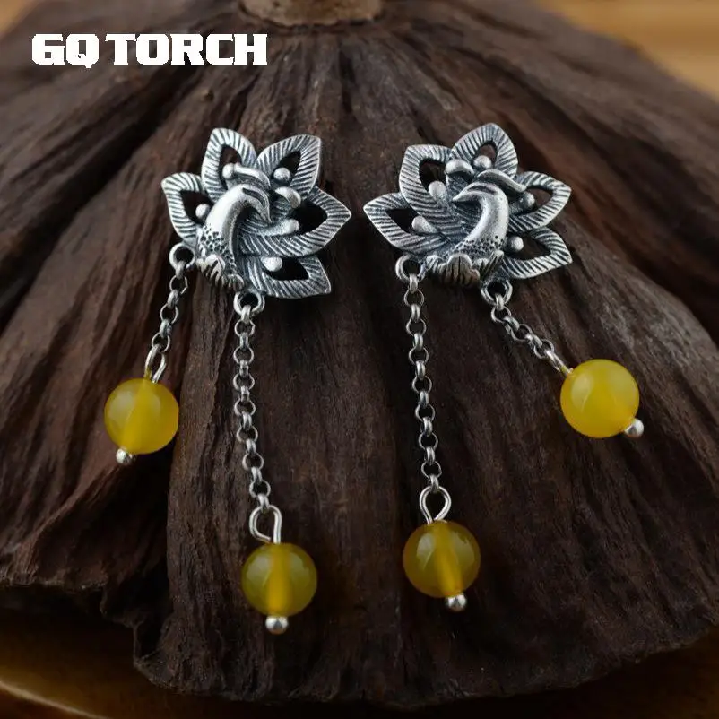 GQTORCH 990 Sterling Silver Earrings Phoenix & Peony Flower Carved With Multi Color Chalcedony Malachite Natural Stone Earrings