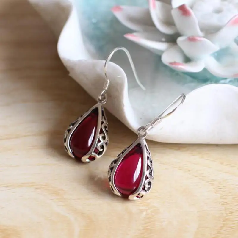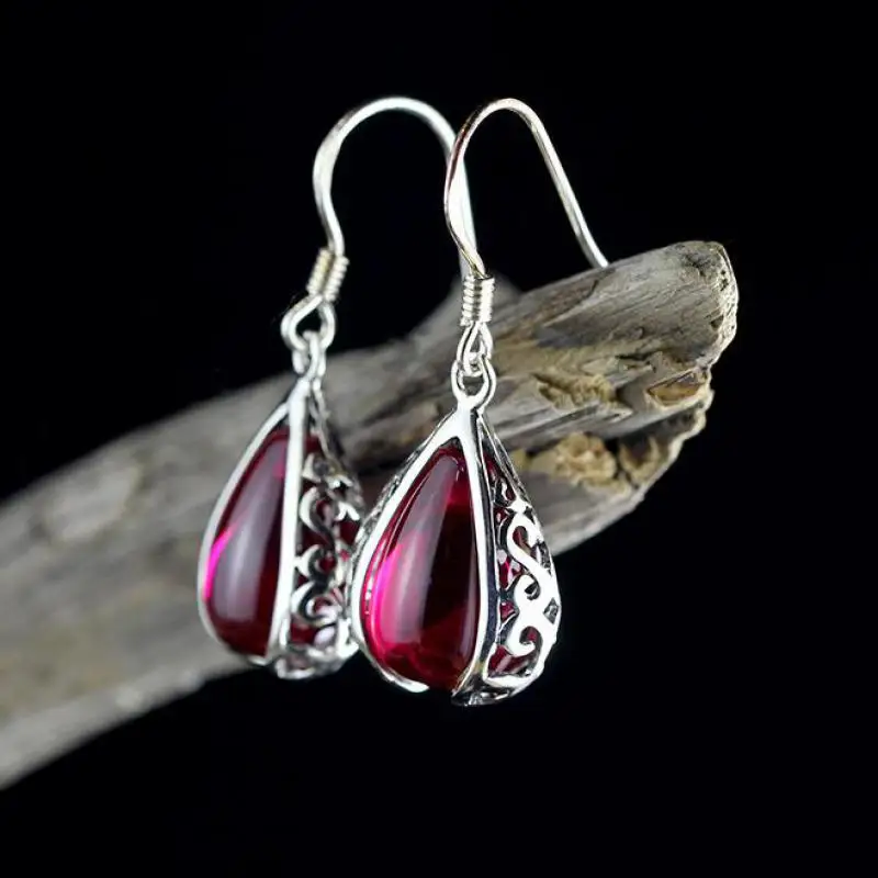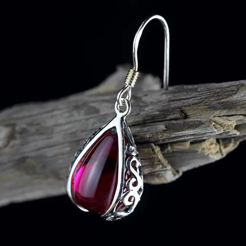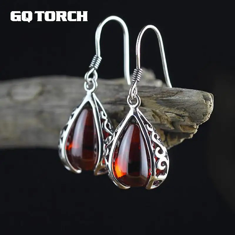 GQTORCH Vintage Ruby Jewelry 925 Sterling Silver Drop Earrings Hooks Hollow Flower Deisgn Natural Gemstone Brincos 2020