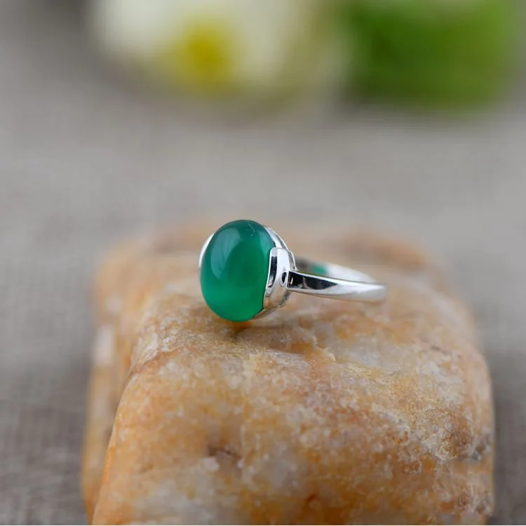 Green Natural Round Agate 925 Sterling Silver Ring