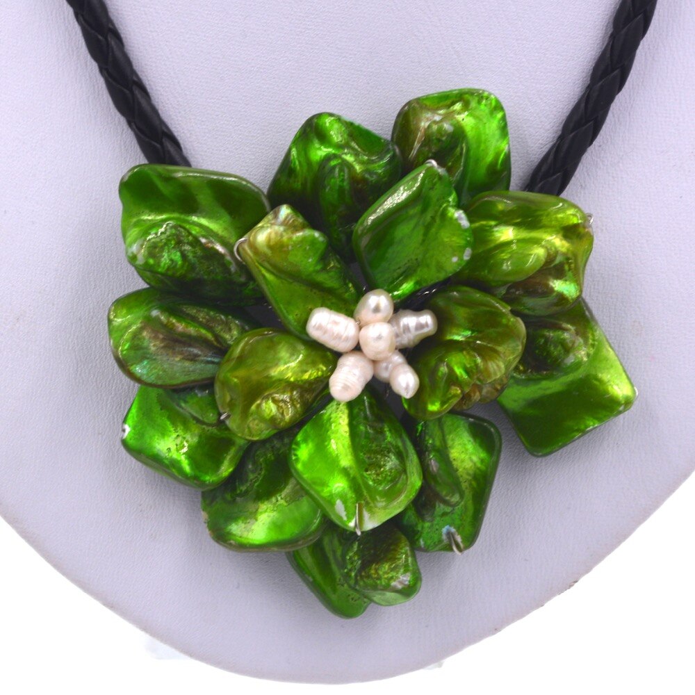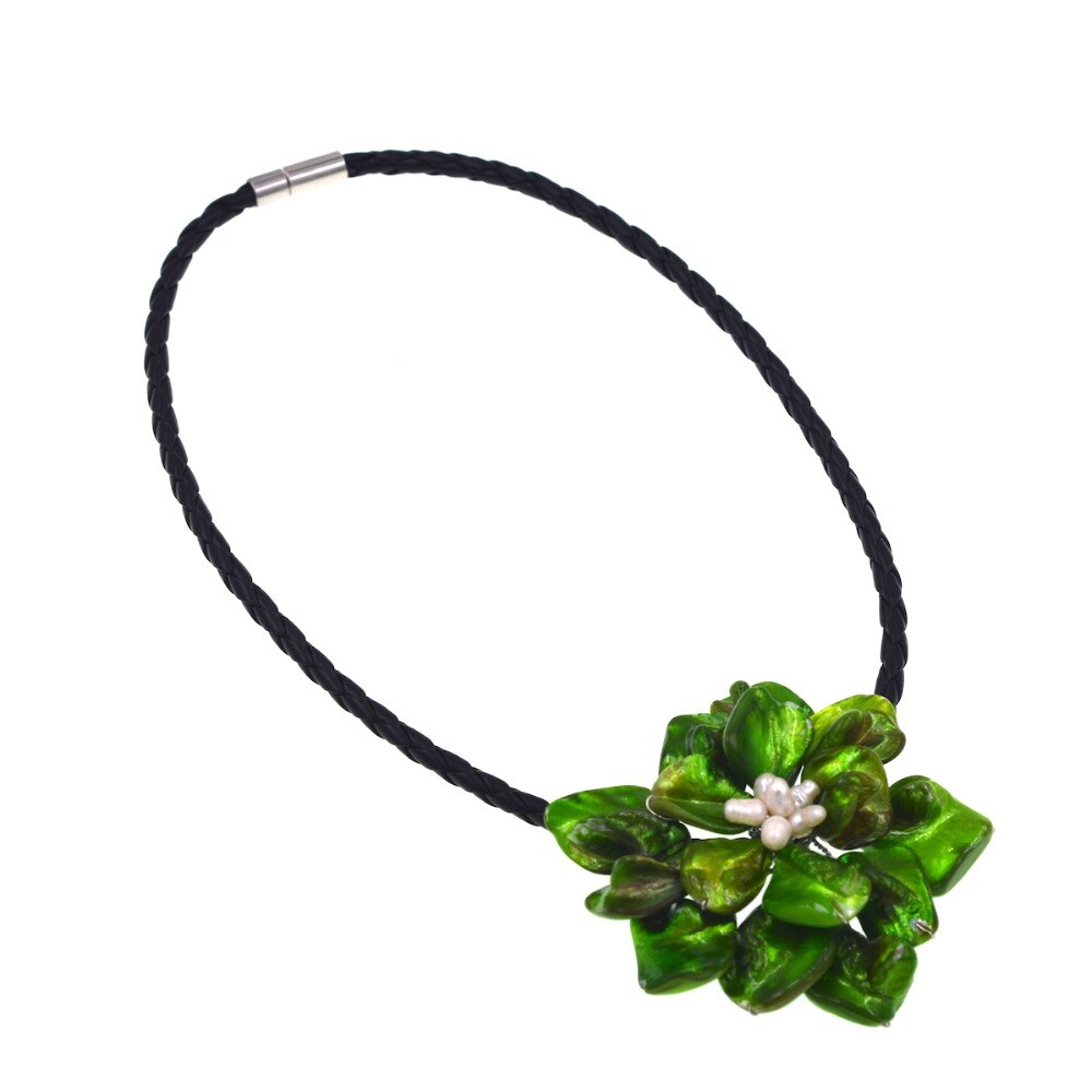 Handmade Jewelry Natural white freshwater pearl green baroque shell flower necklace