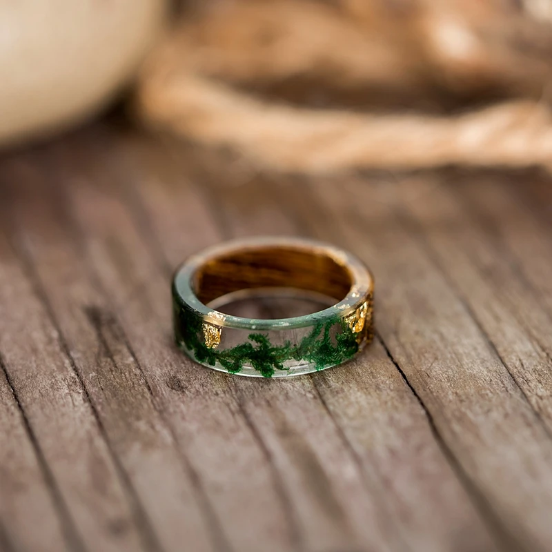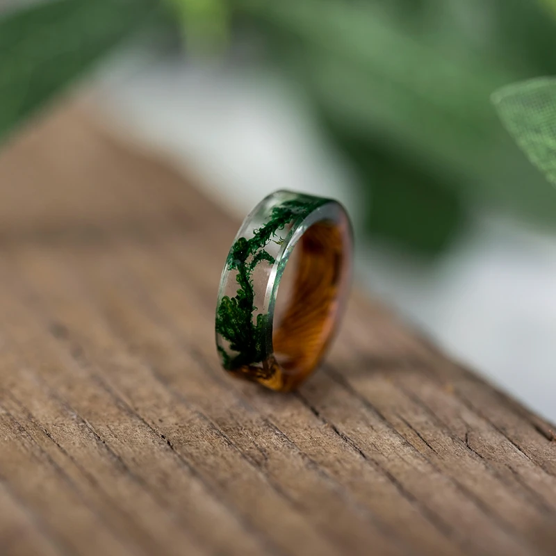 Handmade Wood and Resin Rings Green Moss Transparent Rings for Women Men Vintage Jewelry Bague Femme Best Gifts