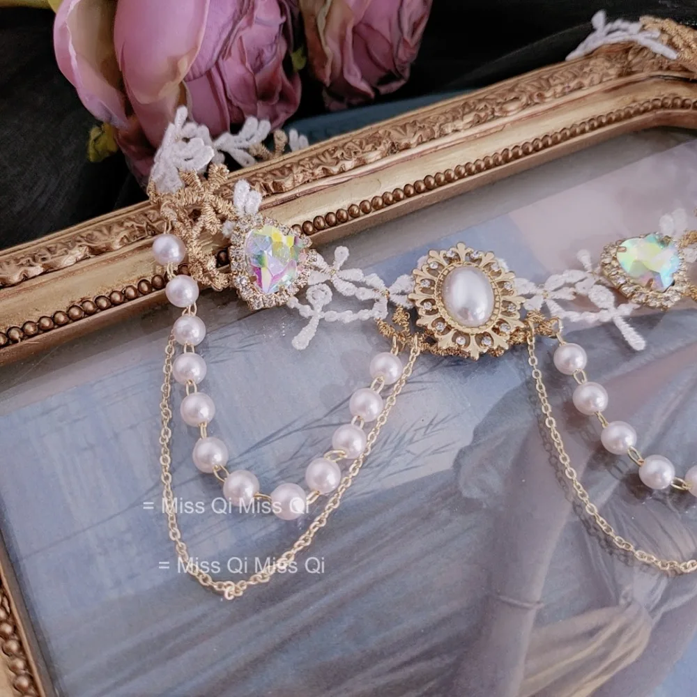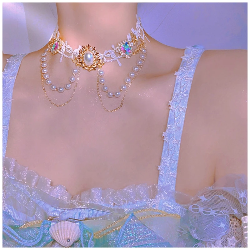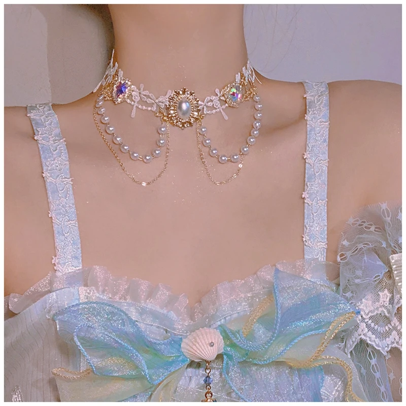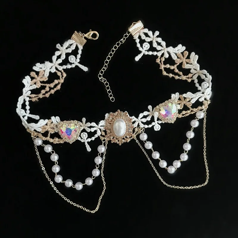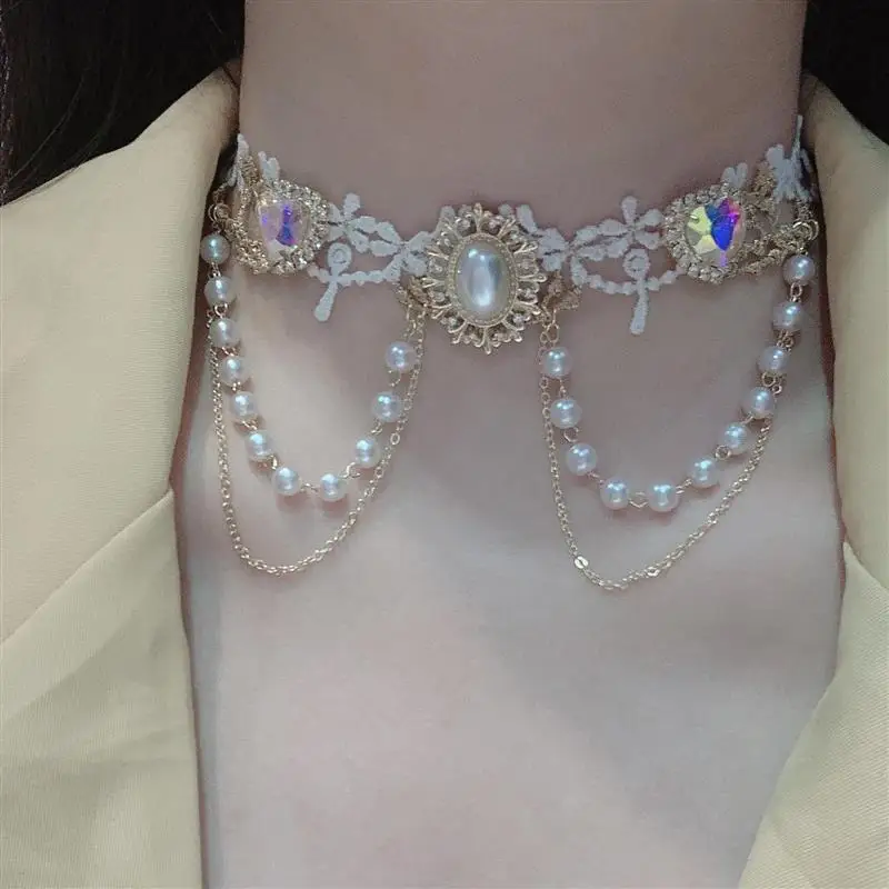 HangZhi 2021 Baroque Lolita Pearl White Lace Heart Rhinestones Double Layer Tassel Choker Necklace for Women Girls Jewelry